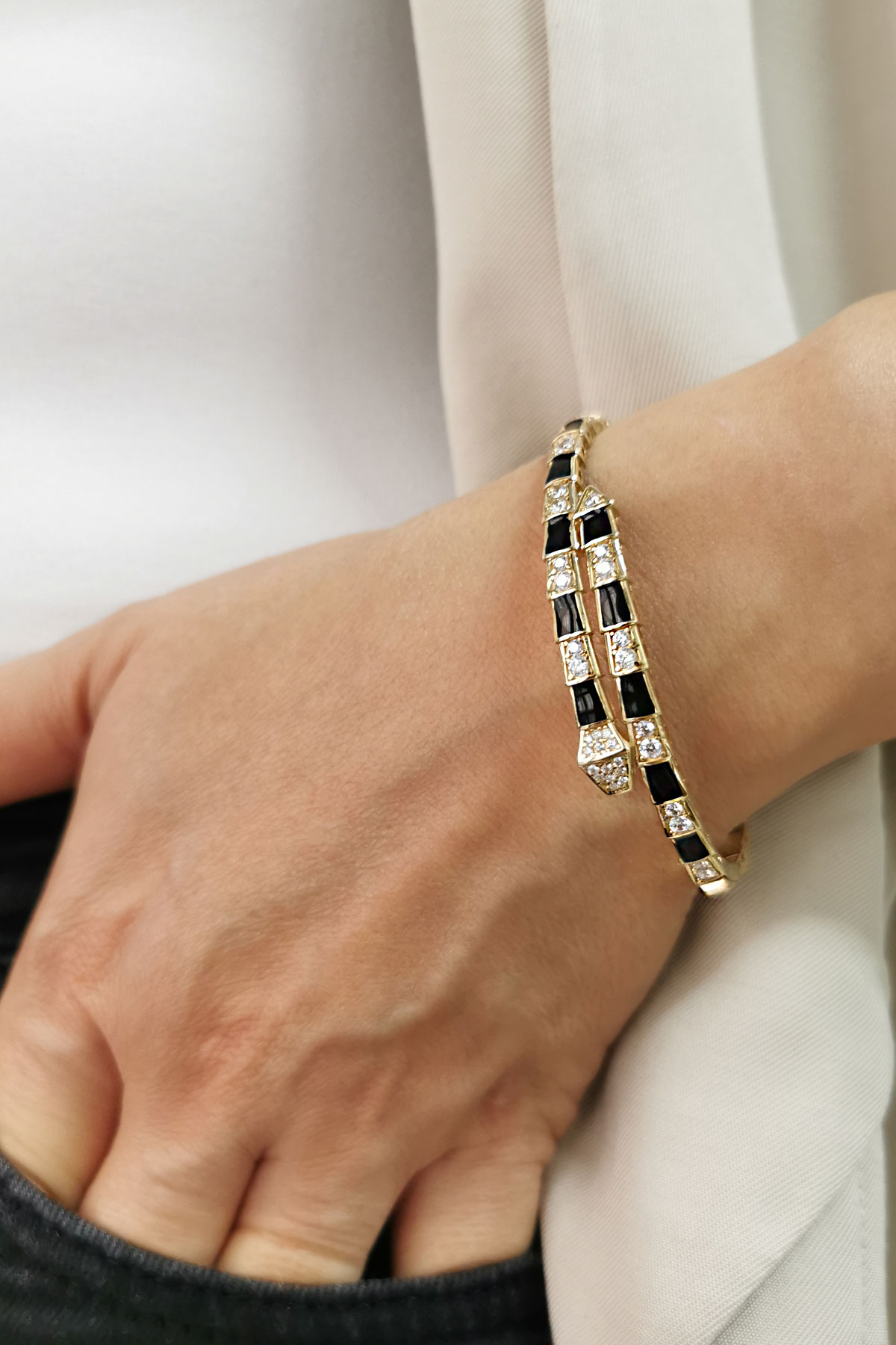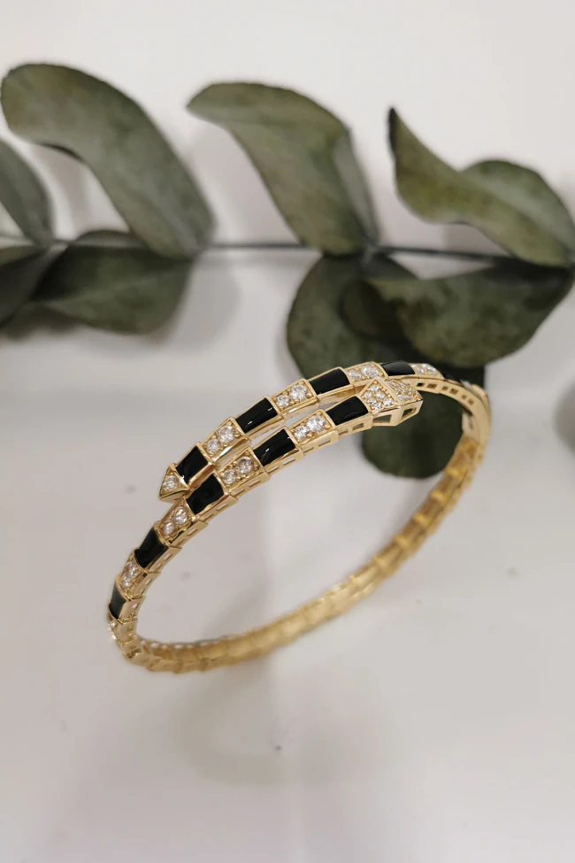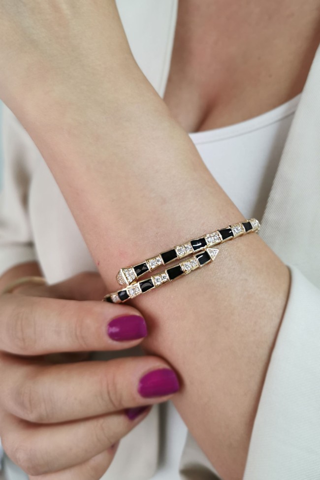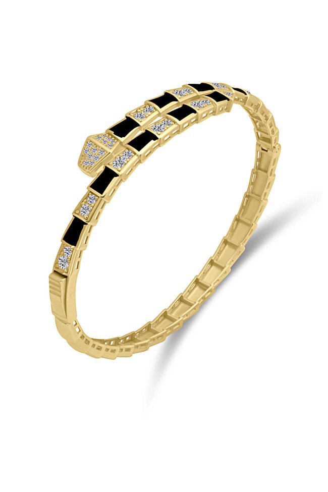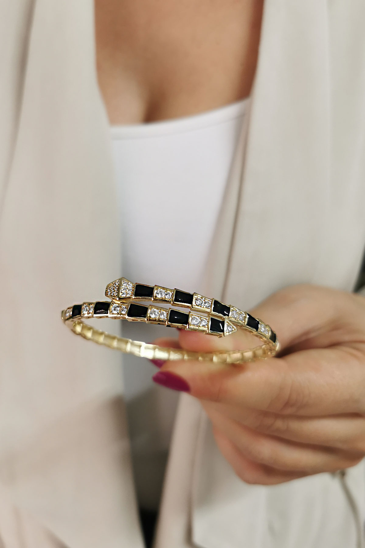14 Ayar gösterişli ve şık tasarımı ile modern ışıl ışıl duruşa da sahip günlük kullanıma uygun 14.00 gram ağırlığında siyah mine detaylı model altın kadın bilezik.