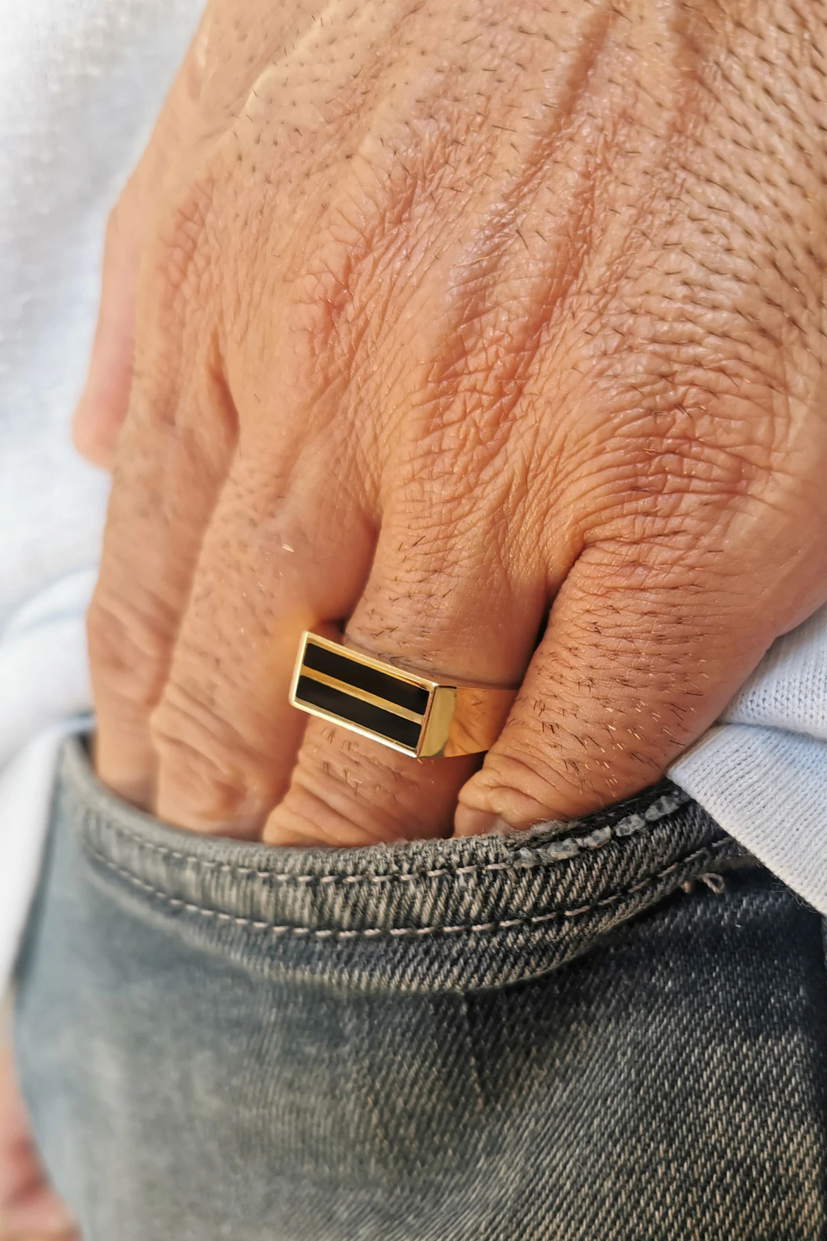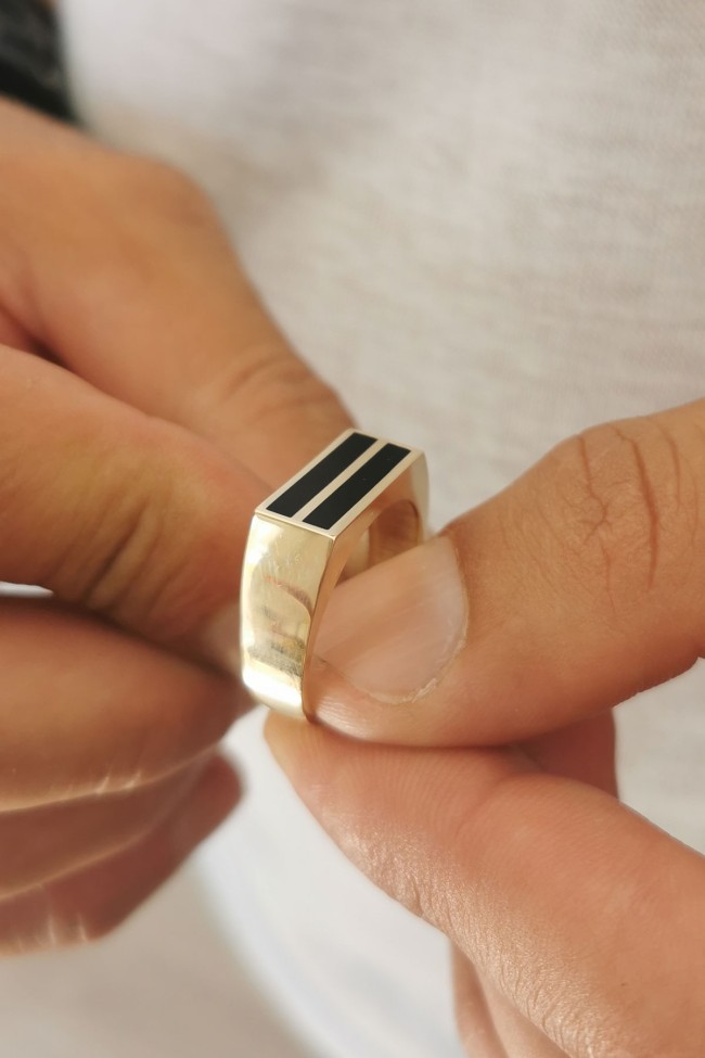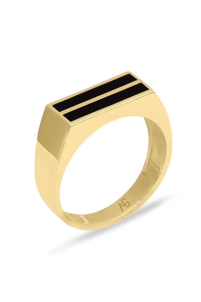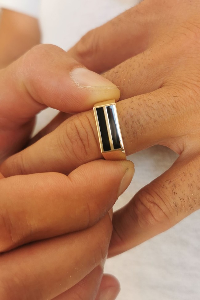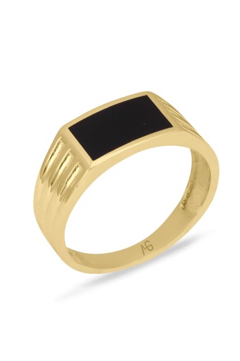 5.30 Gr Ağırlığında sarı altın sade bir modele sahip siyah mine detaylı14 ayar altın erkek yüzük.