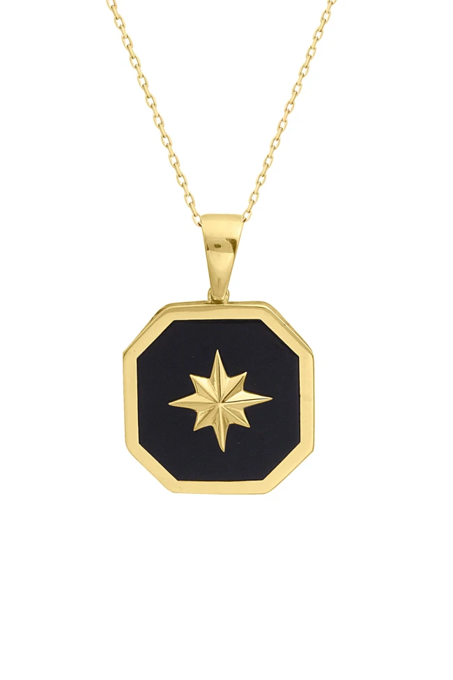 Modern Tarzıyla Günlük Takabileceğiniz Unisex Olarak (Kadın&Erkek) Kullanıma Uygun 2.8 Cm Boyunda 7.10 Gr. Ağırlığında 14 Ayar Altın Siyah Mineli Kuzey Yıldızı Kolye.