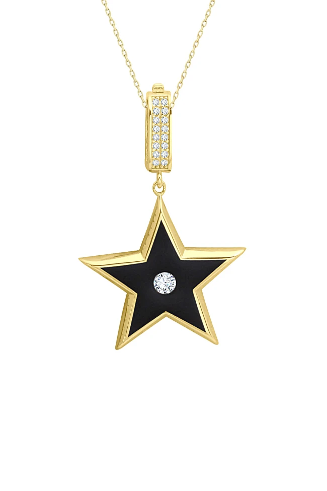14 Ayar altın 5.30 gram ağırlığında şık ve gündelik kullanıma uygun taş detaylı siyah mineli 3 cm boyunda yıldız altın kolye.