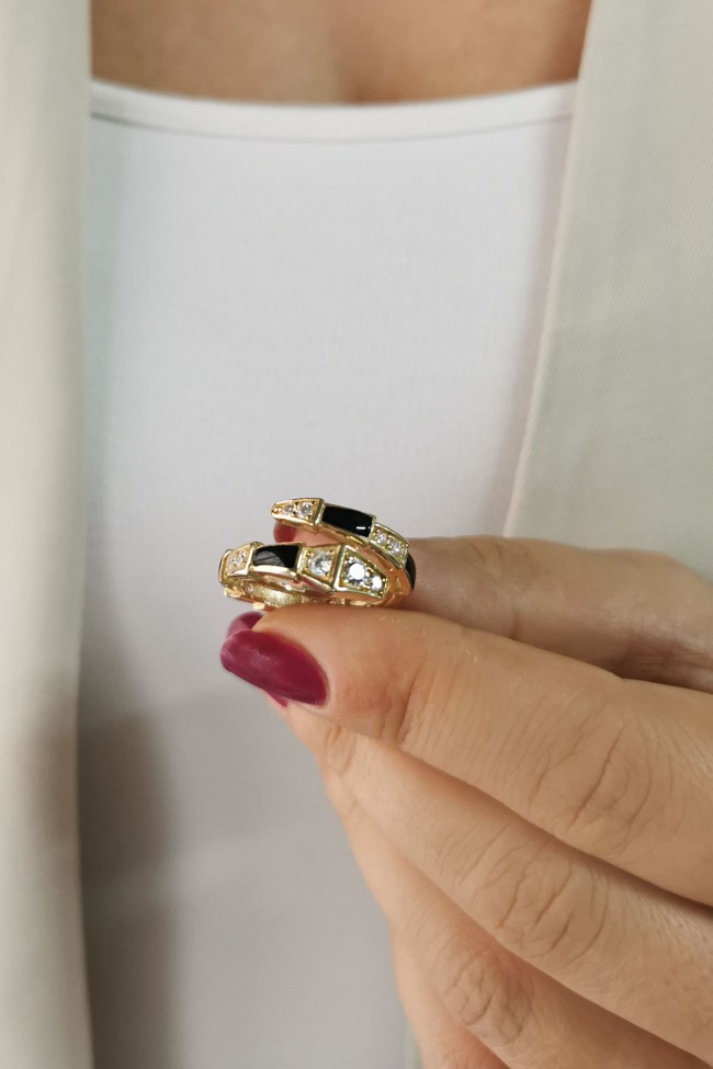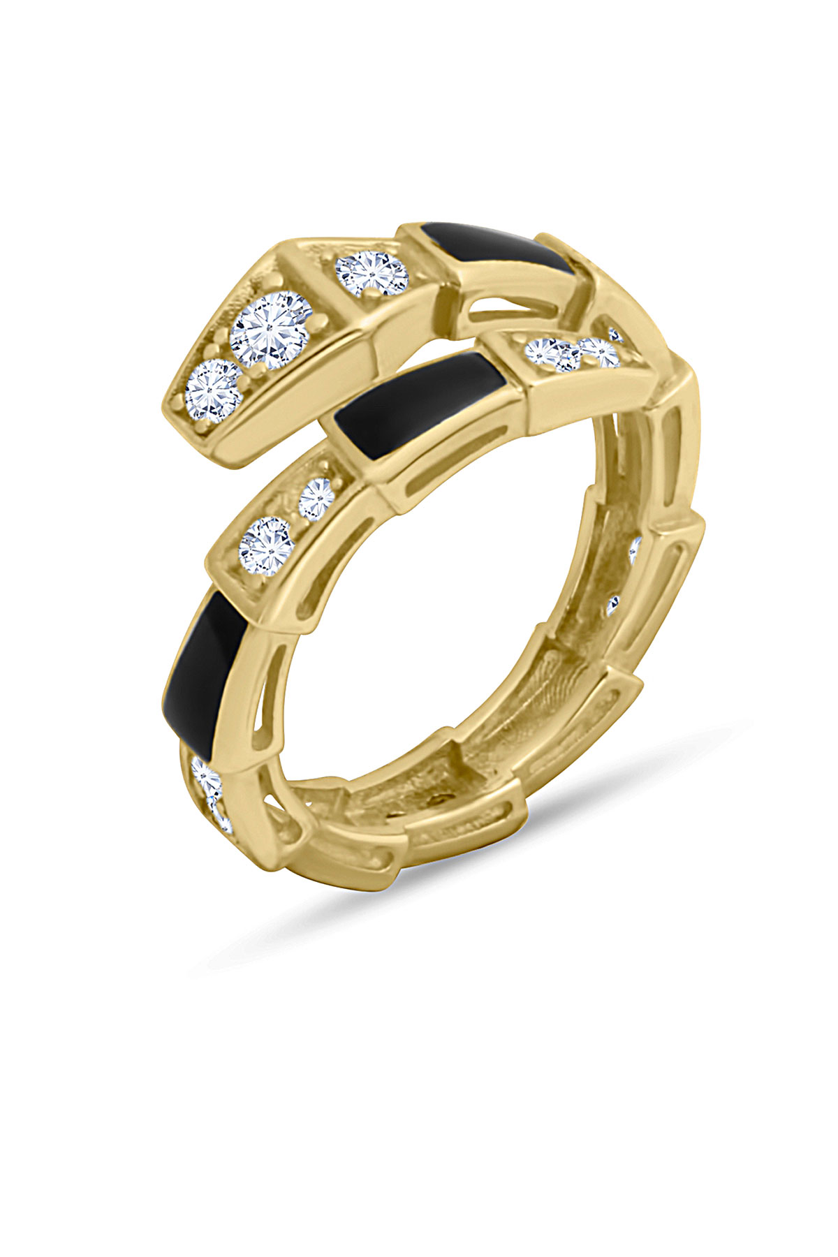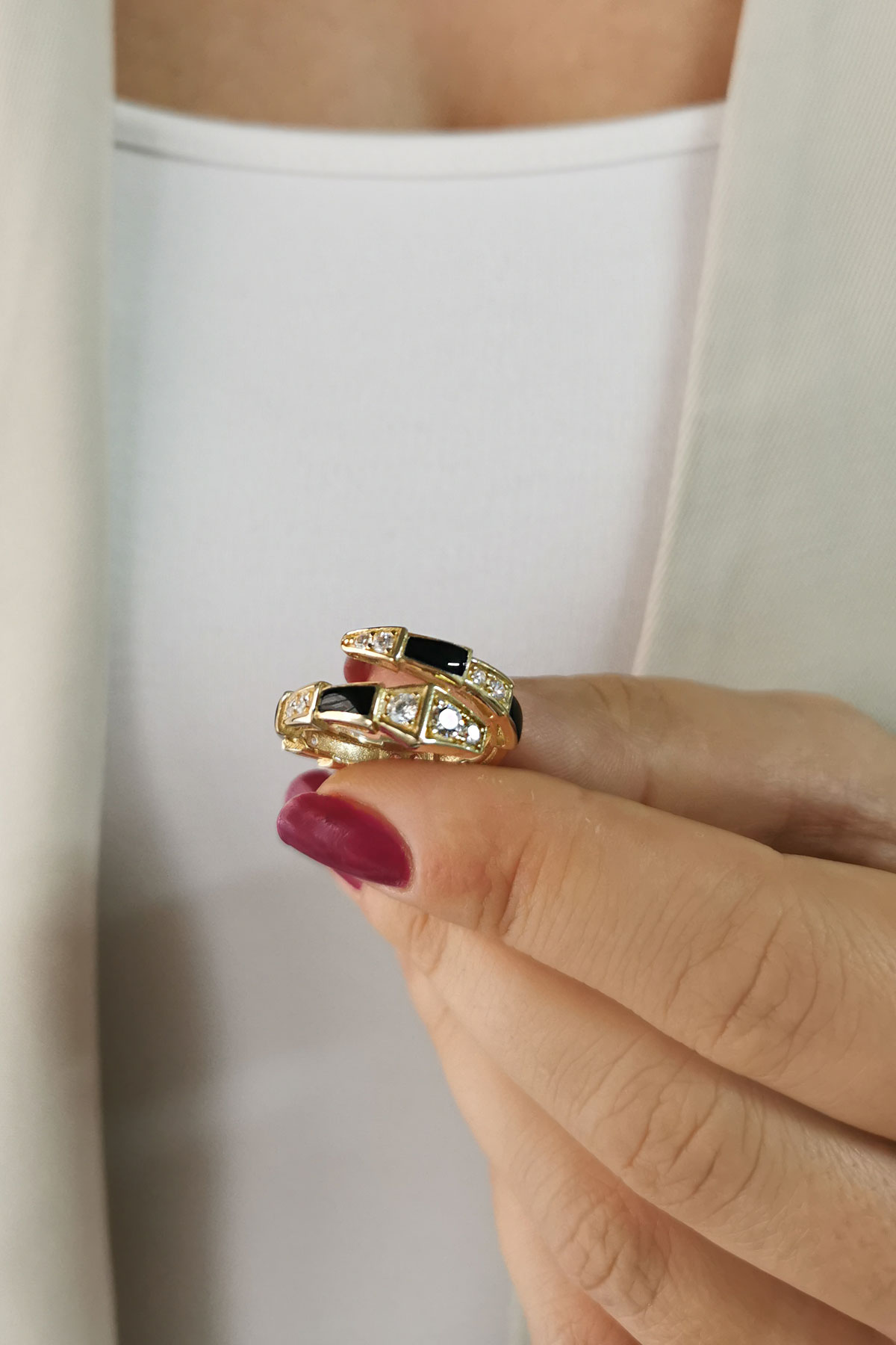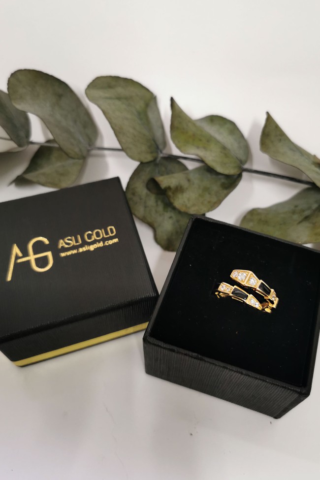 14 Ayar gösterişli ve şık tasarımı ile spor duruşa da sahip günlük kullanıma uygun 4.60 gram ağırlığında siyah mineli yılan model altın yüzük.
