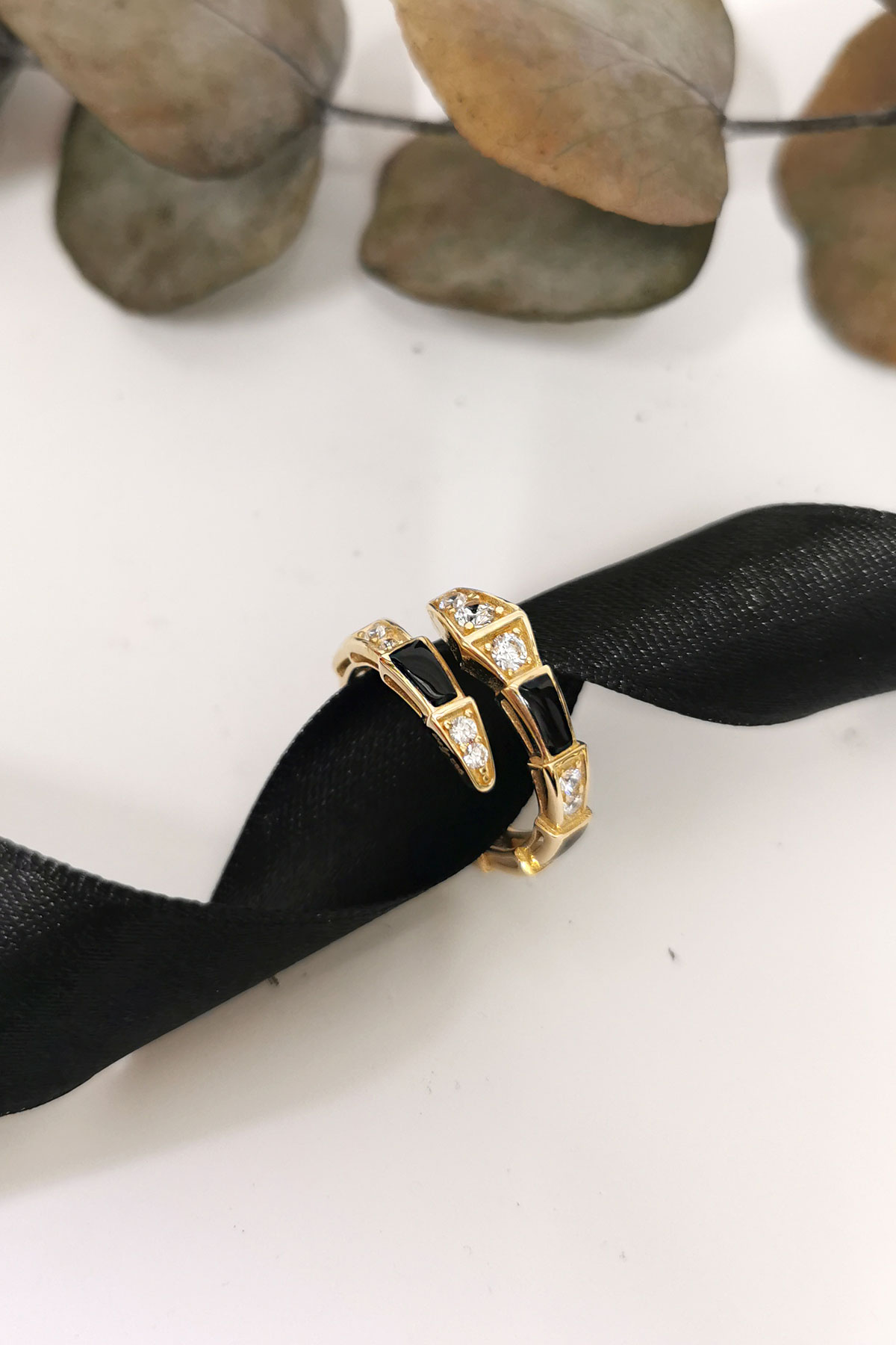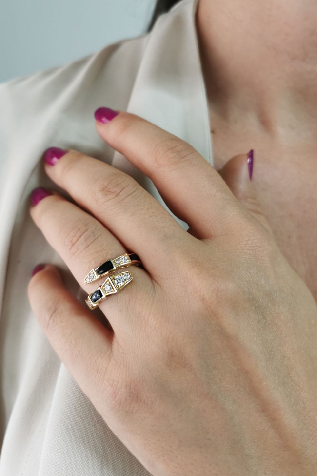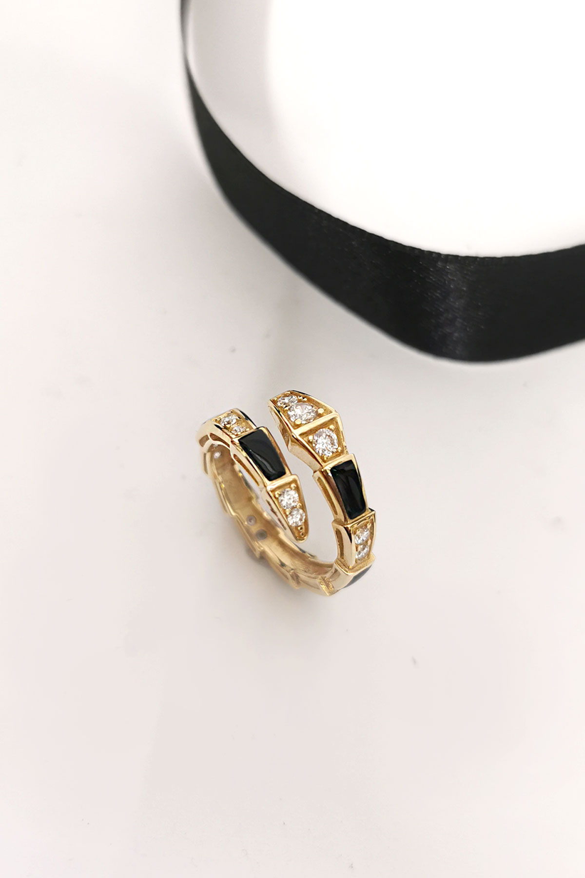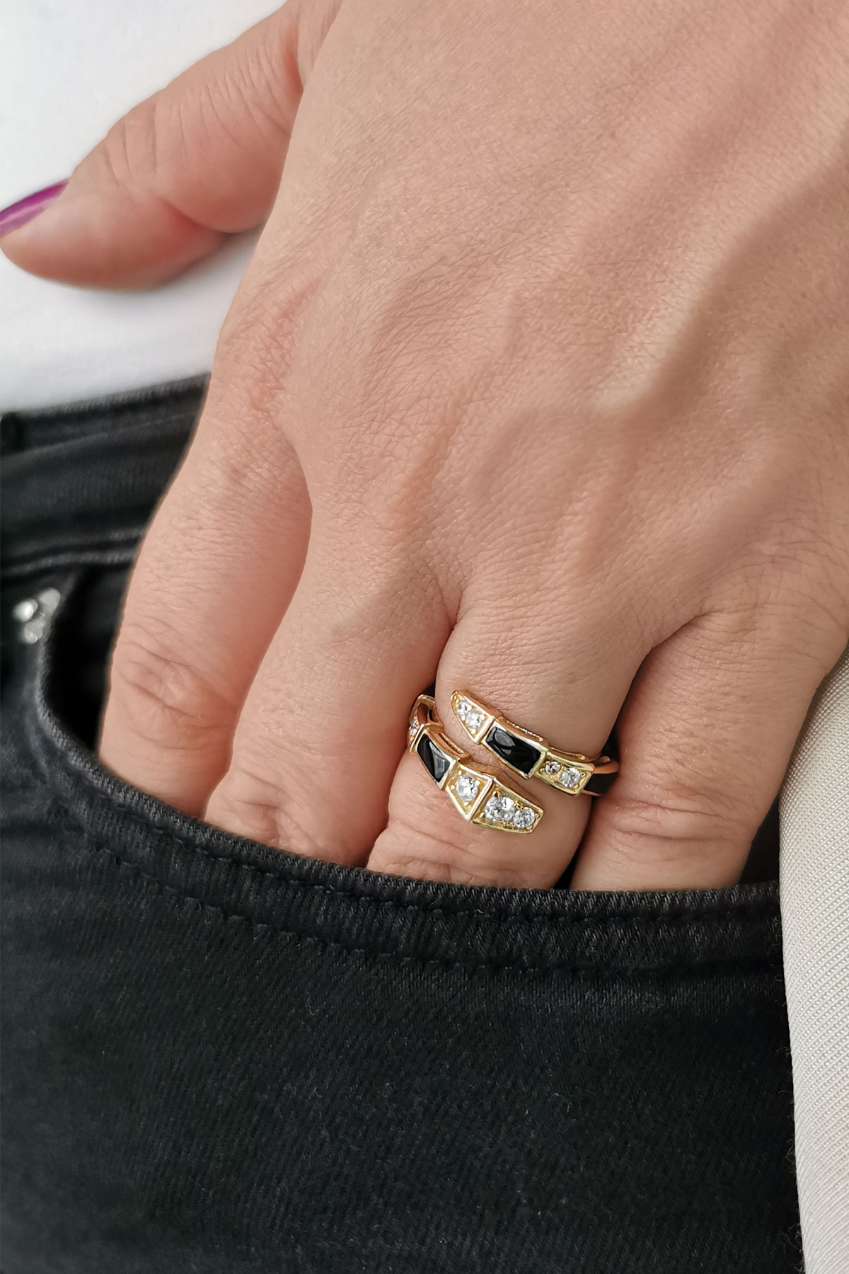 14 Ayar gösterişli ve şık tasarımı ile spor duruşa da sahip günlük kullanıma uygun 4.60 gram ağırlığında siyah mineli yılan model altın yüzük.