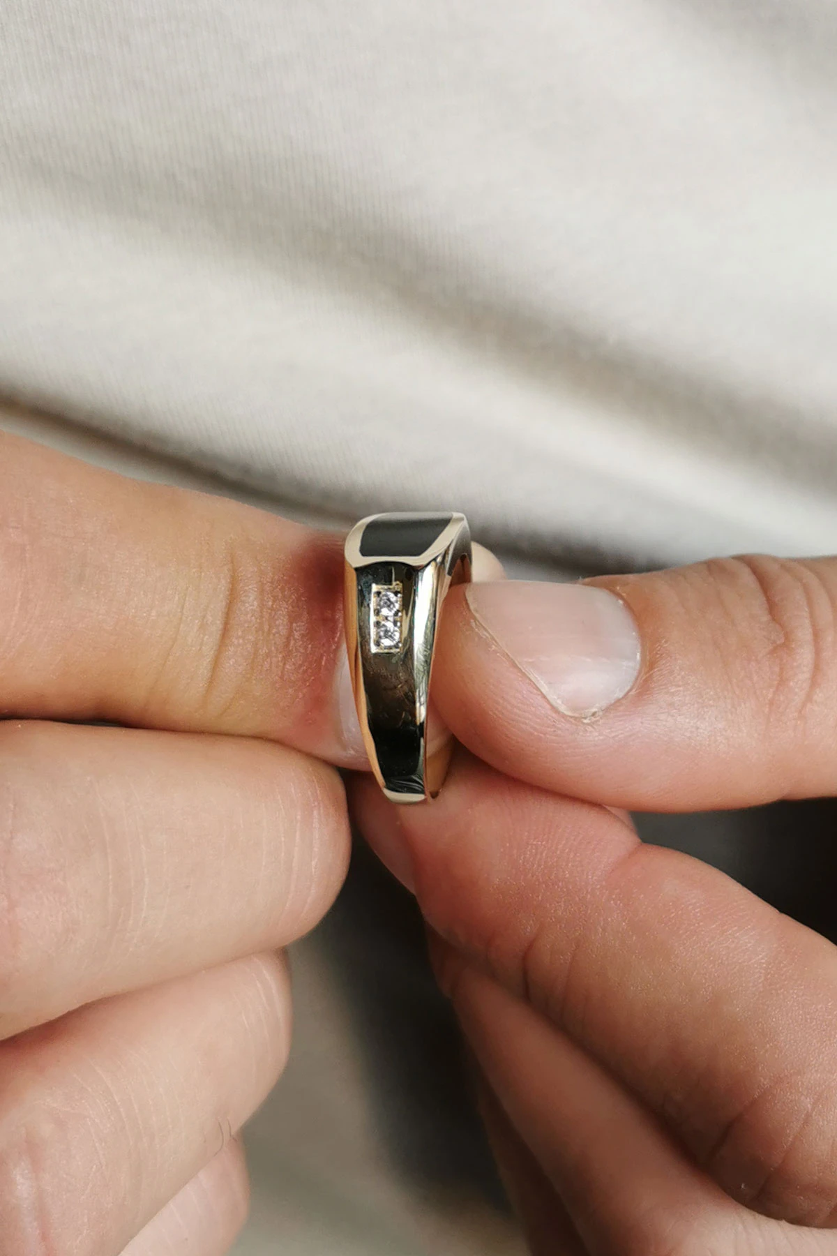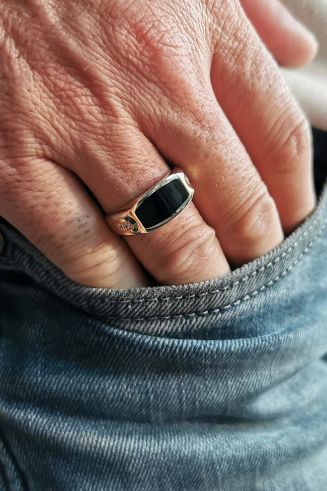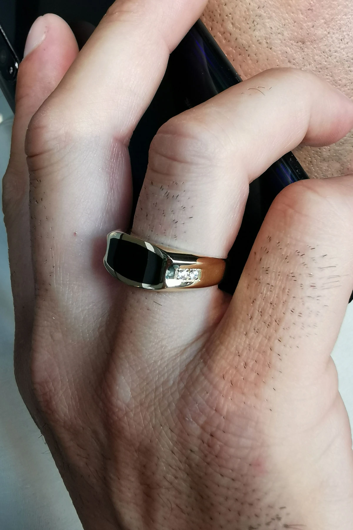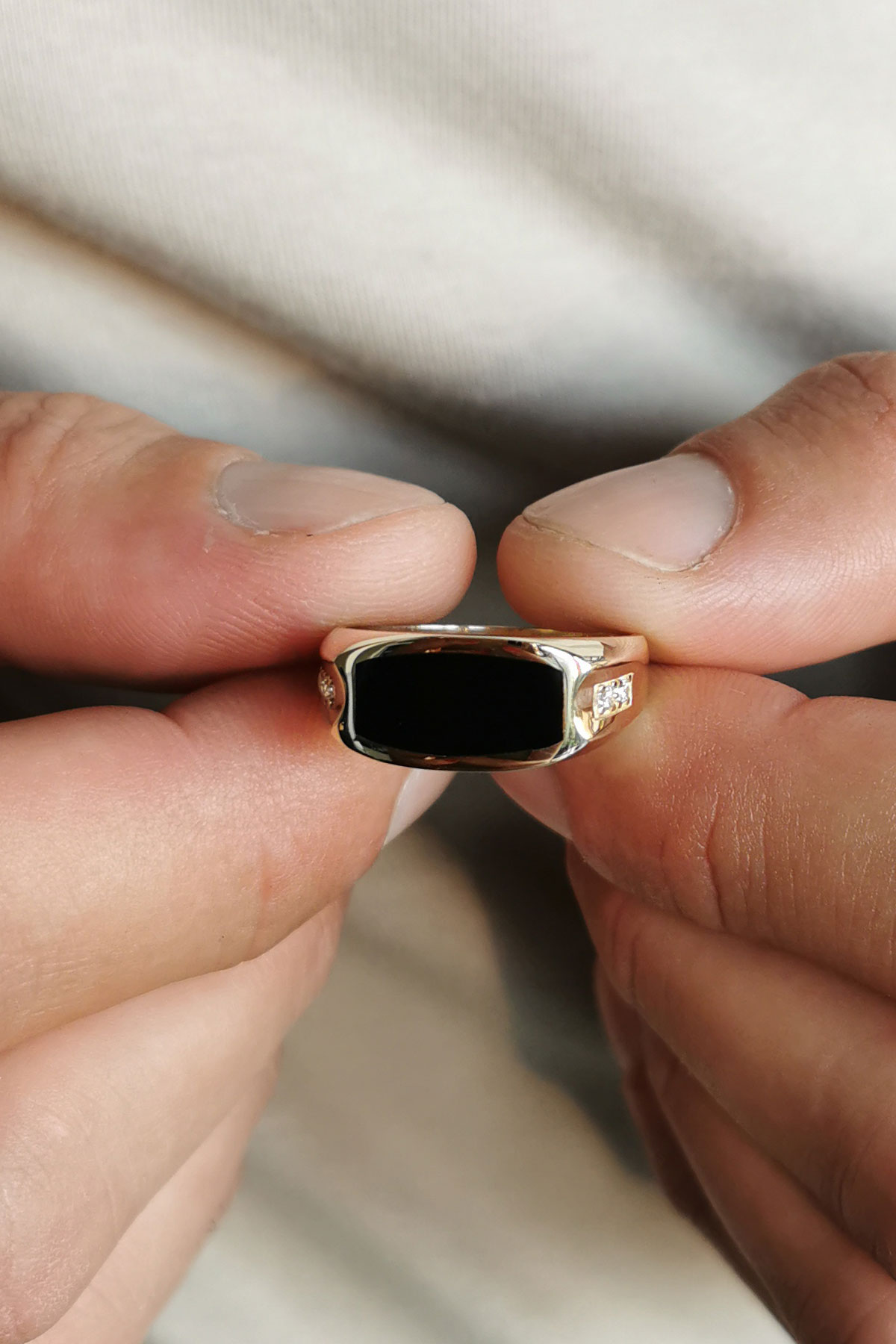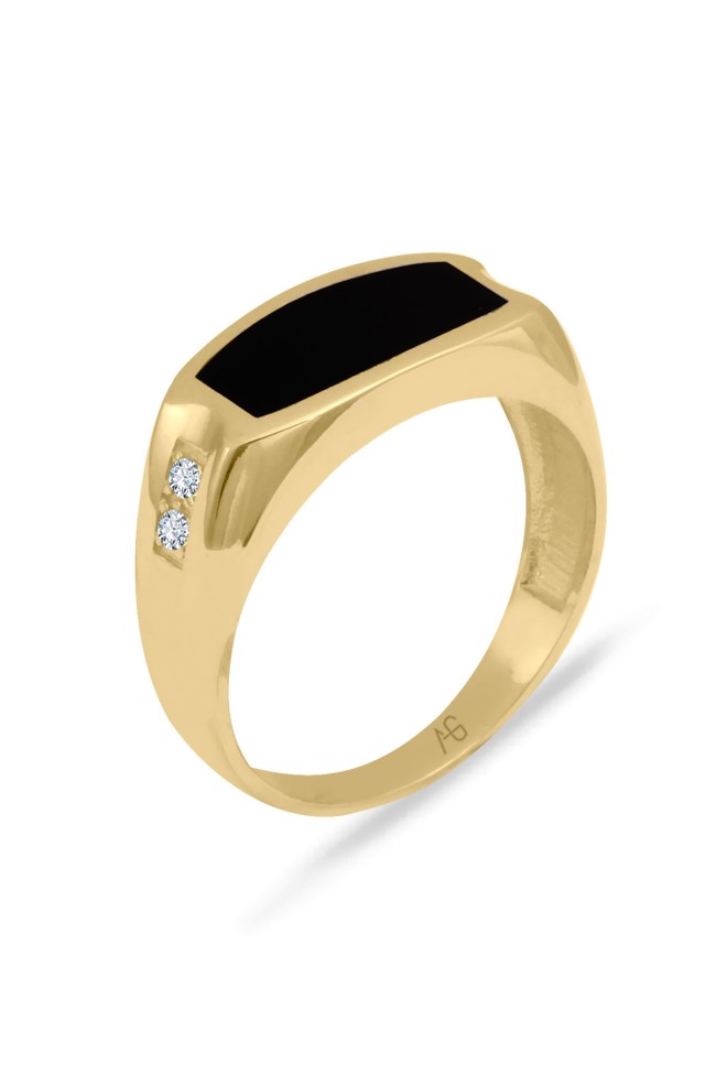 5.60 Gr. ağırlığında sarı altın siyah mineli taş detaylı modern bir modele sahip 14 ayar altın erkek yüzük.
