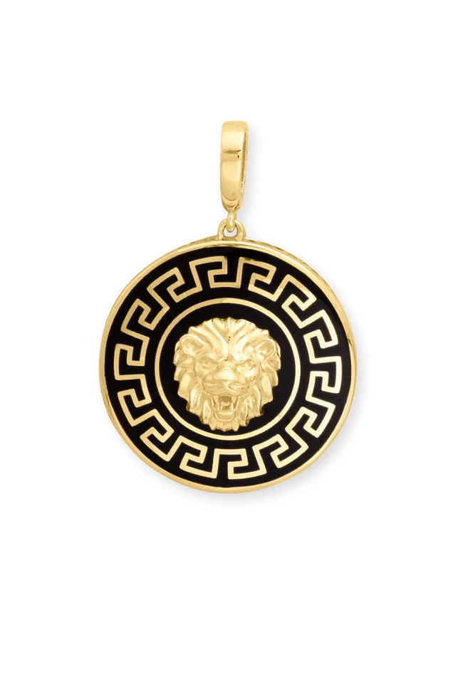 Modern Şehirli Tarz Oldukça Şık Bir Modele Sahip 5.70 Gr. Ağırlığında 14 Ayar Altın Grek Desen Yuvarlak Siyah Mineli Aslan Model Erkek Kolye Ucu.