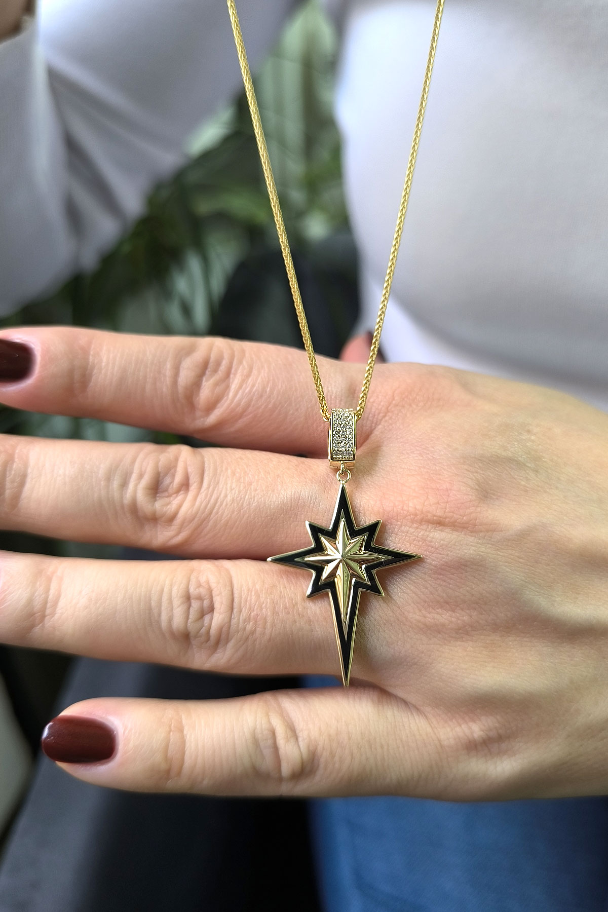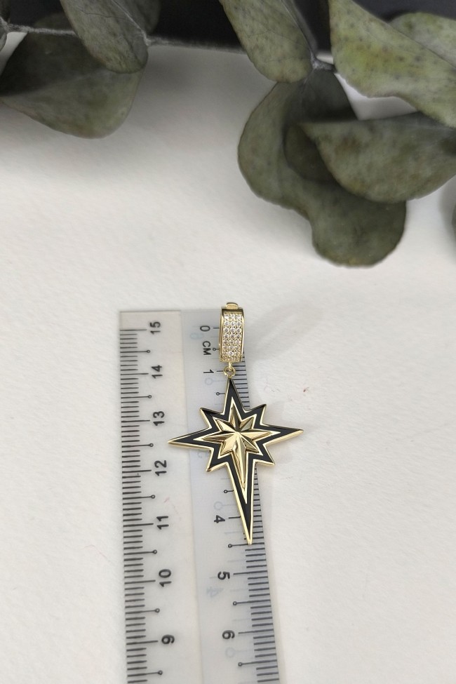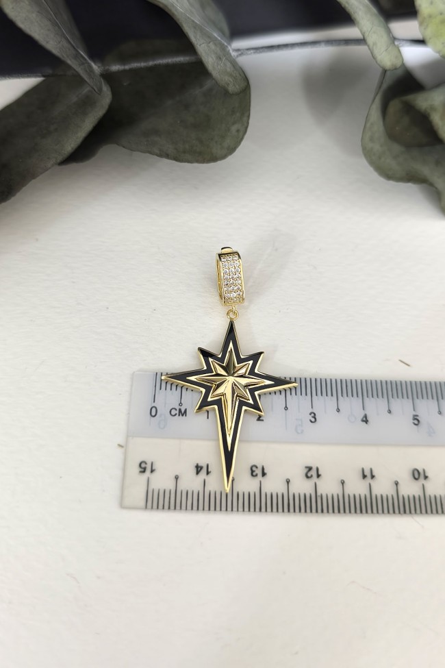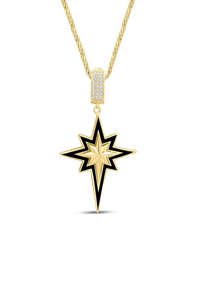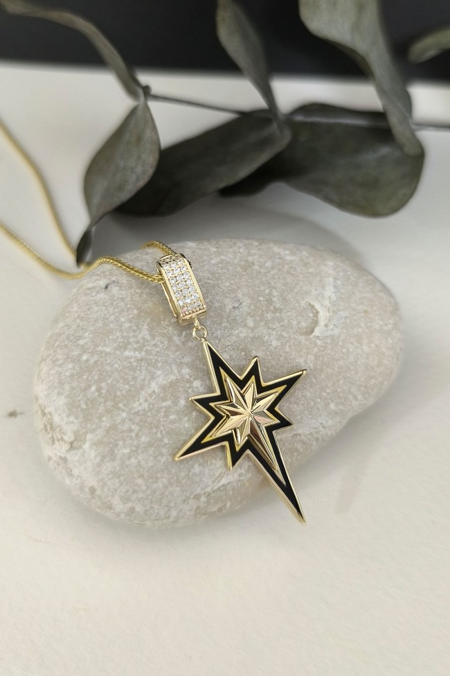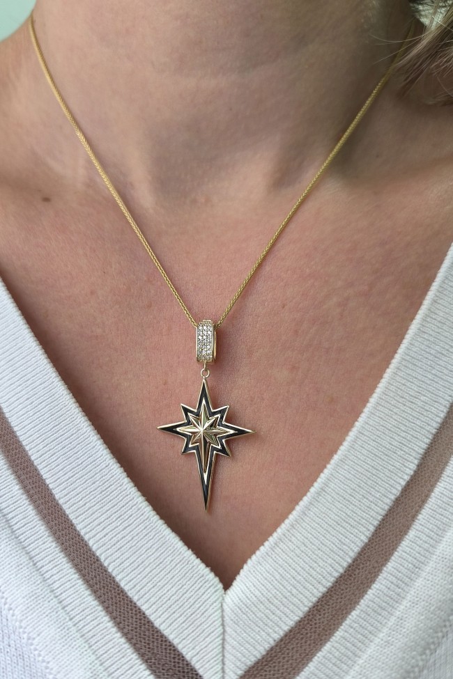 5.60 gr. 4.5 cm boyutunda zirkon taşlı model 14 ayar altın siyah mineli kuzey yıldızı charm kilit kolye. Farklı kolyelerinizle bir arada kombine olarak kullanabileceğiniz harika ve gösterişli bir model.