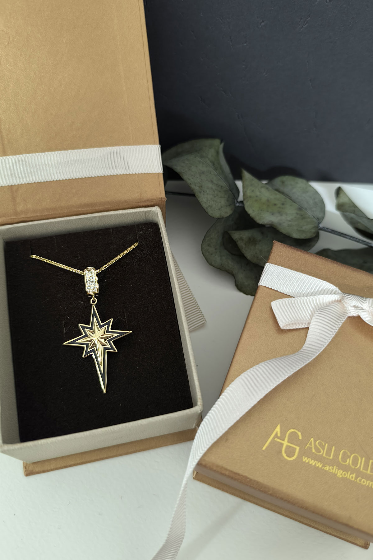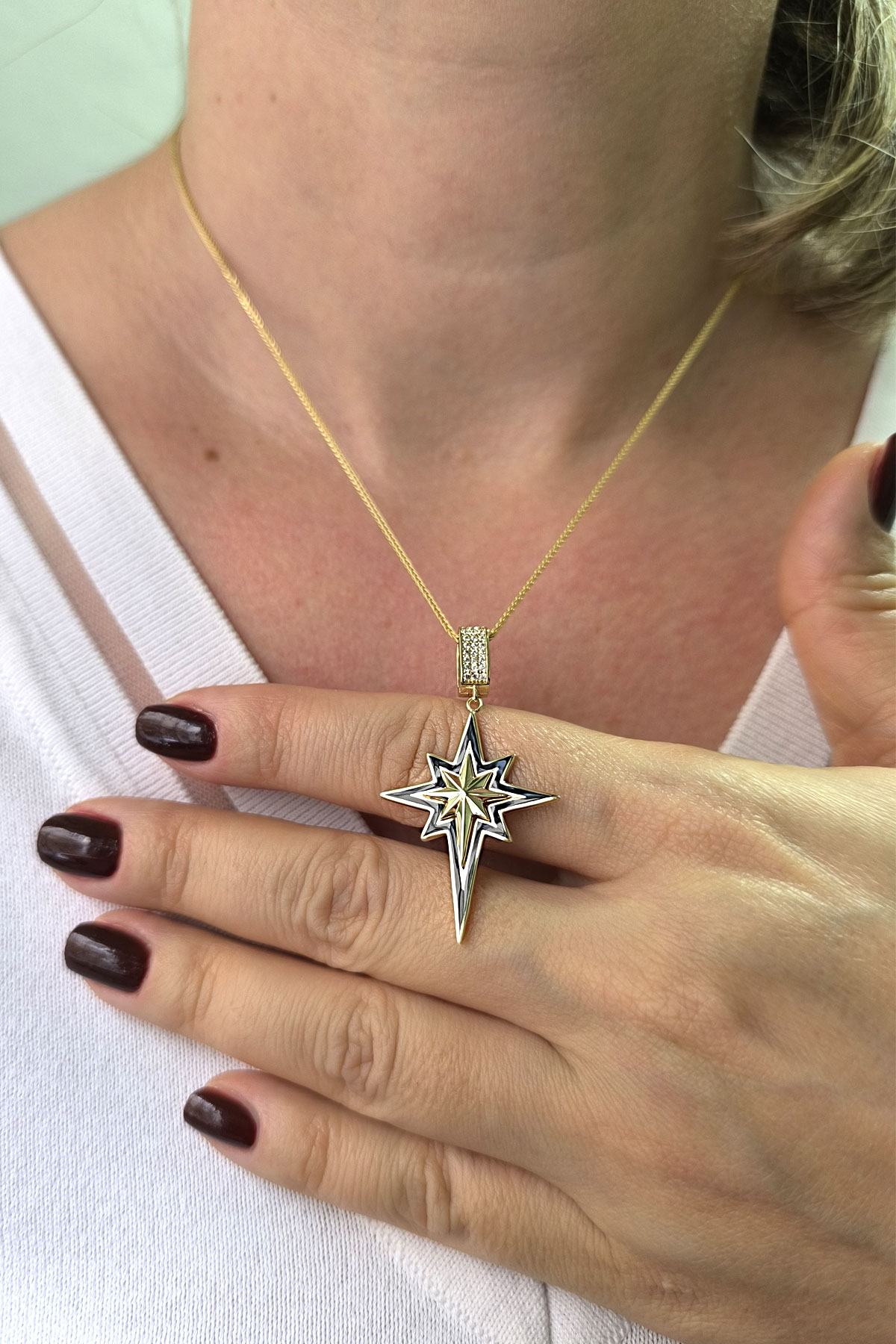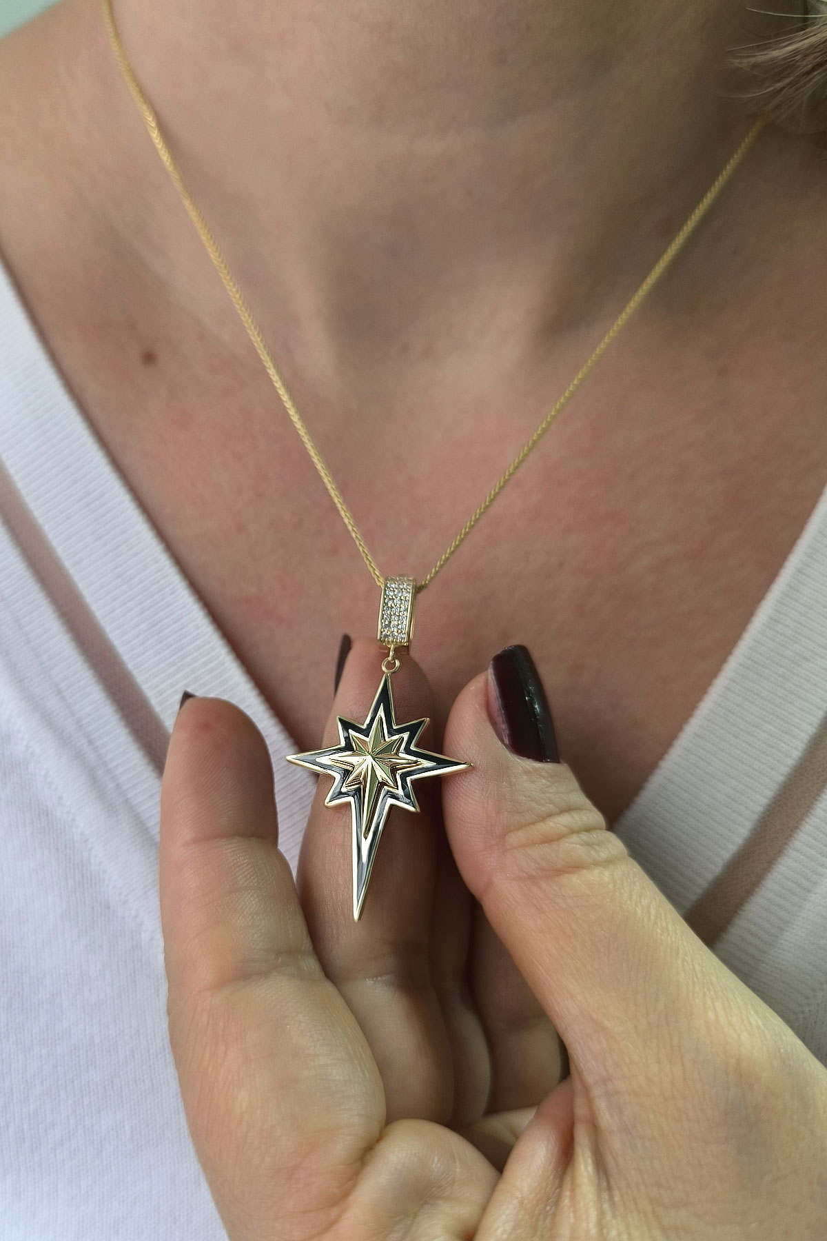 5.60 gr. 4.5 cm boyutunda zirkon taşlı model 14 ayar altın siyah mineli kuzey yıldızı charm kilit kolye. Farklı kolyelerinizle bir arada kombine olarak kullanabileceğiniz harika ve gösterişli bir model.