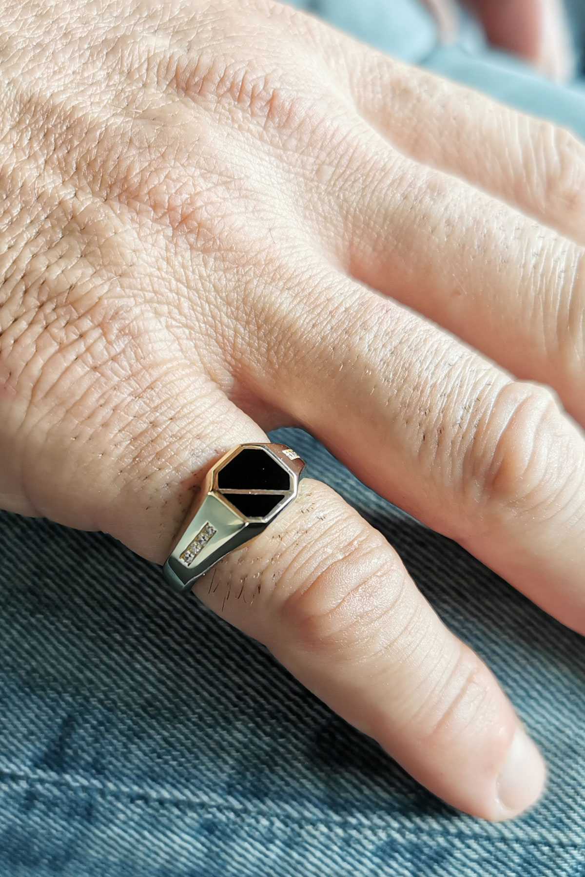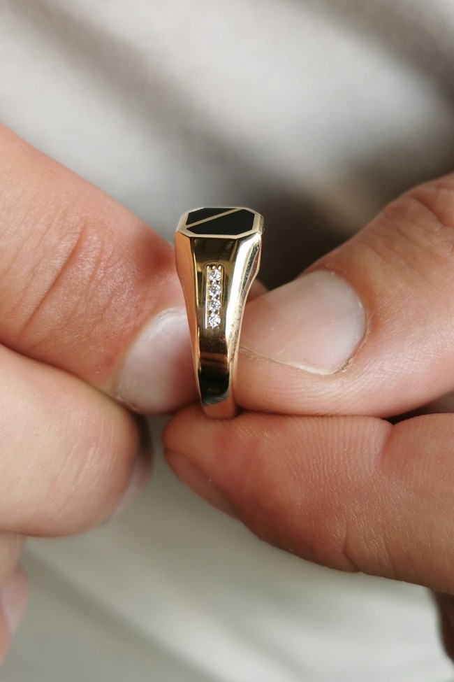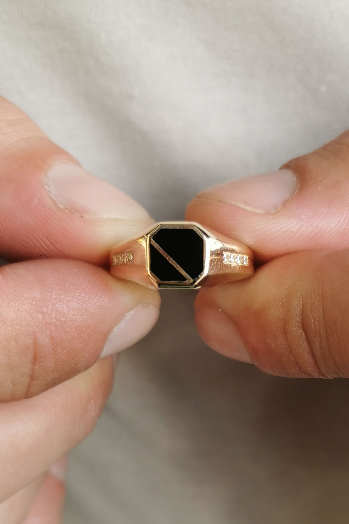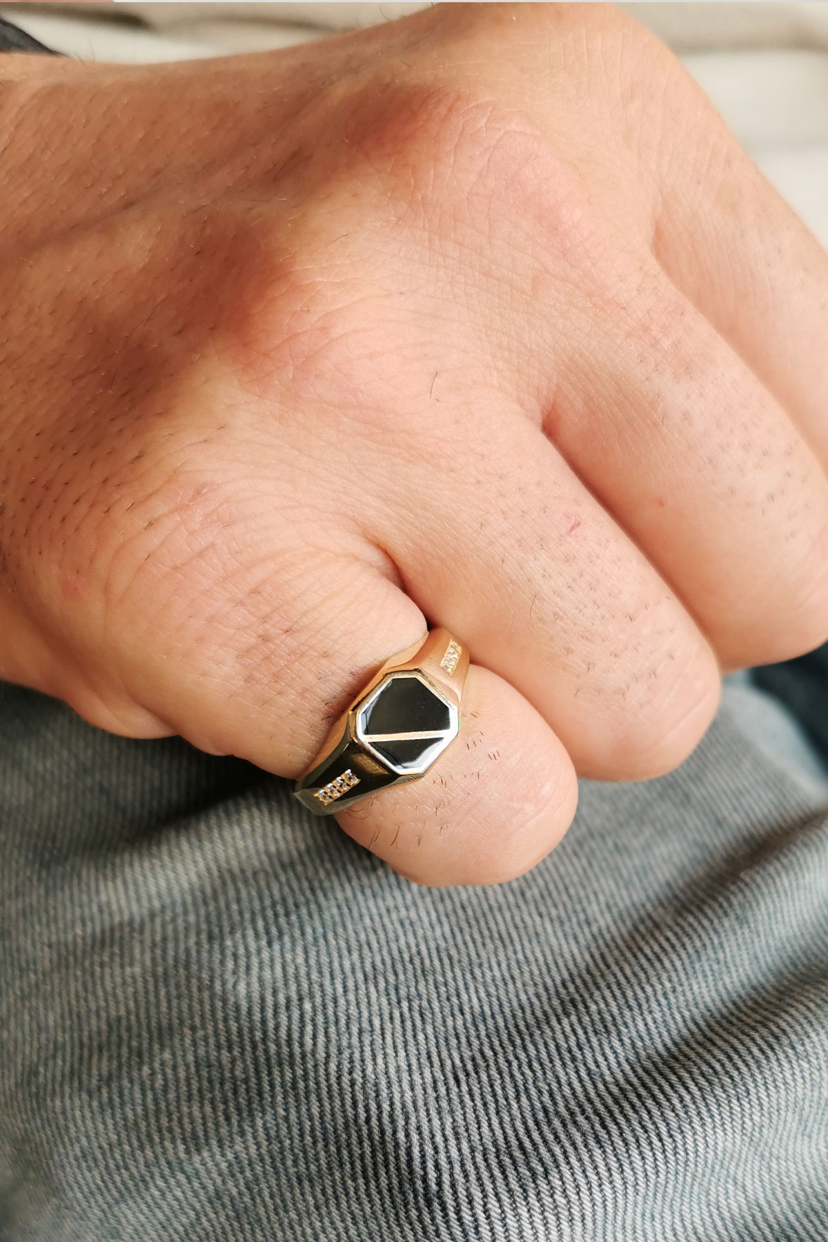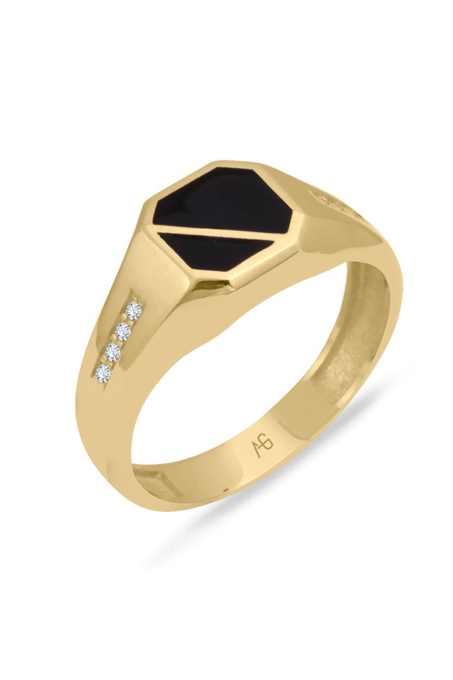 4.00 Gr. ağırlığında sarı altın siyah mineli kolları taş detaylı modern bir modele sahip 14 ayar altın erkek yüzük.