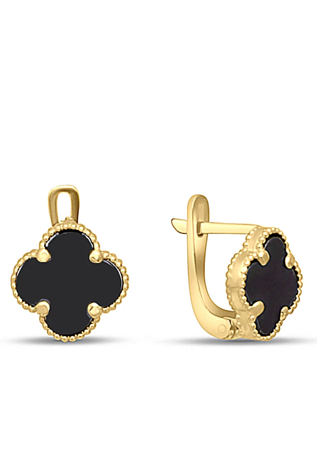 14 Ayar 1.2 Cm boyutunda modern tasarımı ile spor duruşa da sahip günlük kullanıma uygun 4.10 gram ağırlığında tasarım siyah taşlı altın yonca küpe.