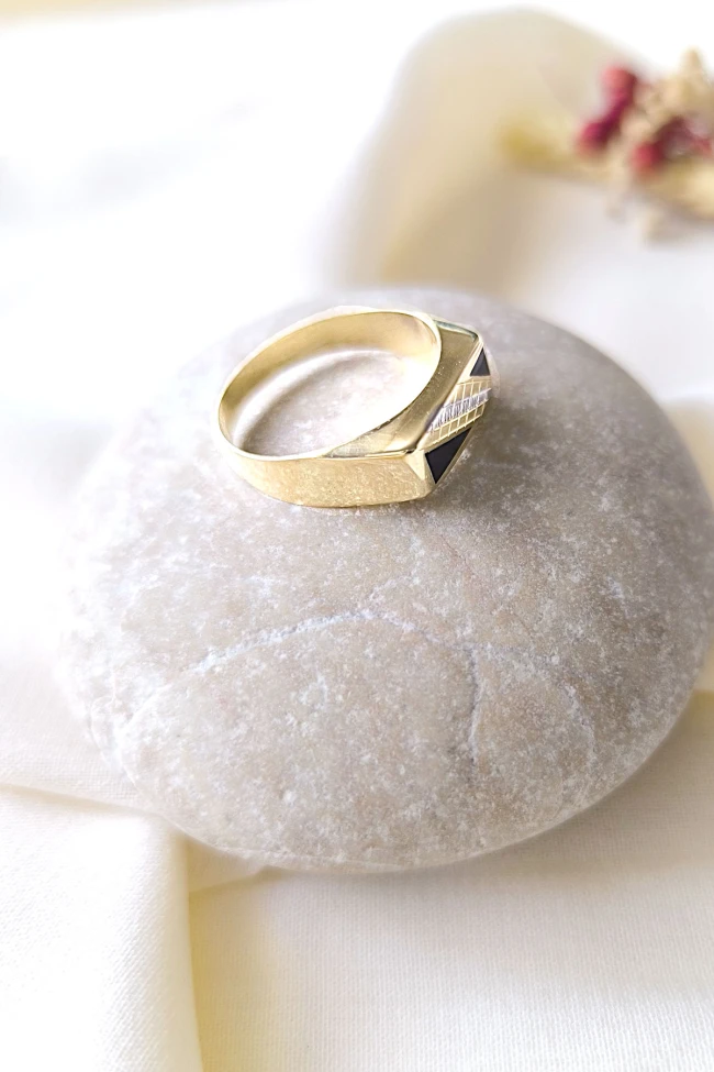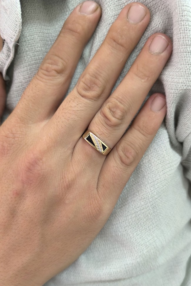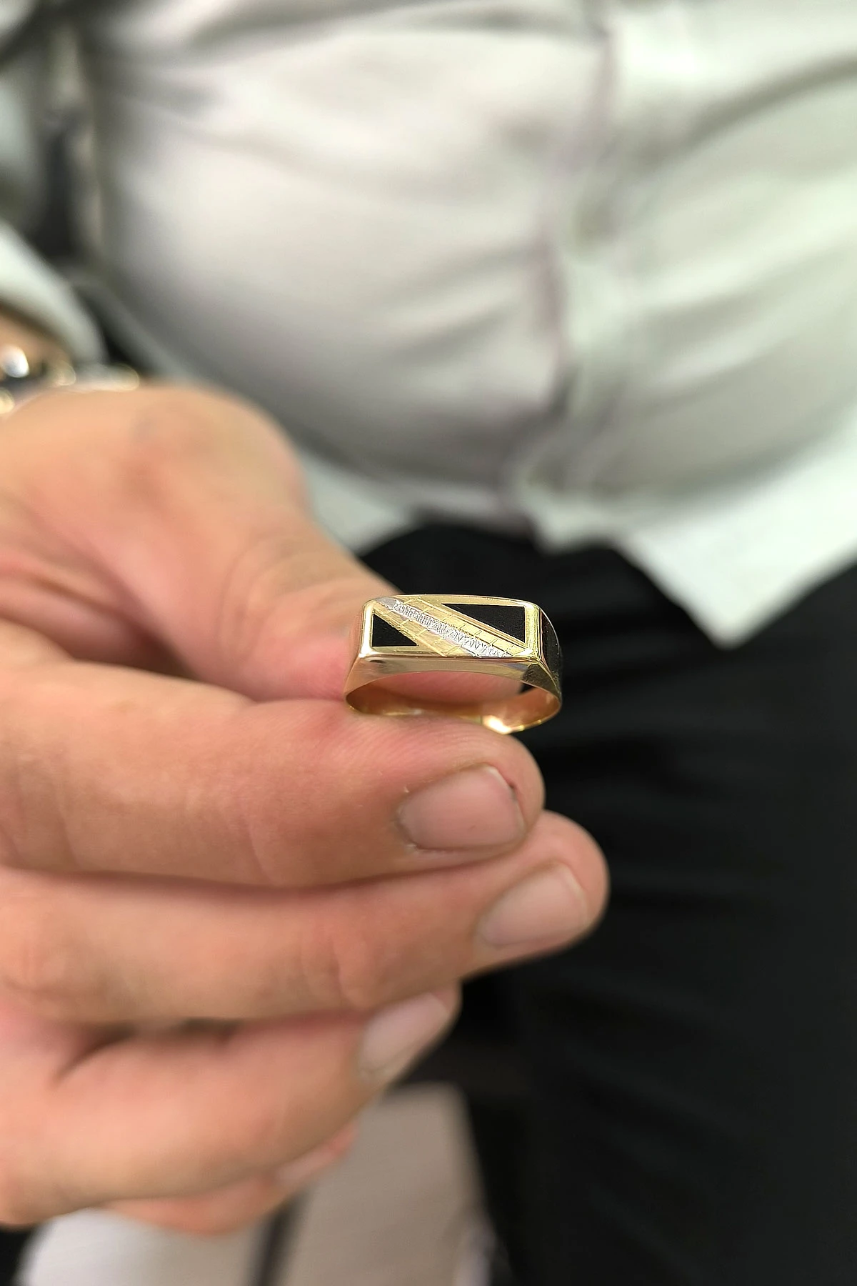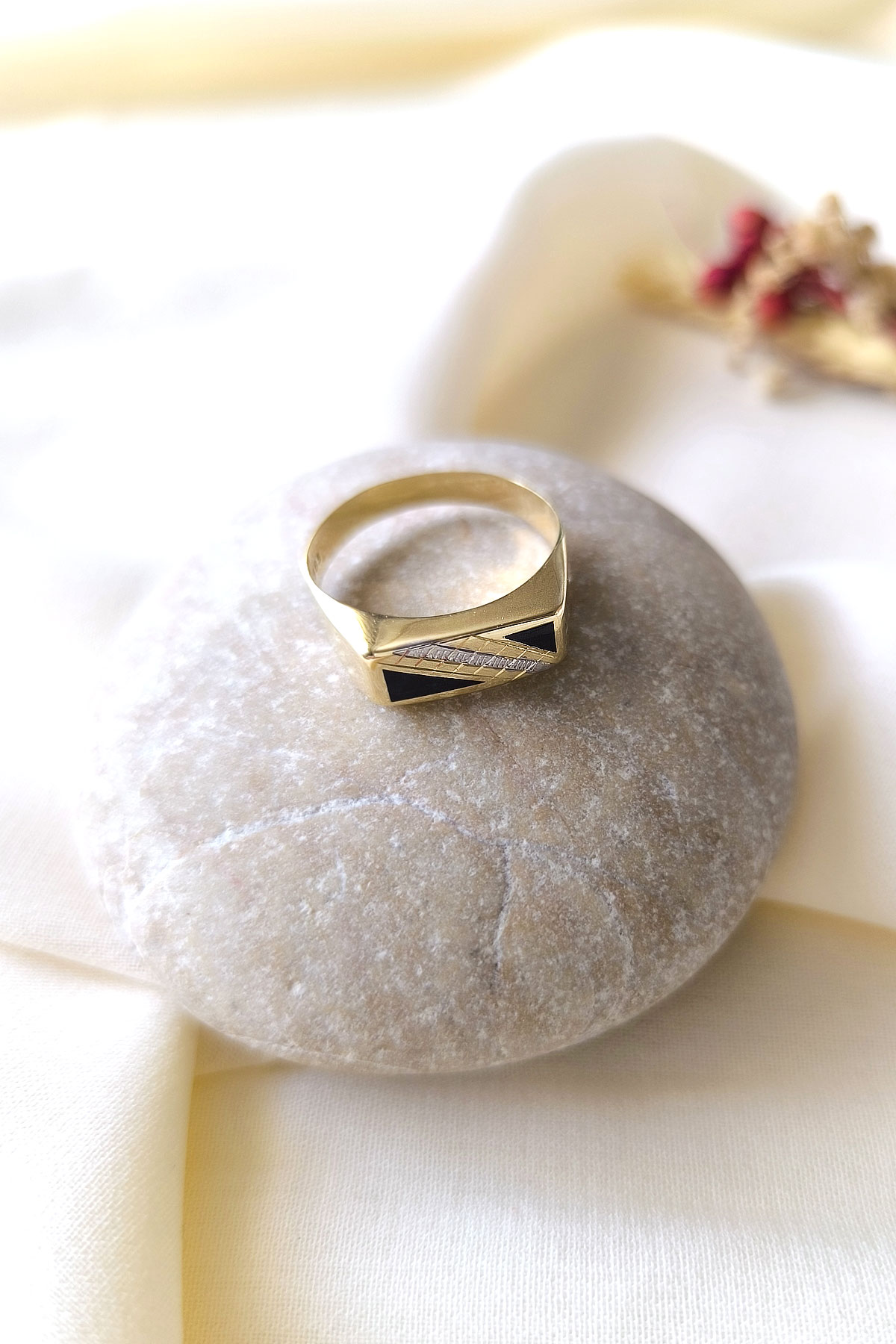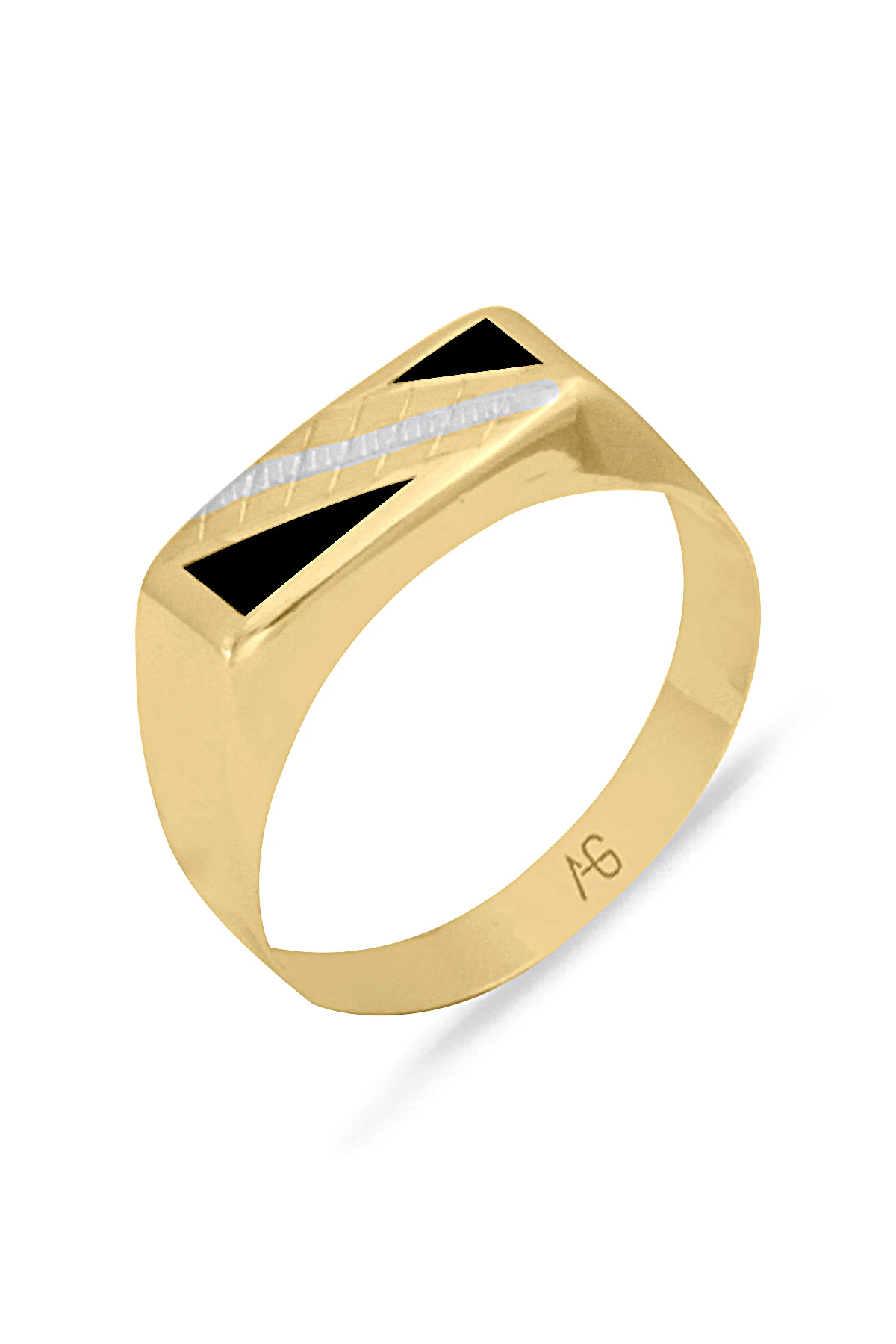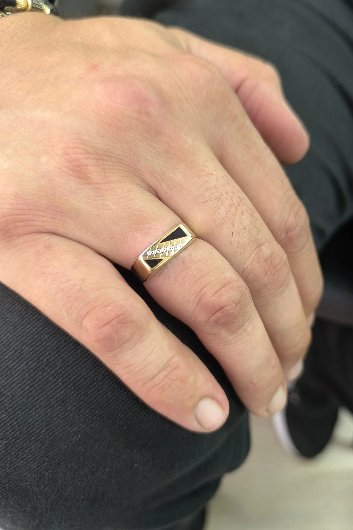 2.00 Gr. ağırlığında dikdörtgen formlu şık bir modele sahip taşsız sade siyah şerit detaylı 14 ayar altın erkek yüzük.