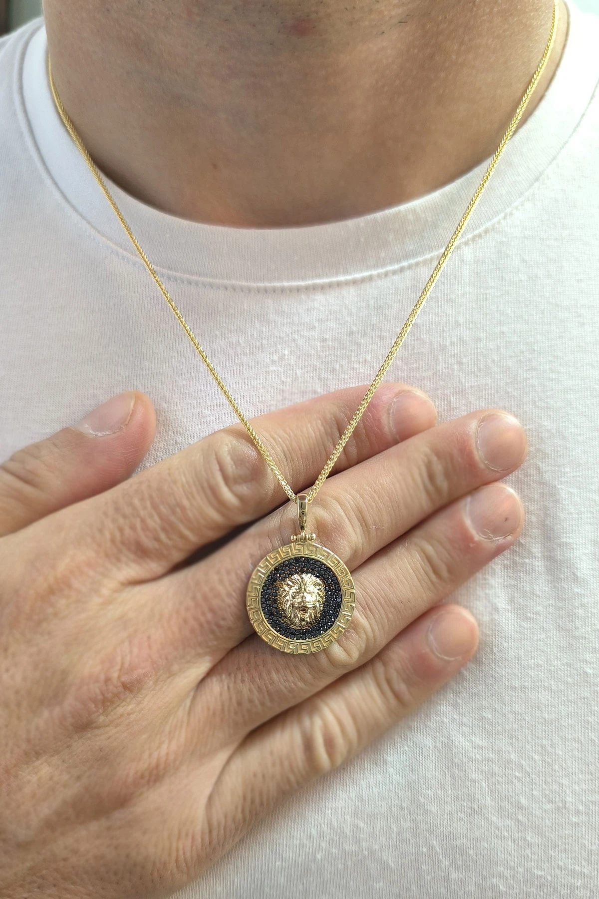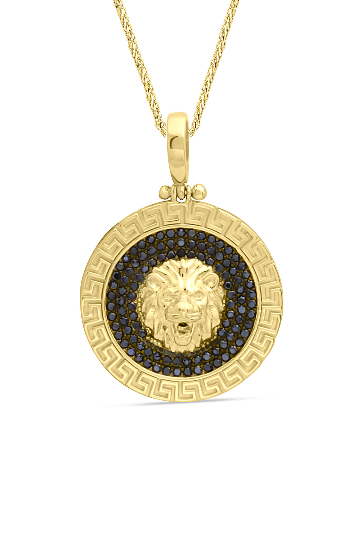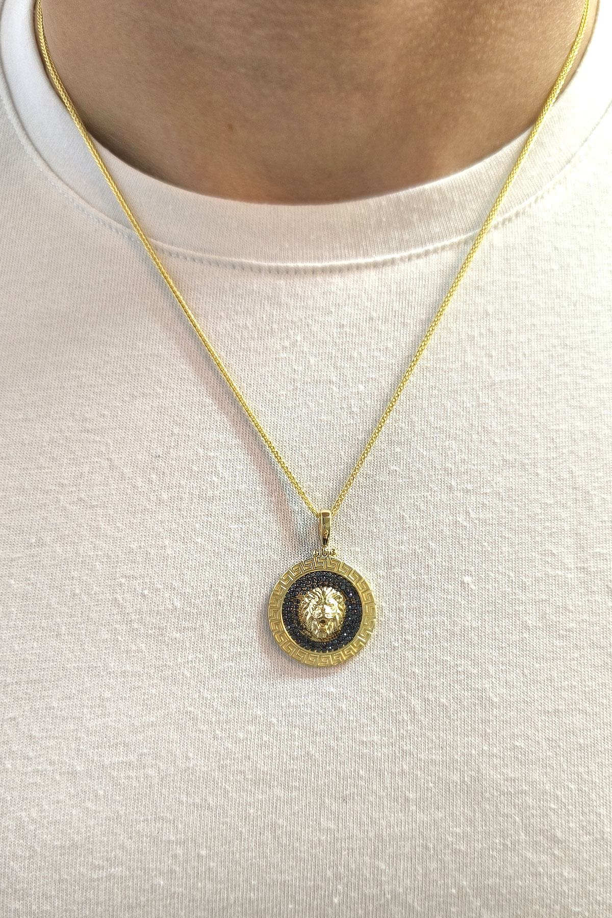 Modern Şehirli Tarz Spiga 55 Cm Zincir Seçimiyle Oldukça Şık Bir Modele Sahip Pana Kenar Detaylı Zirkon Siyah Taşlı 7.75 Gr. Ağırlığında 14 Ayar Altın Aslan Erkek Kolye.