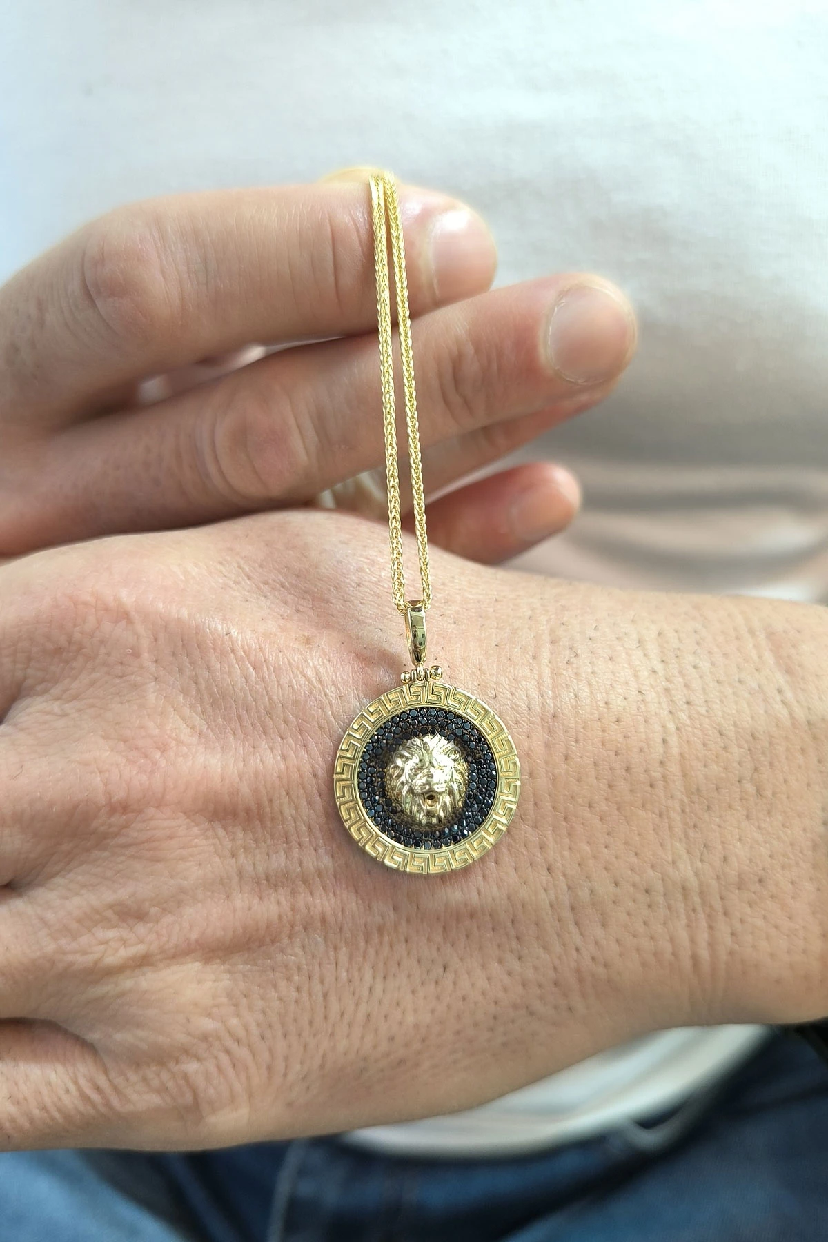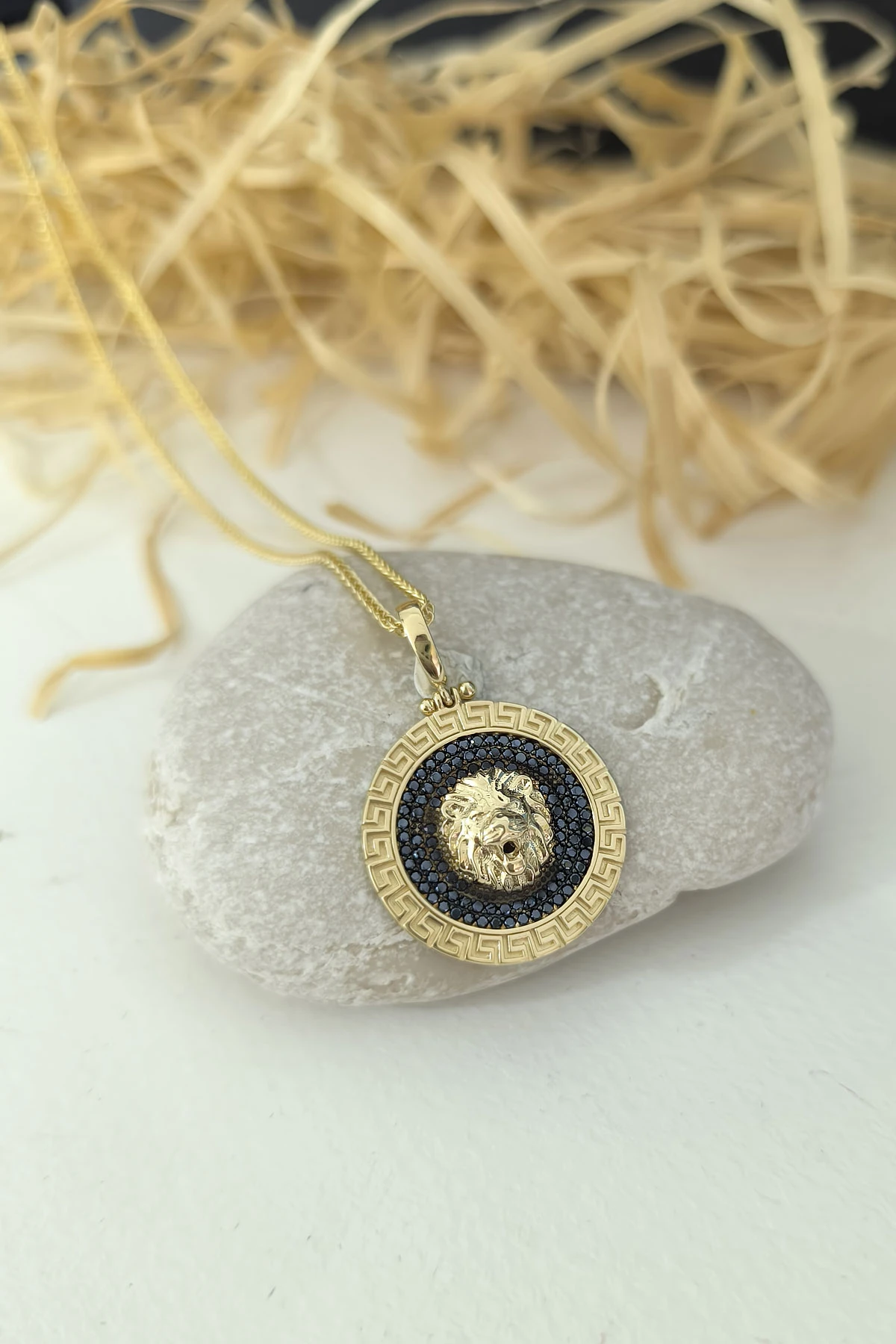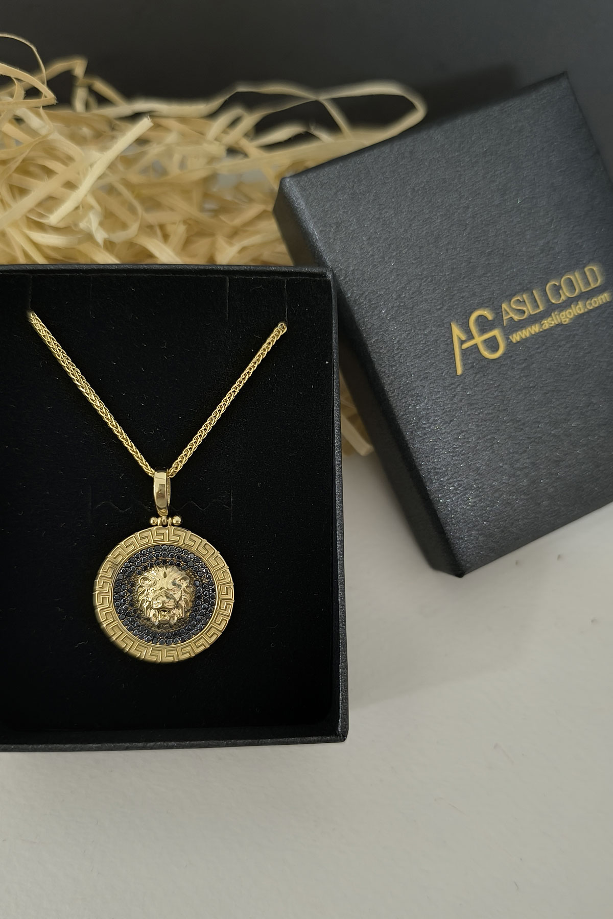 Modern Şehirli Tarz Spiga 55 Cm Zincir Seçimiyle Oldukça Şık Bir Modele Sahip Pana Kenar Detaylı Zirkon Siyah Taşlı 7.75 Gr. Ağırlığında 14 Ayar Altın Aslan Erkek Kolye.