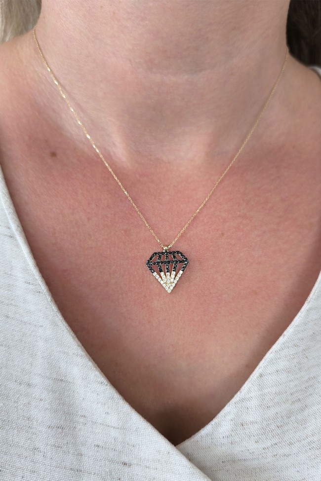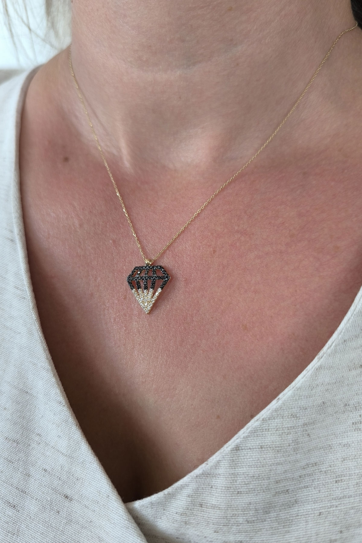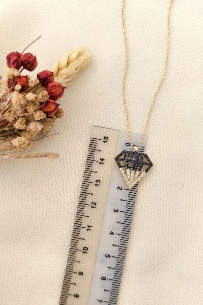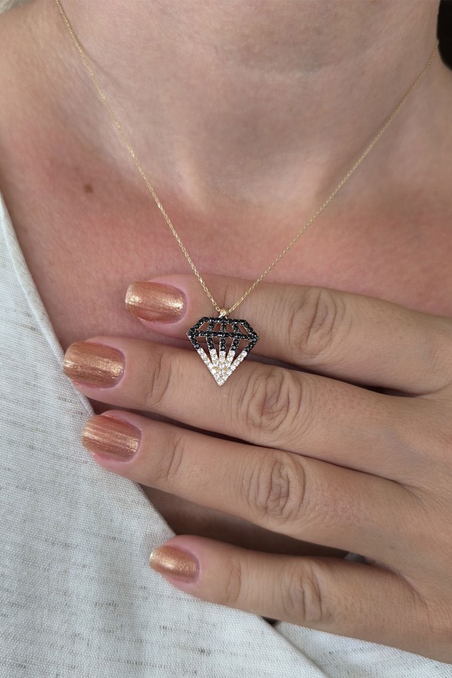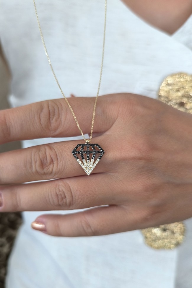 45 Cm zincirli 2.20 gr. 2 cm boyutunda siyah ve beyaz zirkon taş detaylı günlük kullanıma uygun 14 ayar altın pırlanta şeklinde kadın diamond kolye.