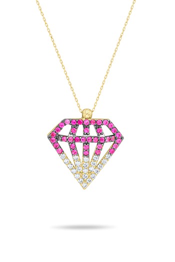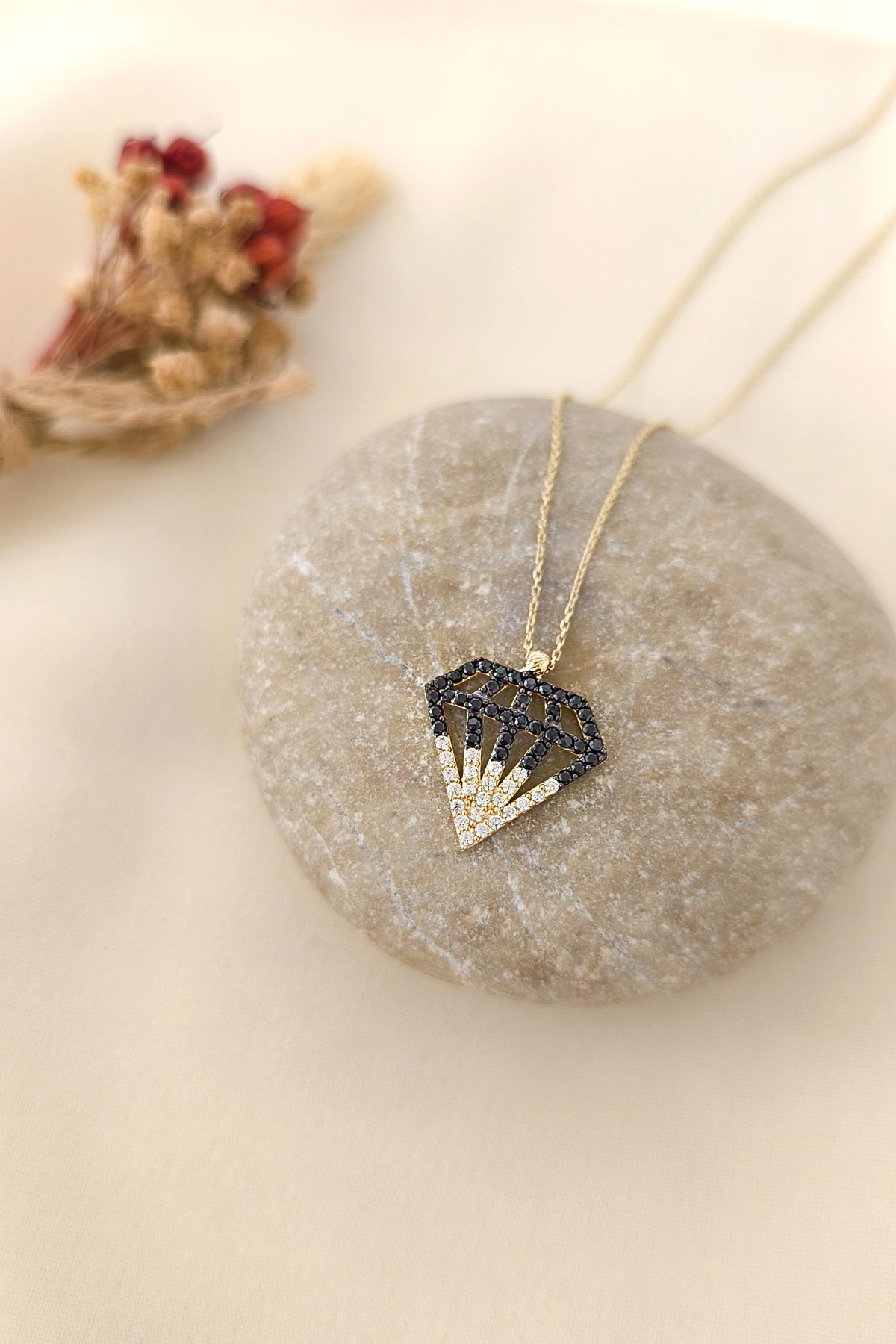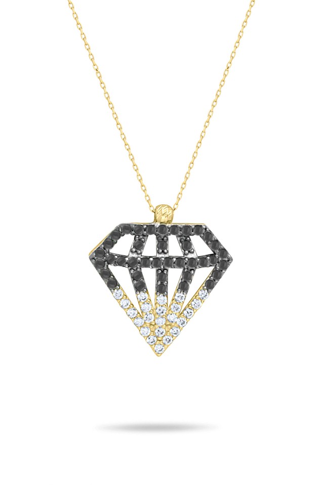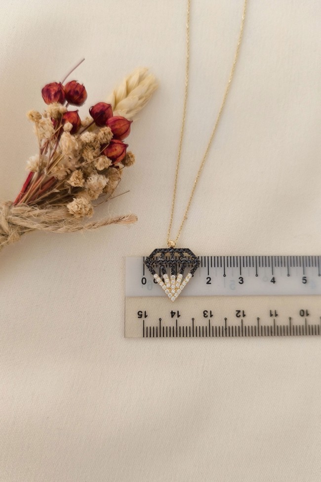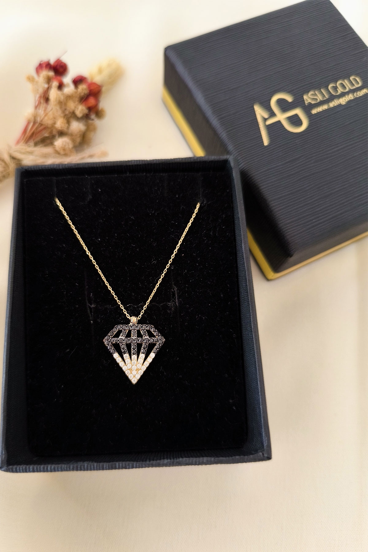 45 Cm zincirli 2.20 gr. 2 cm boyutunda siyah ve beyaz zirkon taş detaylı günlük kullanıma uygun 14 ayar altın pırlanta şeklinde kadın diamond kolye.