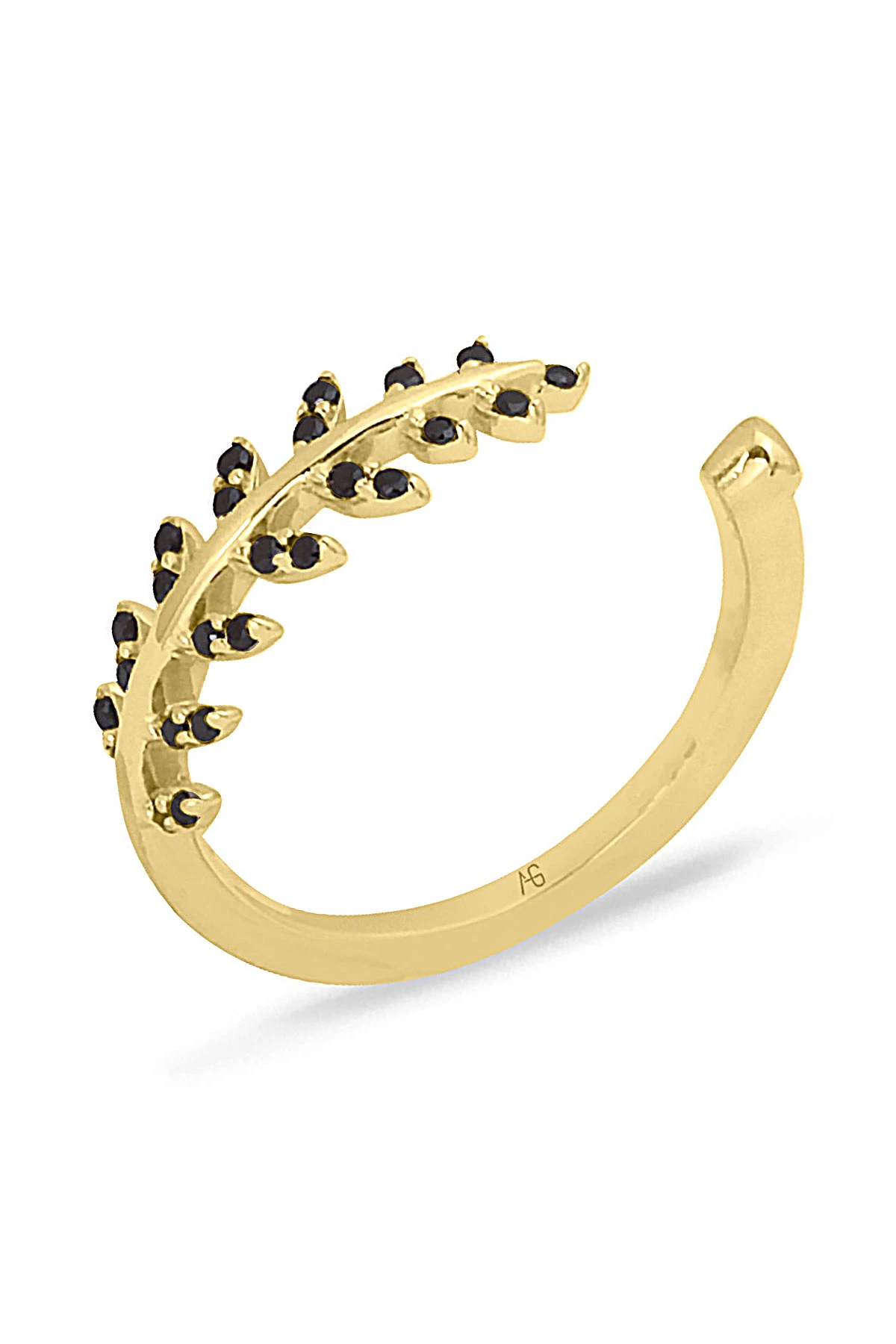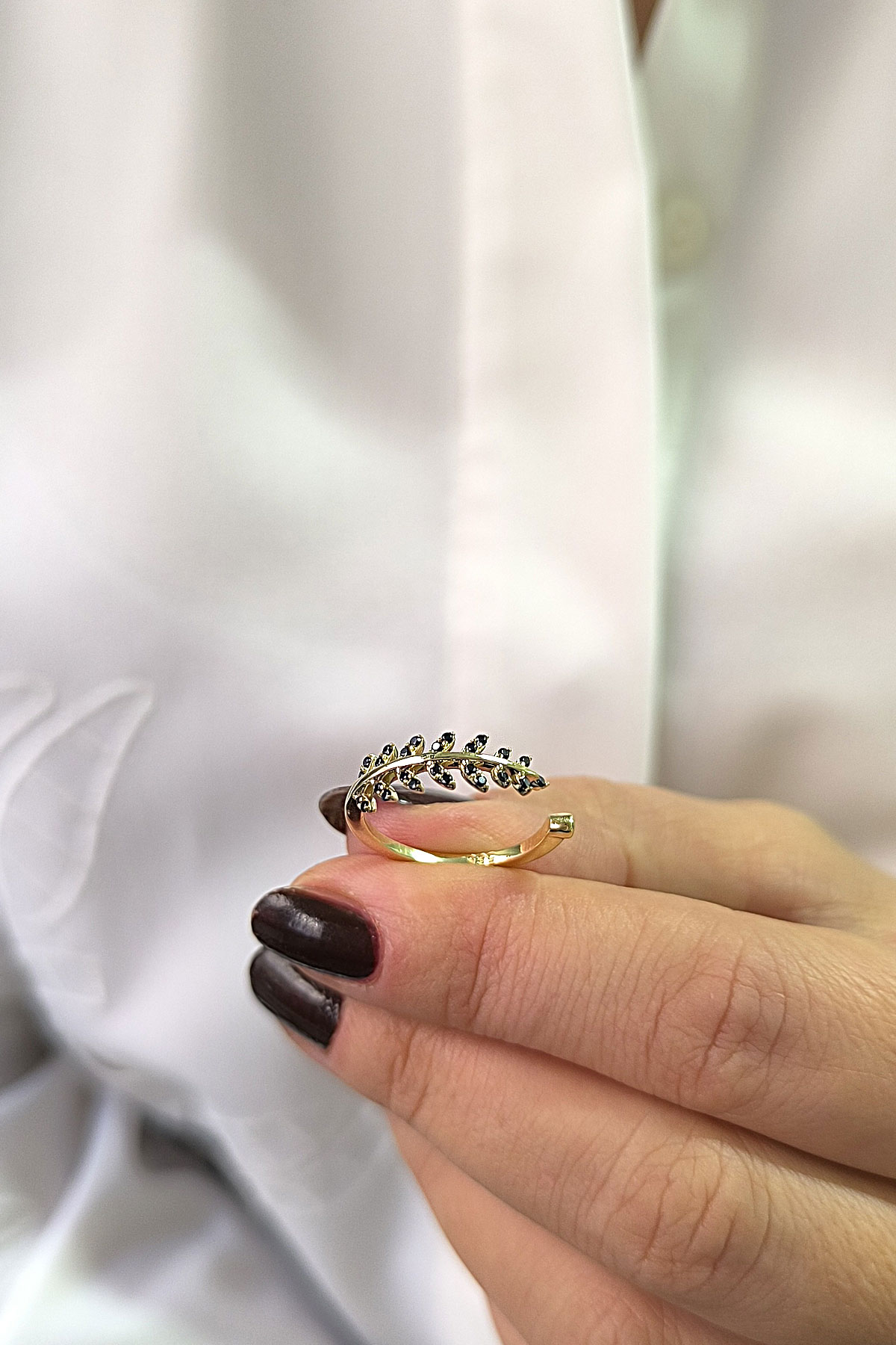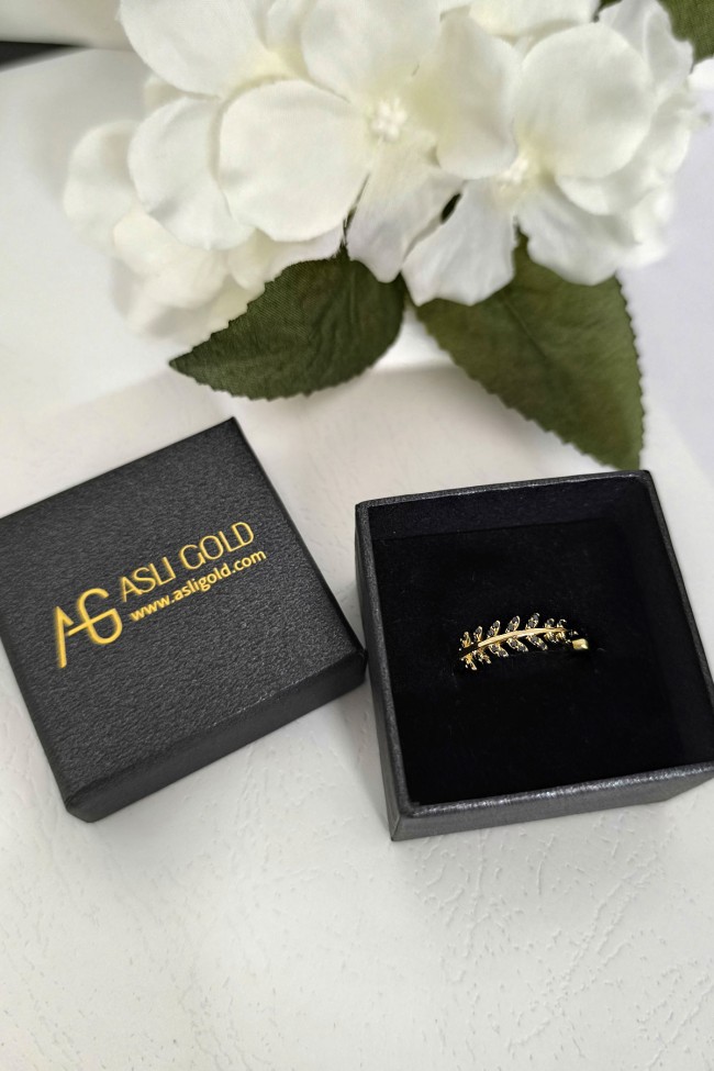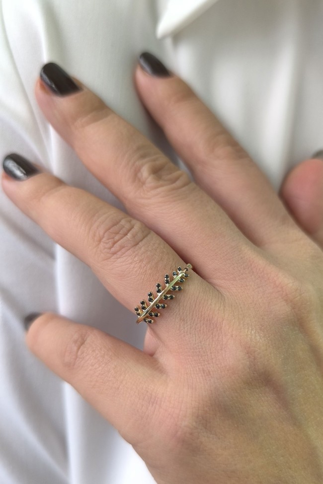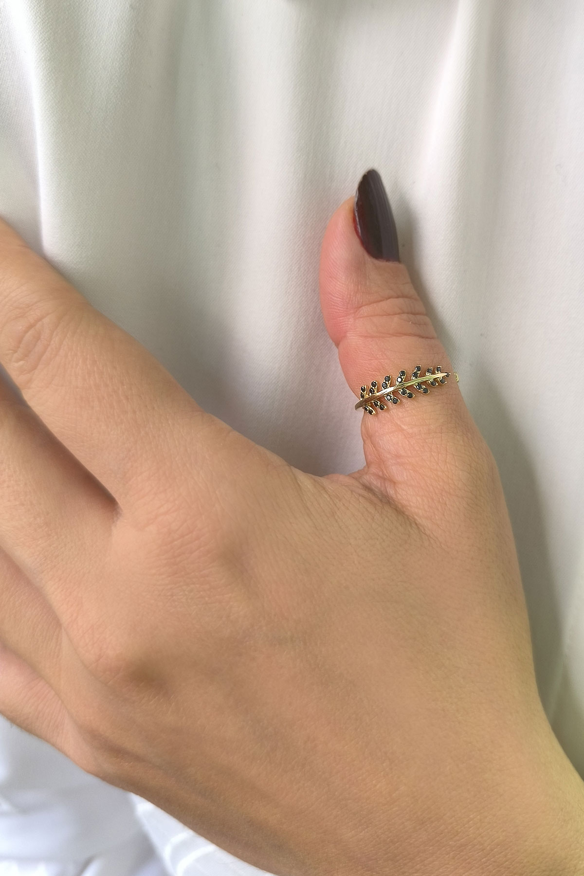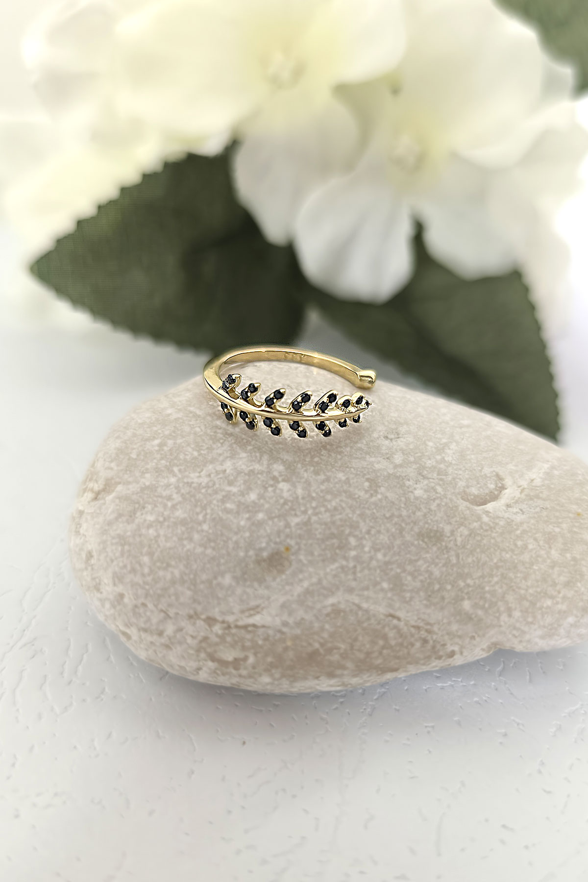 14 ayar sarı altın siyah zirkon taşlı minimal spor tasarımıyla günlük kullanıma uygun 2.15 gram ağırlığında altın yaprak yüzük.