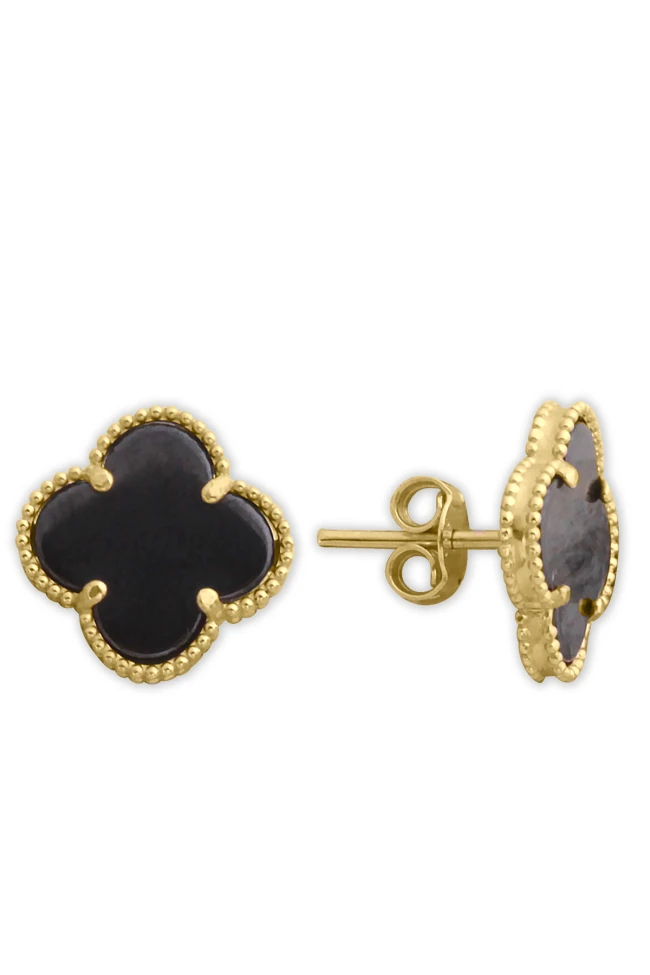 14 Ayar siyah onix taşlı 1.3 Cm boyutunda modern tasarımı ile spor duruşa da sahip günlük kullanıma uygun 4.10 gram ağırlığında tasarım vidalı model altın yonca küpe.
