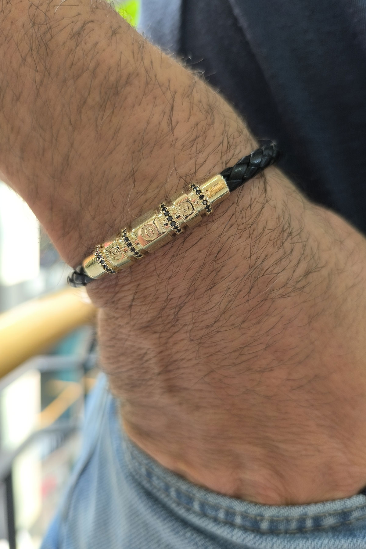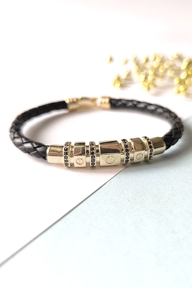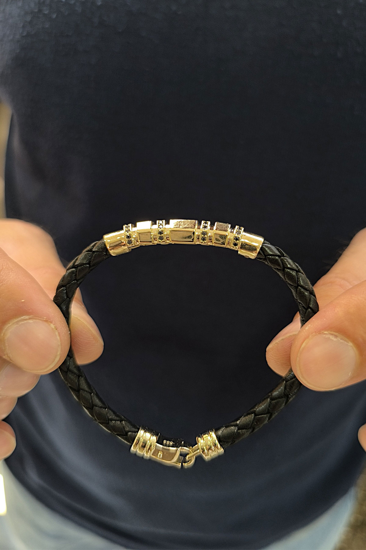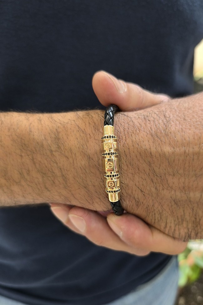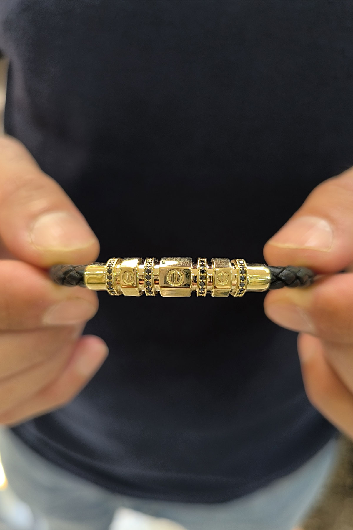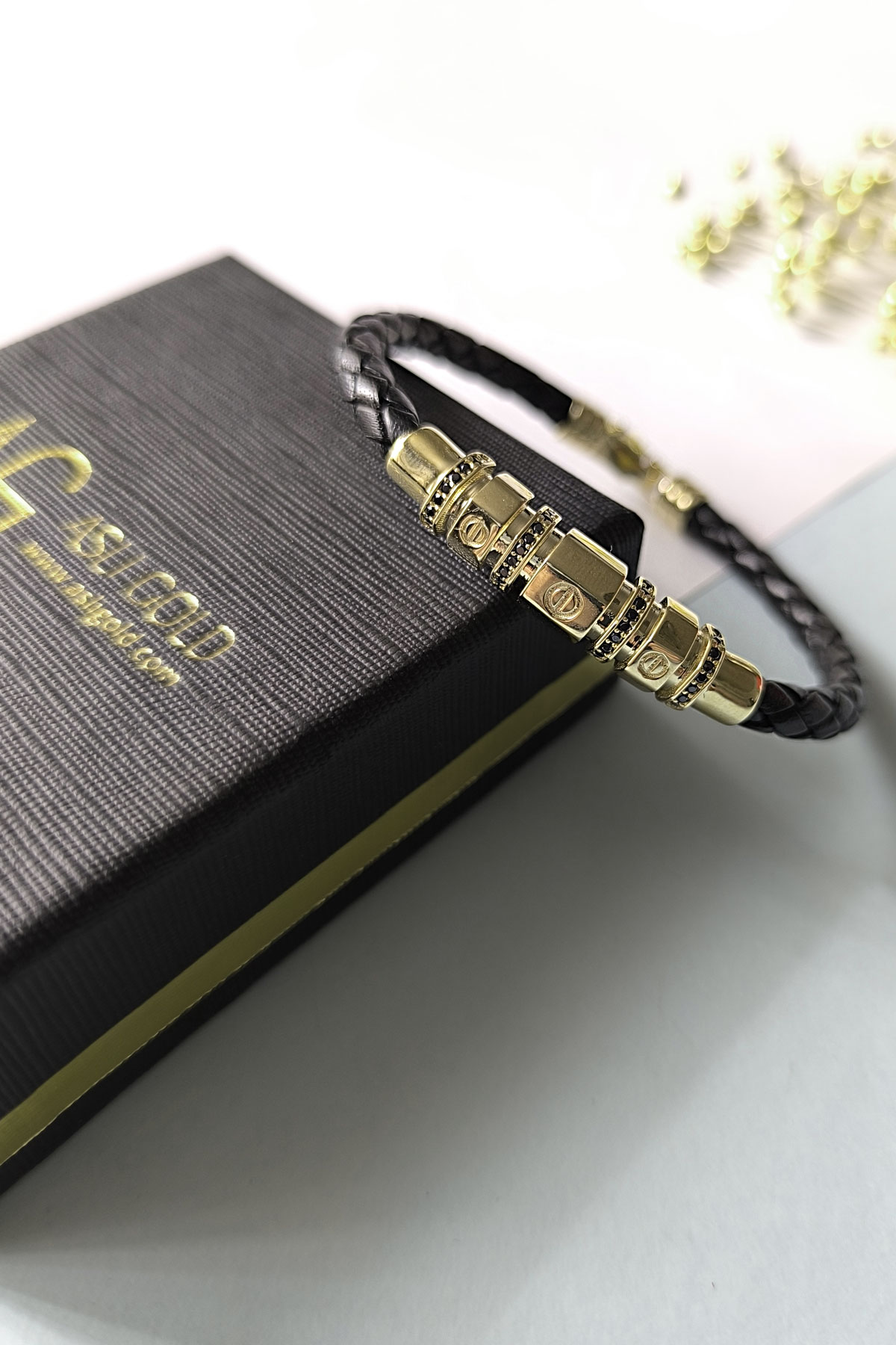 Prestij Ve Tarz Sahibi Beylerin Severek Kullanacağı 14 Ayar Siyah Taş Ve Vida Başı Model Detaylı Günlük Kullanıma Uygun Deri Spor Altın Erkek Bileklik.