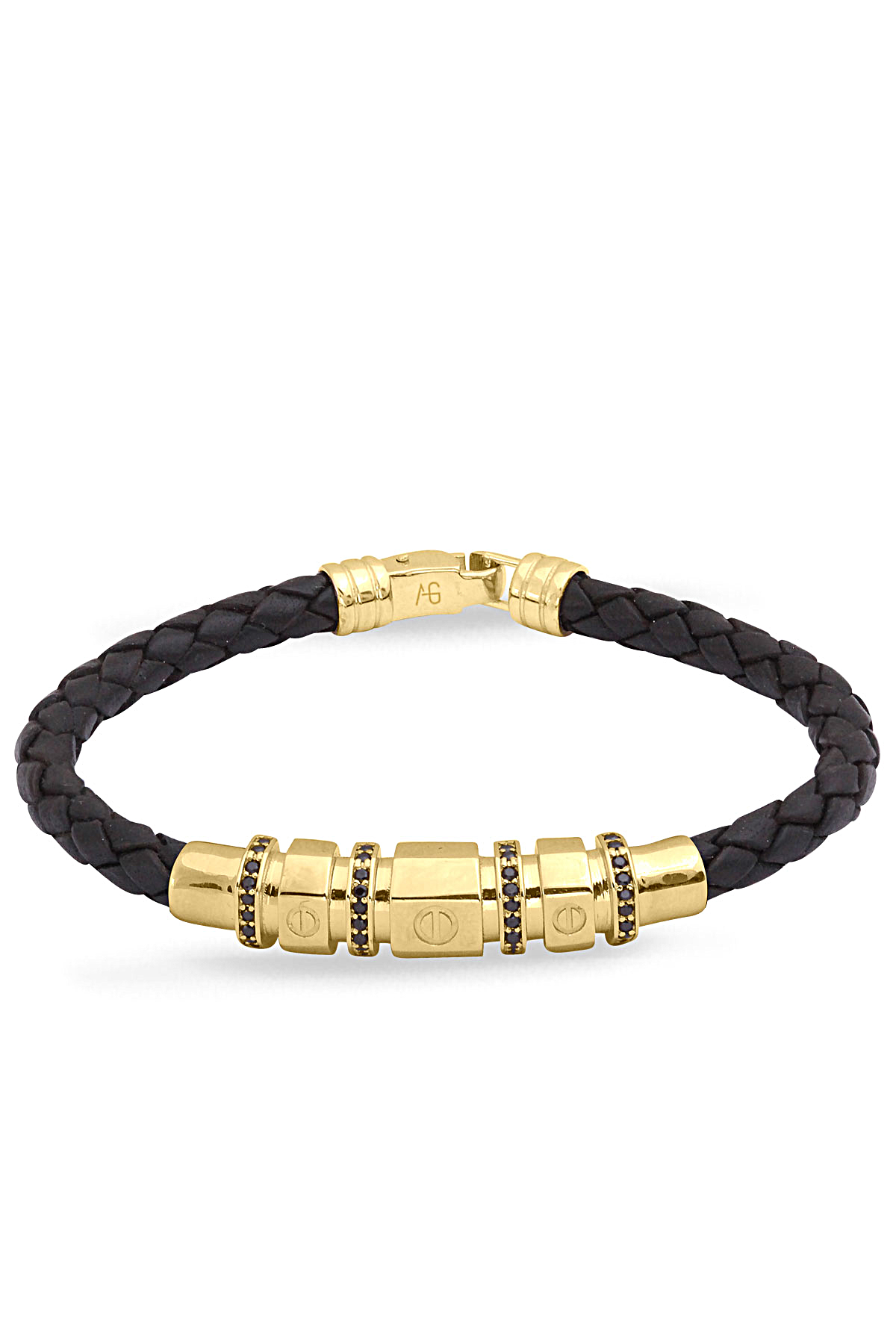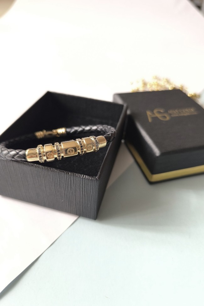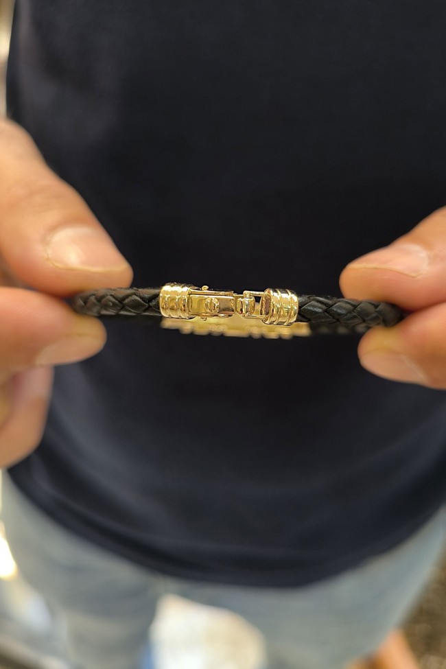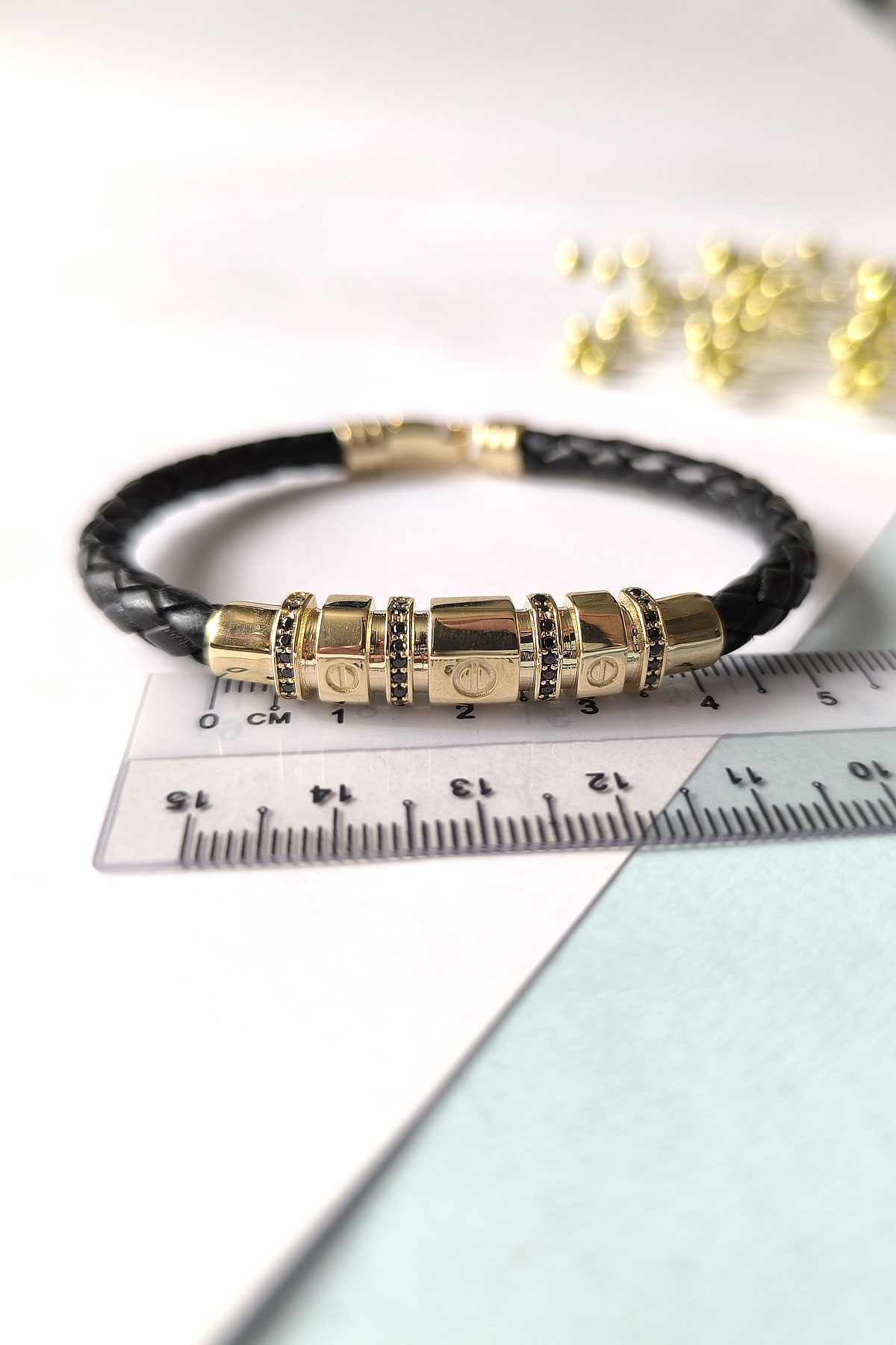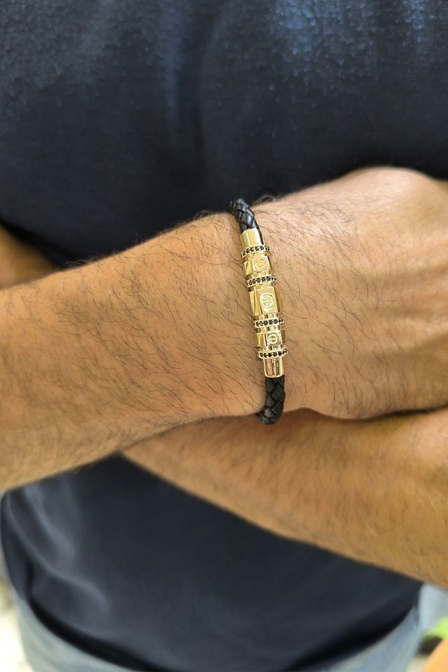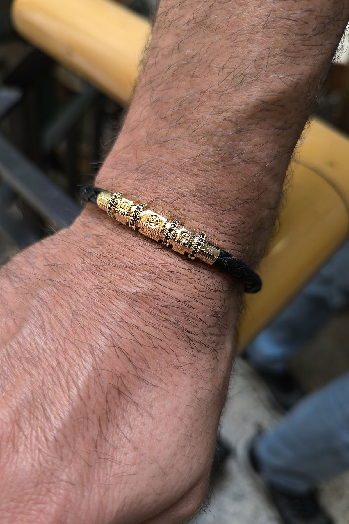 Prestij Ve Tarz Sahibi Beylerin Severek Kullanacağı 14 Ayar Siyah Taş Ve Vida Başı Model Detaylı Günlük Kullanıma Uygun Deri Spor Altın Erkek Bileklik.