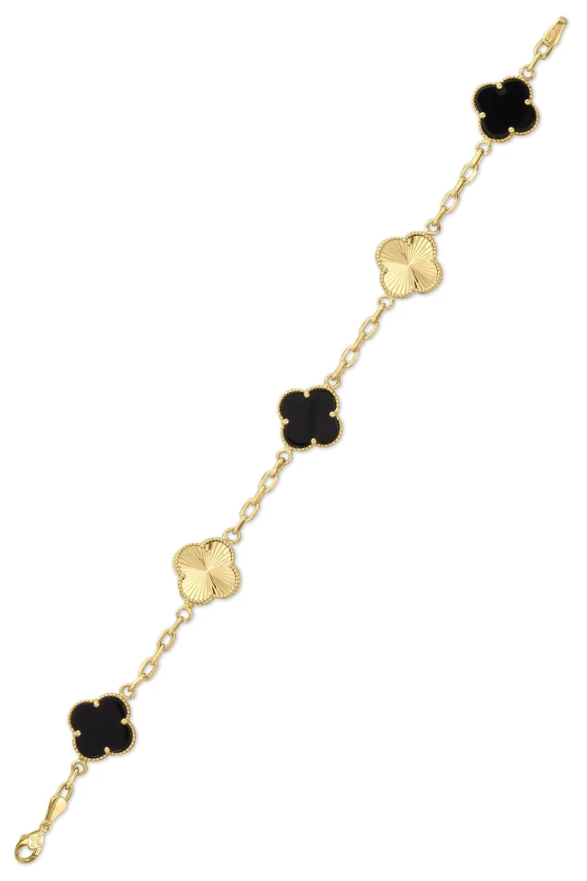14 Ayar şık ve zarif duruşa sahip günlük kullanıma uygun 7.50 gram ağırlığında 18 +2 Cm boyunda altın siyah onix taş ve atlamalı kalemli parça detaylı beşli yonca bileklik.