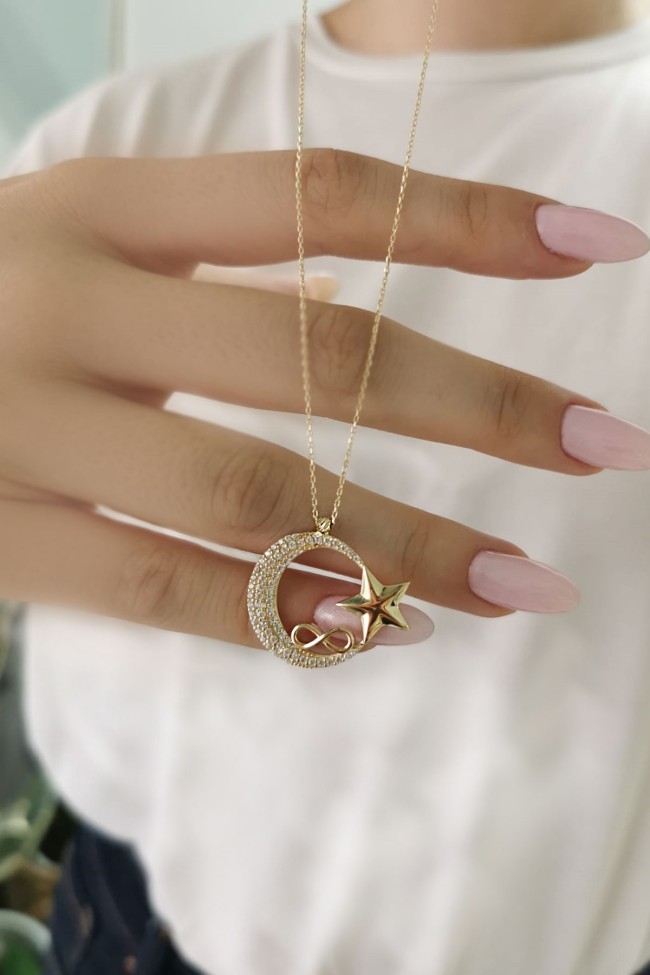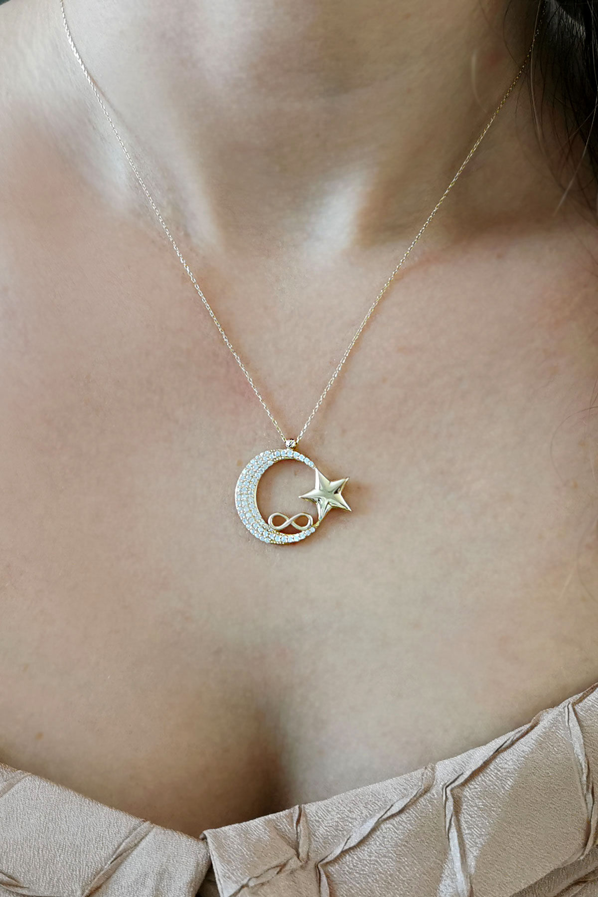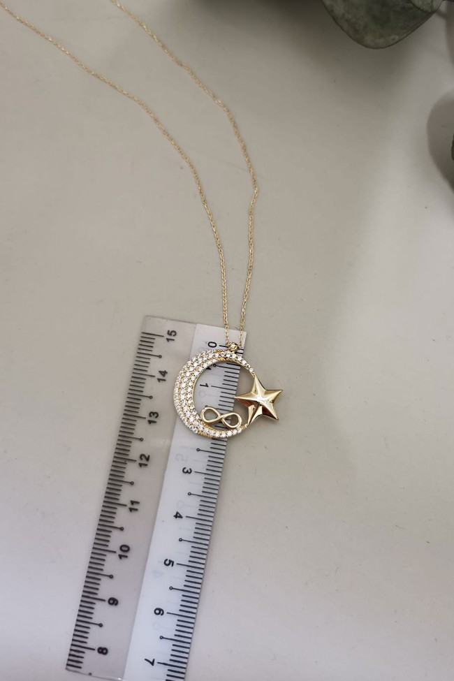 Kan Kırmızı Al Bayrağımızın Rengini Simgeleyen Zirkon Taşlı Sonsuzluk Detaylı 2.2 Cm Boyunda Kendinden 45 Cm Zincirli 14 Ayar Işıl Işıl Günlük Kullanıma Uygun 3.30 Gr. Ağırlığında Altın Milli Gururumuz  Ay Yıldız Kolye.