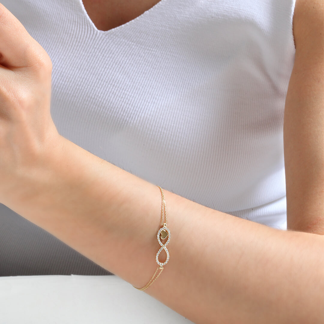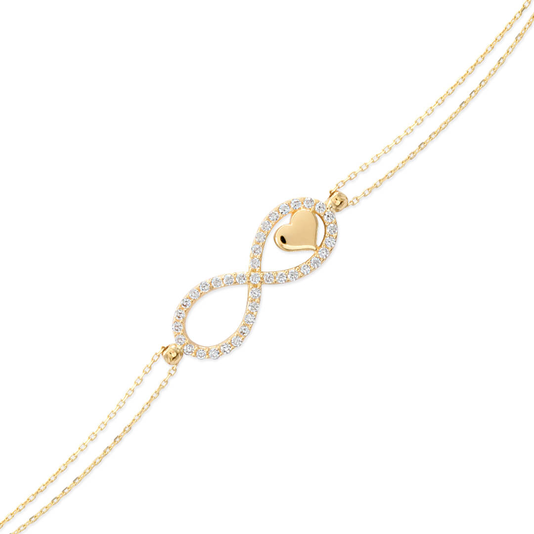 14 ayar altın sonsuzluk ve kalp detaylı günlük kullanıma uygun spor zirkon taşlı bileklik. Model 2,10 gram ağırlığında olup orta detay 2.9 cm boyutundadır, zincir uzunluğu 18 cm dir.
