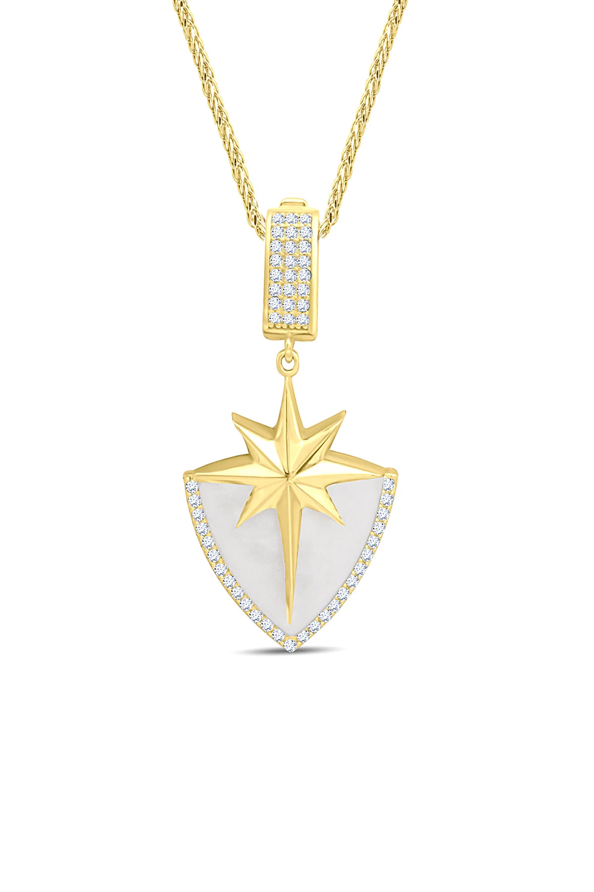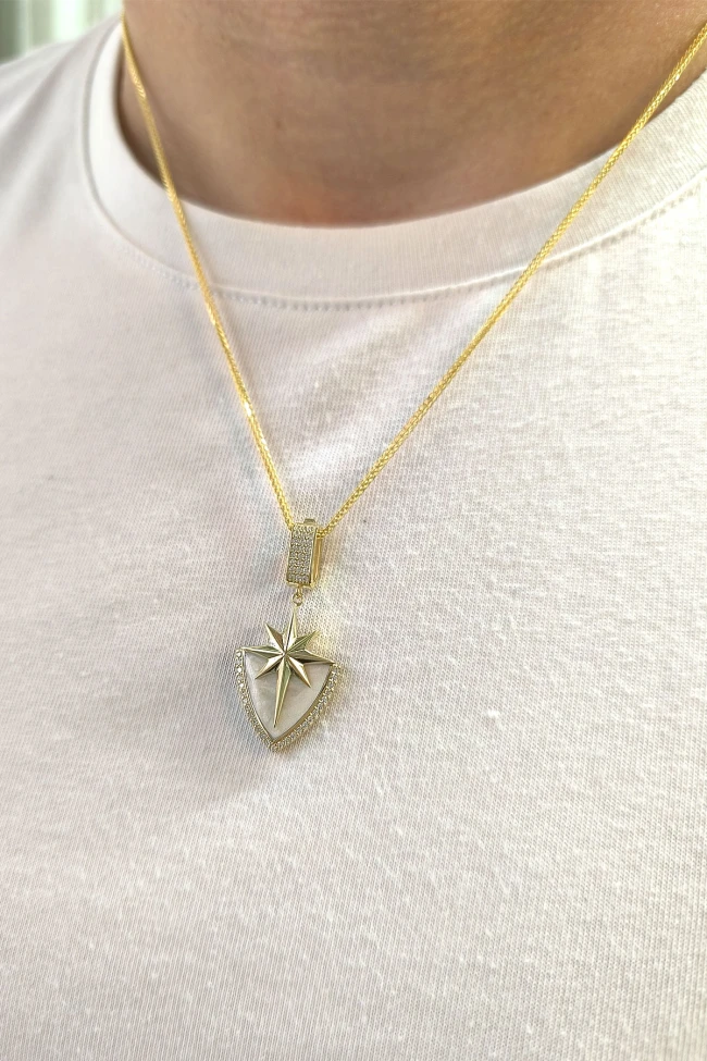 Modern Ve Geometrik Şık Tarzı Beraberinde Taşıyan Unisex Kullanıma Sahip Model 7.70 Gr. Ağırlığında 14 Ayar Altın Beyaz Mineli Kuzey Yıldızı Detaylı Şövalye Kolye.