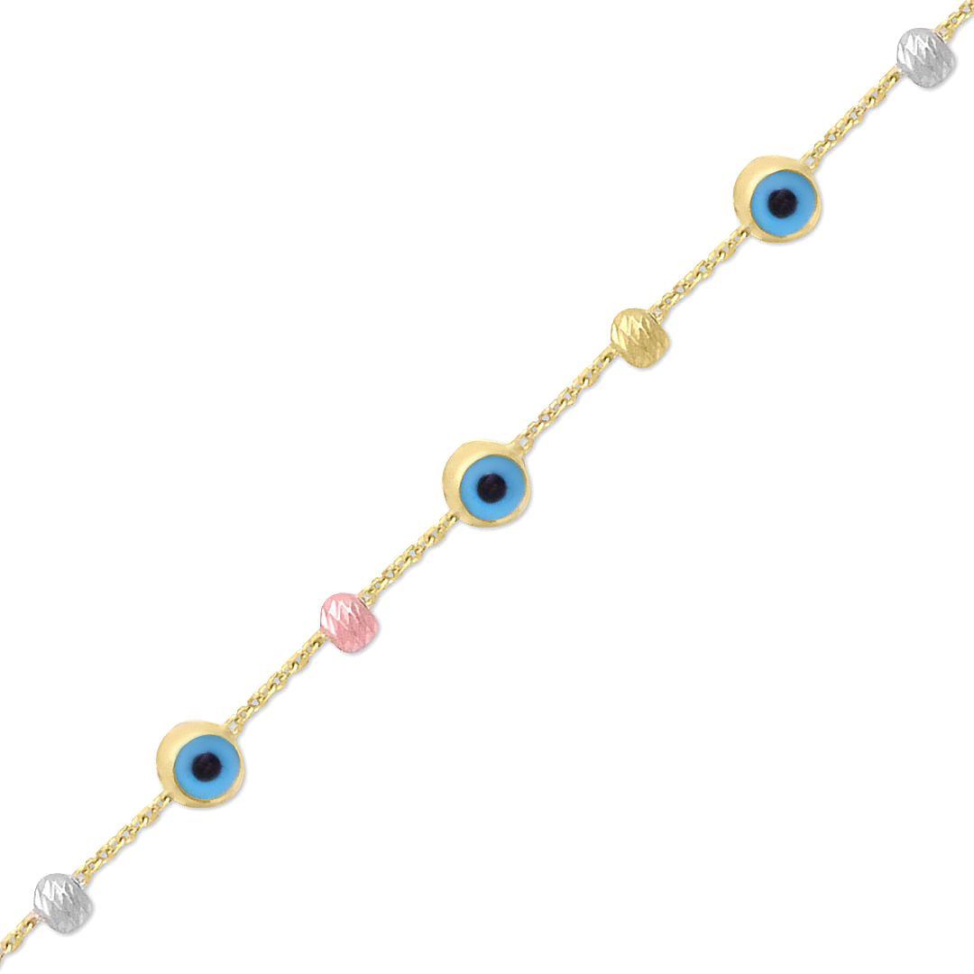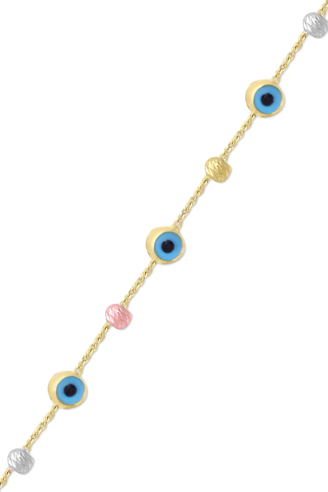 19 Cm boyunda günlük kullanıma uygun nazar boncuklu spor tasarımı ile günlük olarak da kullanabileceğiniz 14 ayar 2.40 gr ağırlığında altın kadın bileklik.