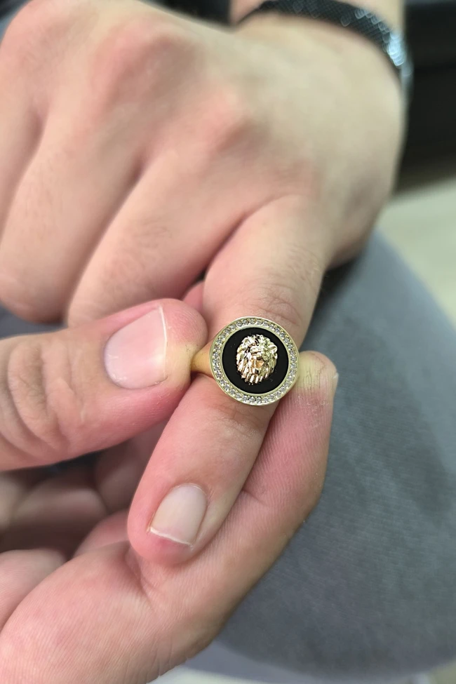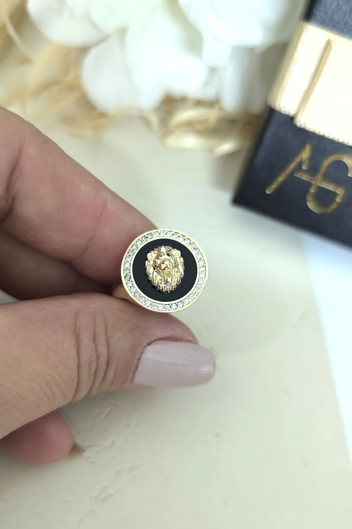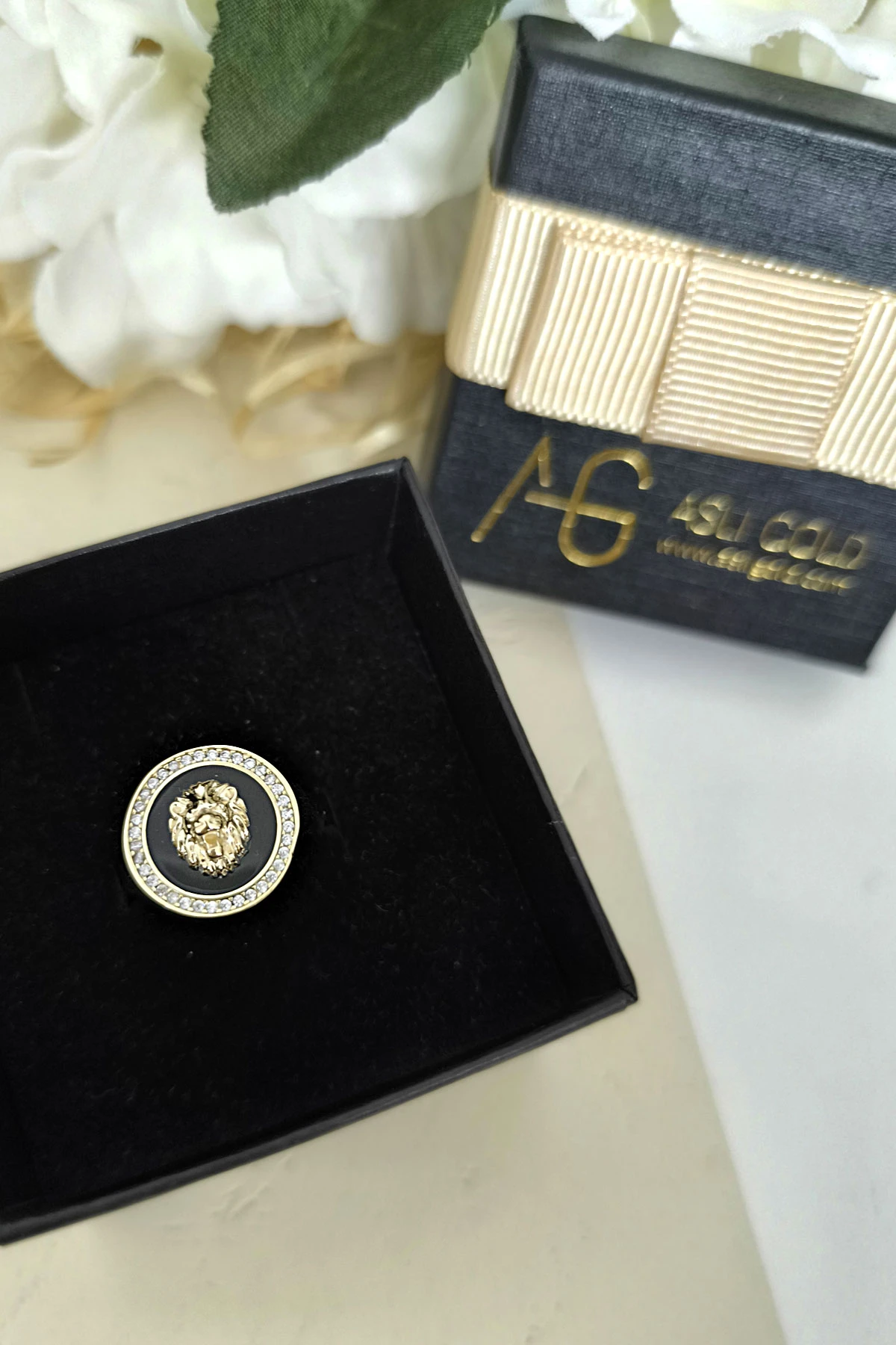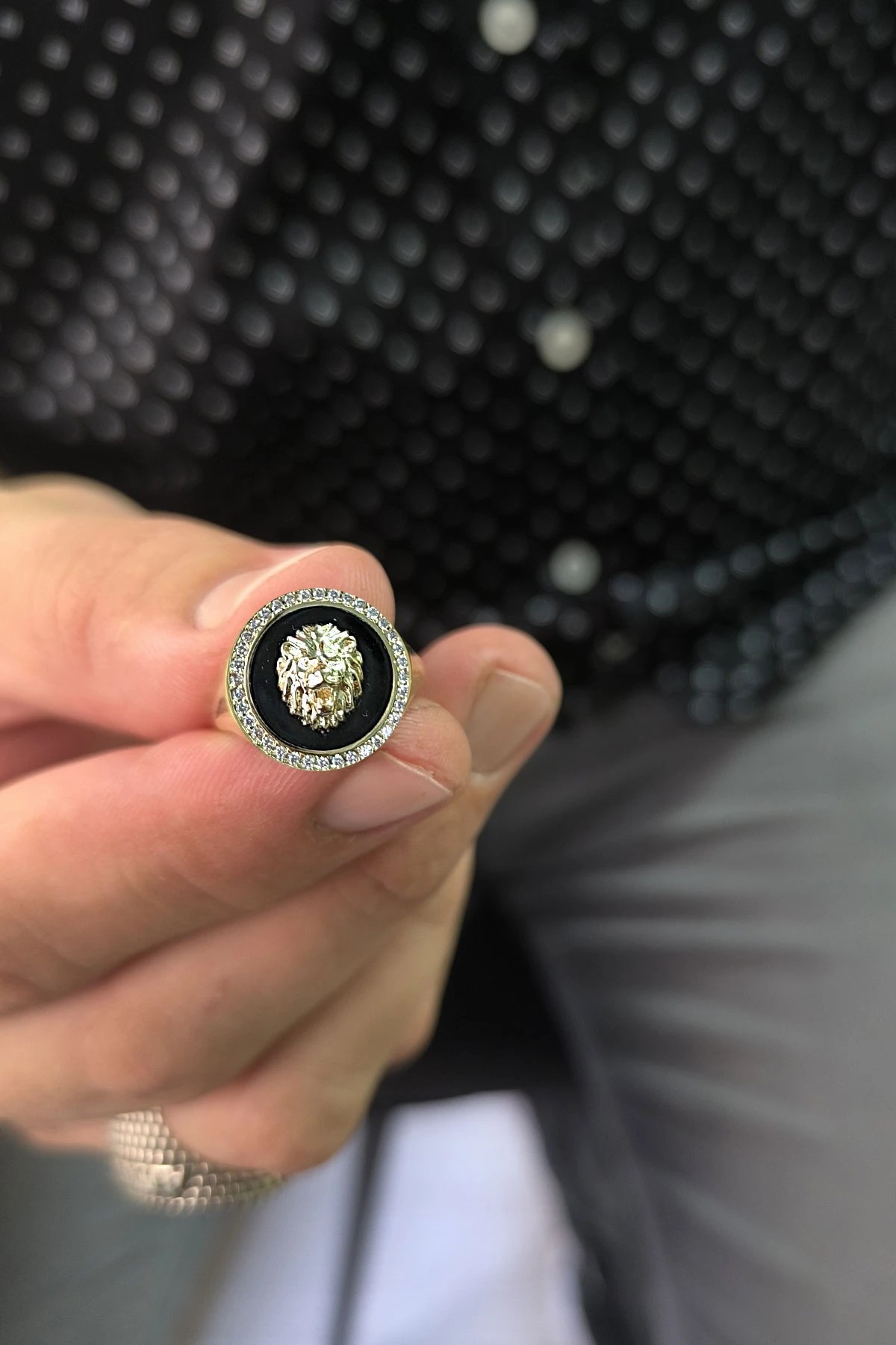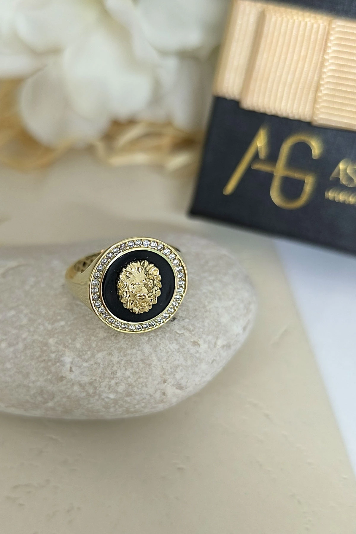 14 ayar sarı altın günlük kullanıma uygun 4.35 gram ağırlığında altın taş detaylı spor mineli yuvarlak aslan model unisex yüzük.