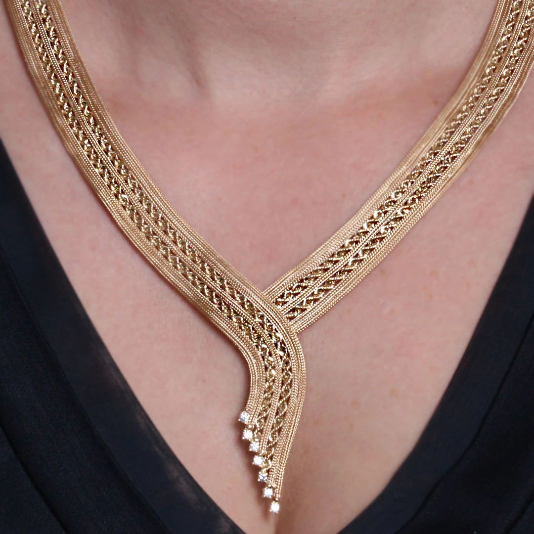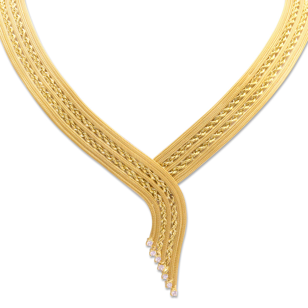 14 Ayar Kalze ve Halat Burgu Zincirlerin Kombinasyonu İle Tasarlanmış Gösterişli Ve Havalı Bir Modele Sahip Altın Ucu Taş Detaylı Gerdanlık.