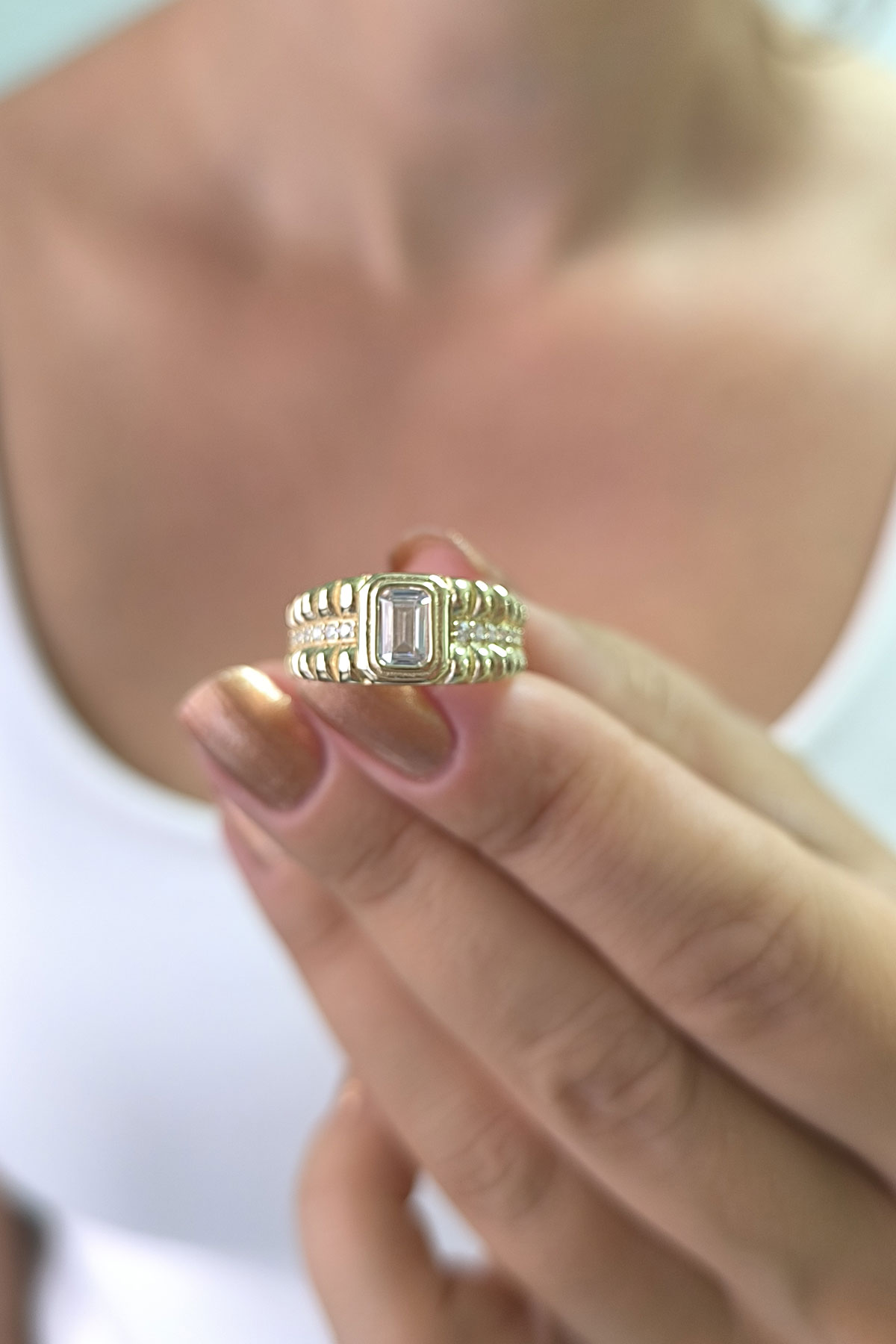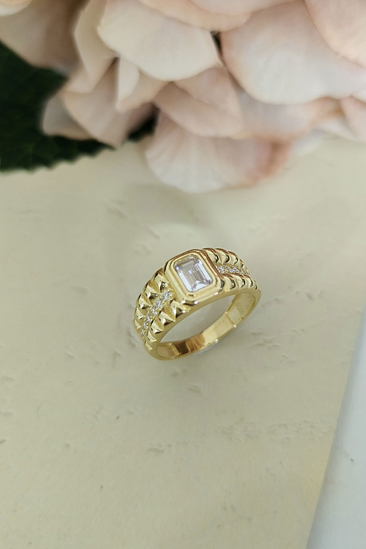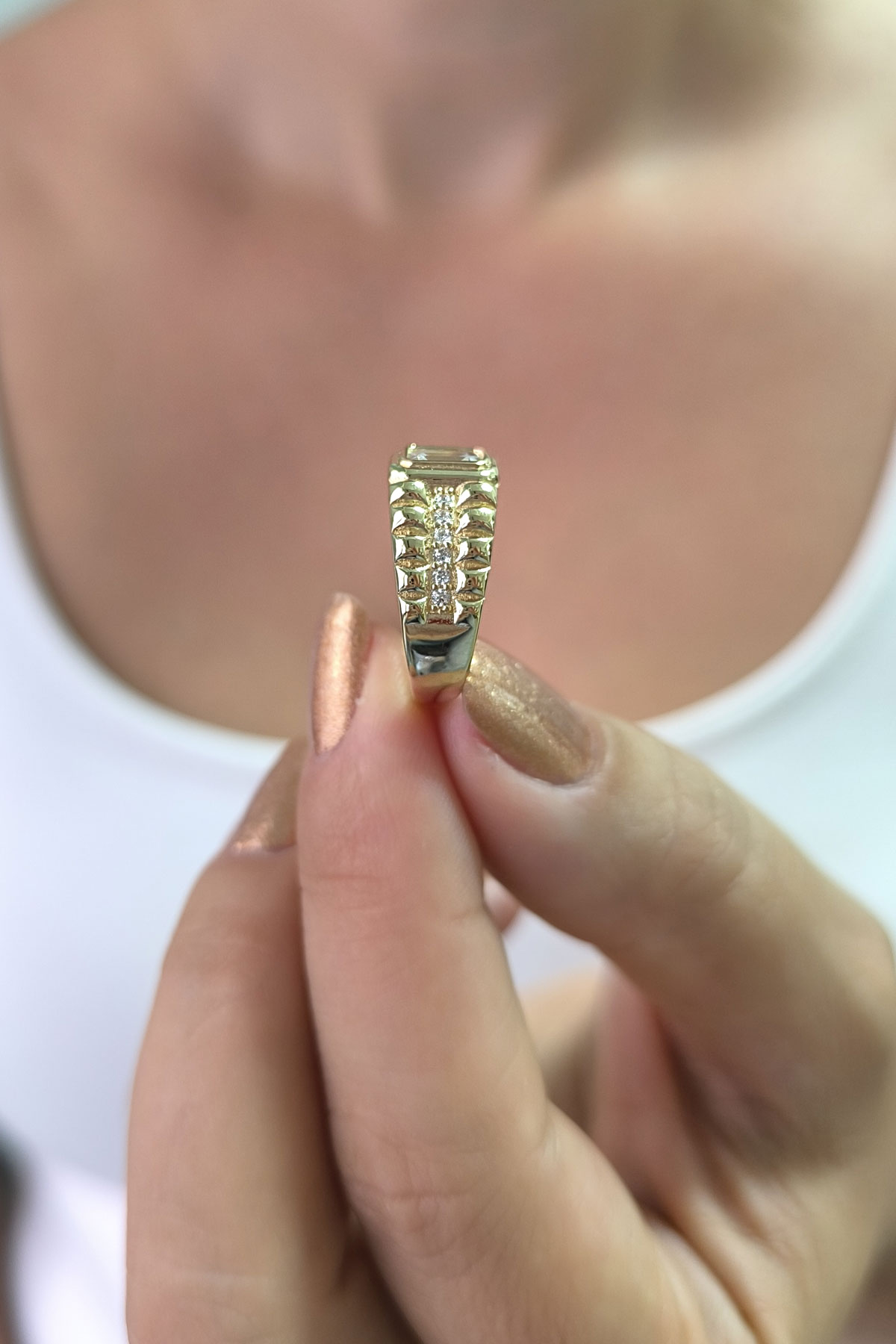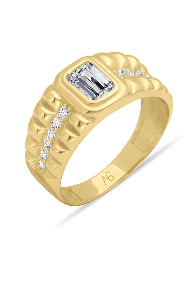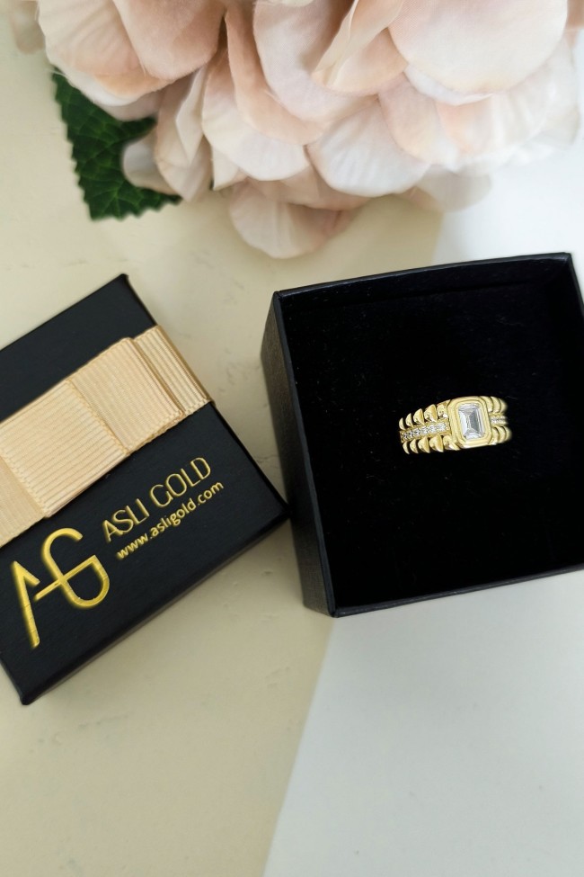 Tasarım model beyaz baget taşlı 14 ayar sarı altın tasarımıyla günlük kullanıma uygun 3.90 gram ağırlığında modern ve tarz kadın yüzük.