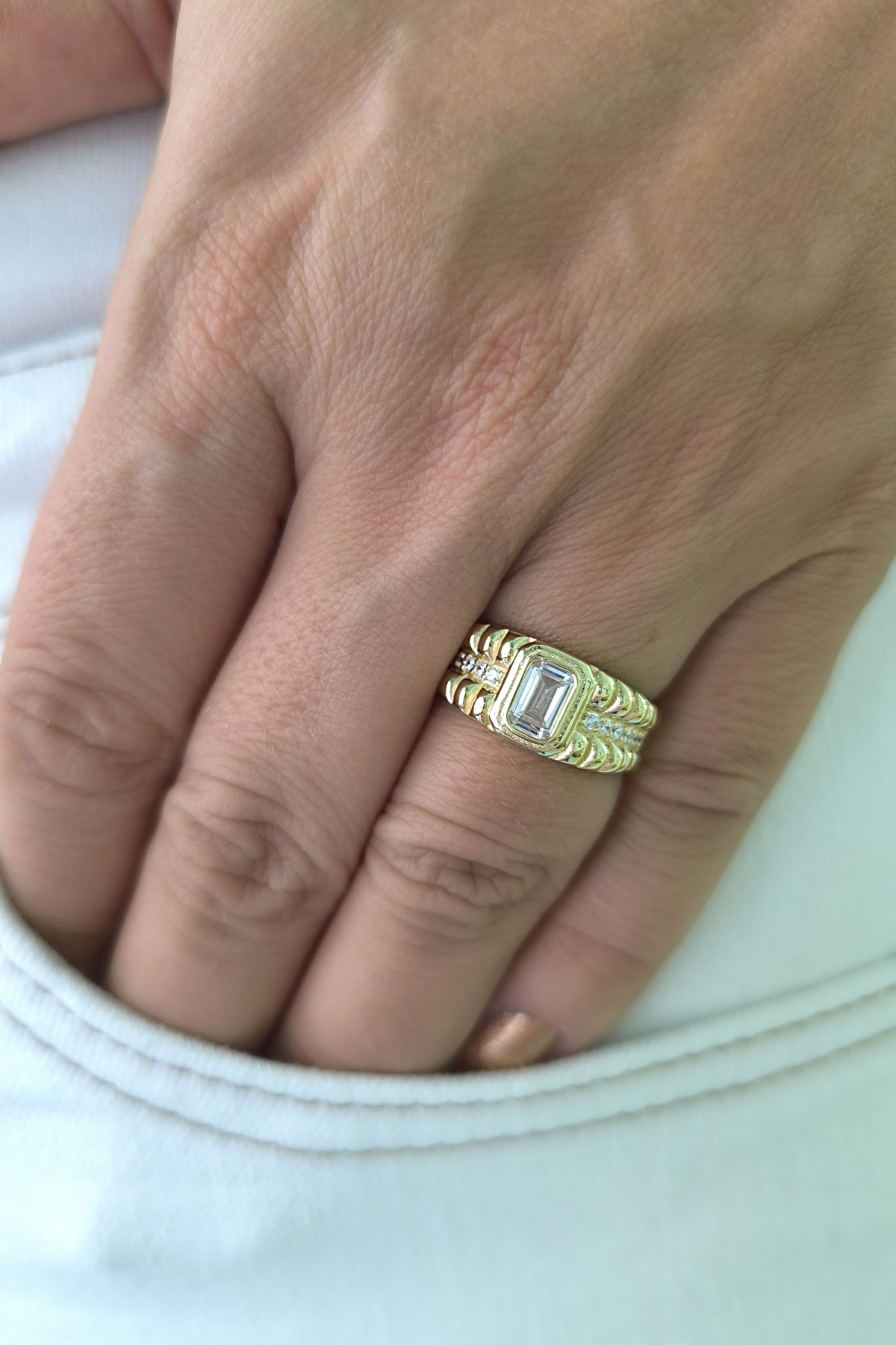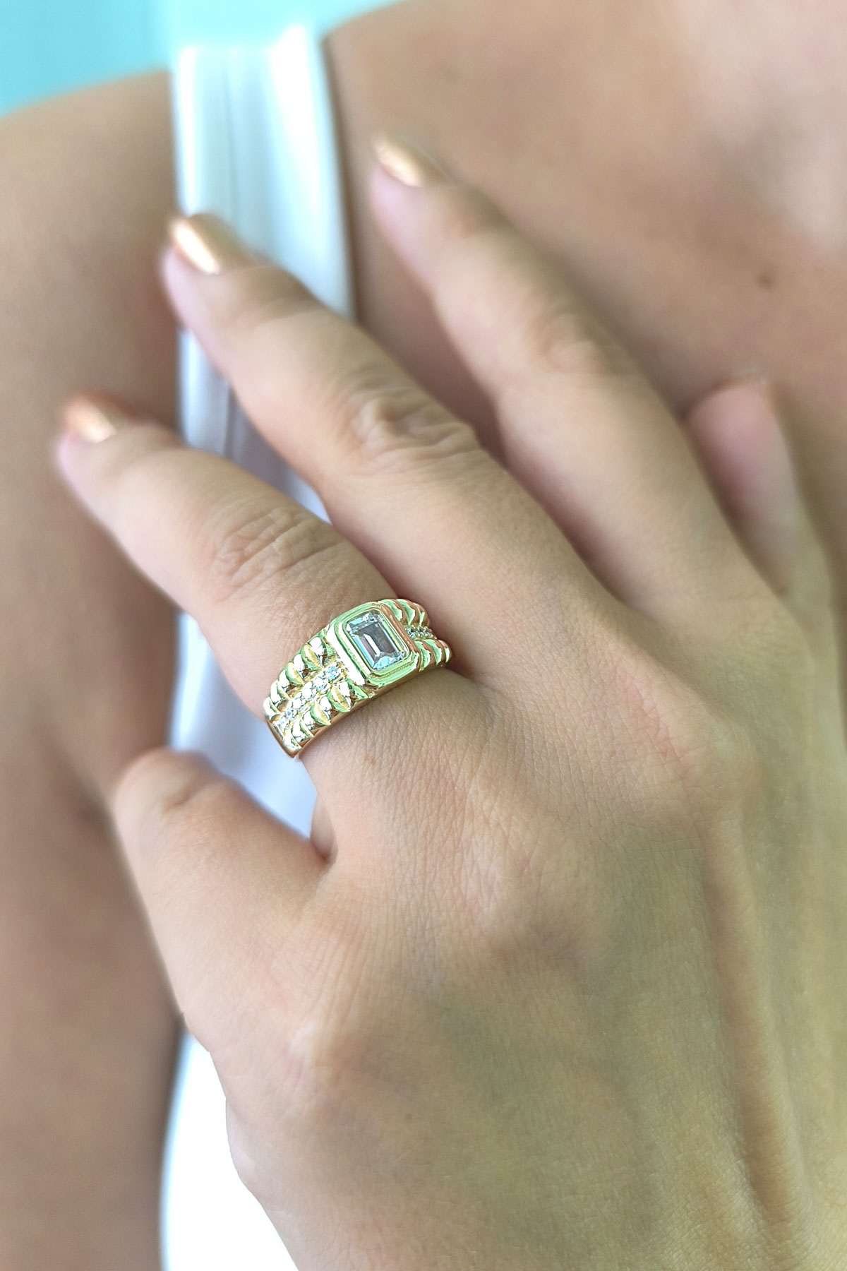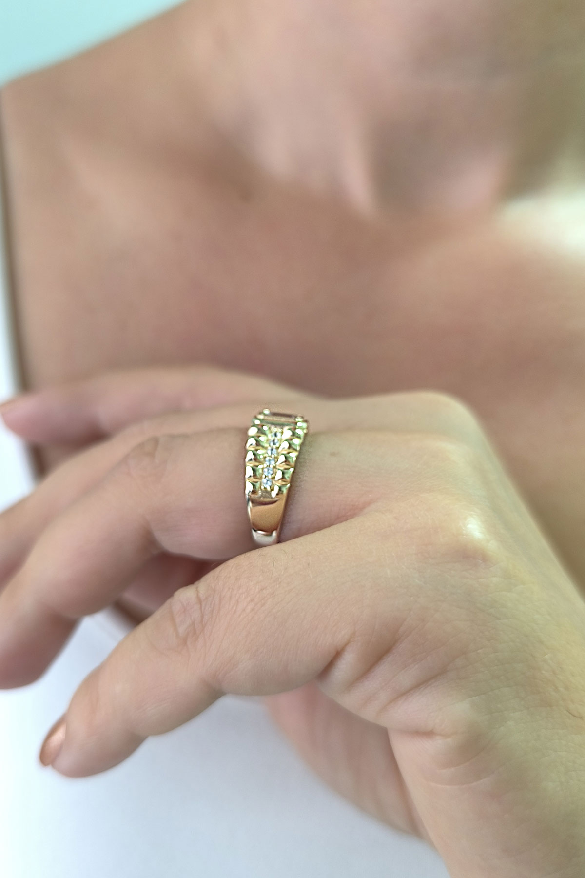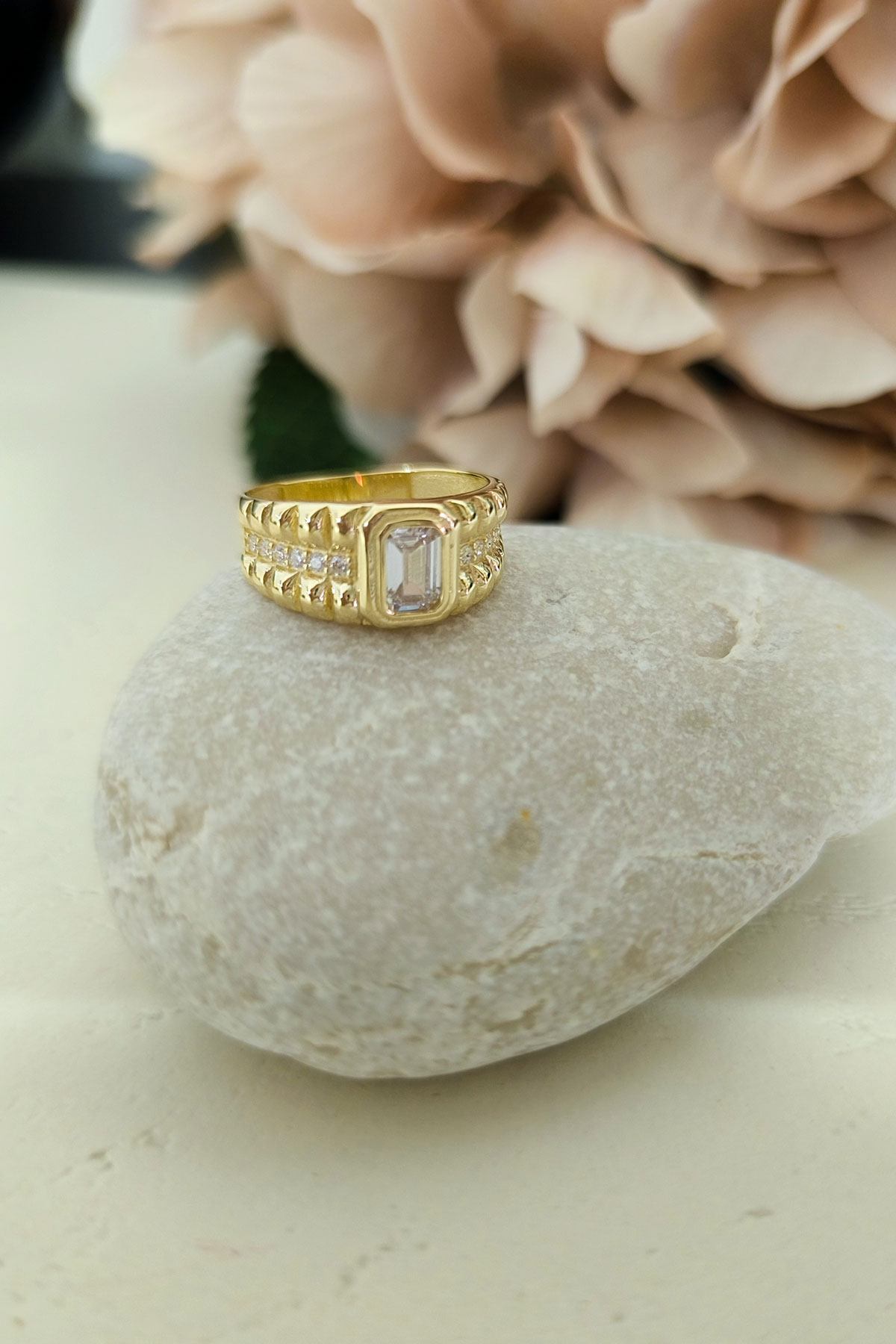Tasarım model beyaz baget taşlı 14 ayar sarı altın tasarımıyla günlük kullanıma uygun 3.90 gram ağırlığında modern ve tarz kadın yüzük.