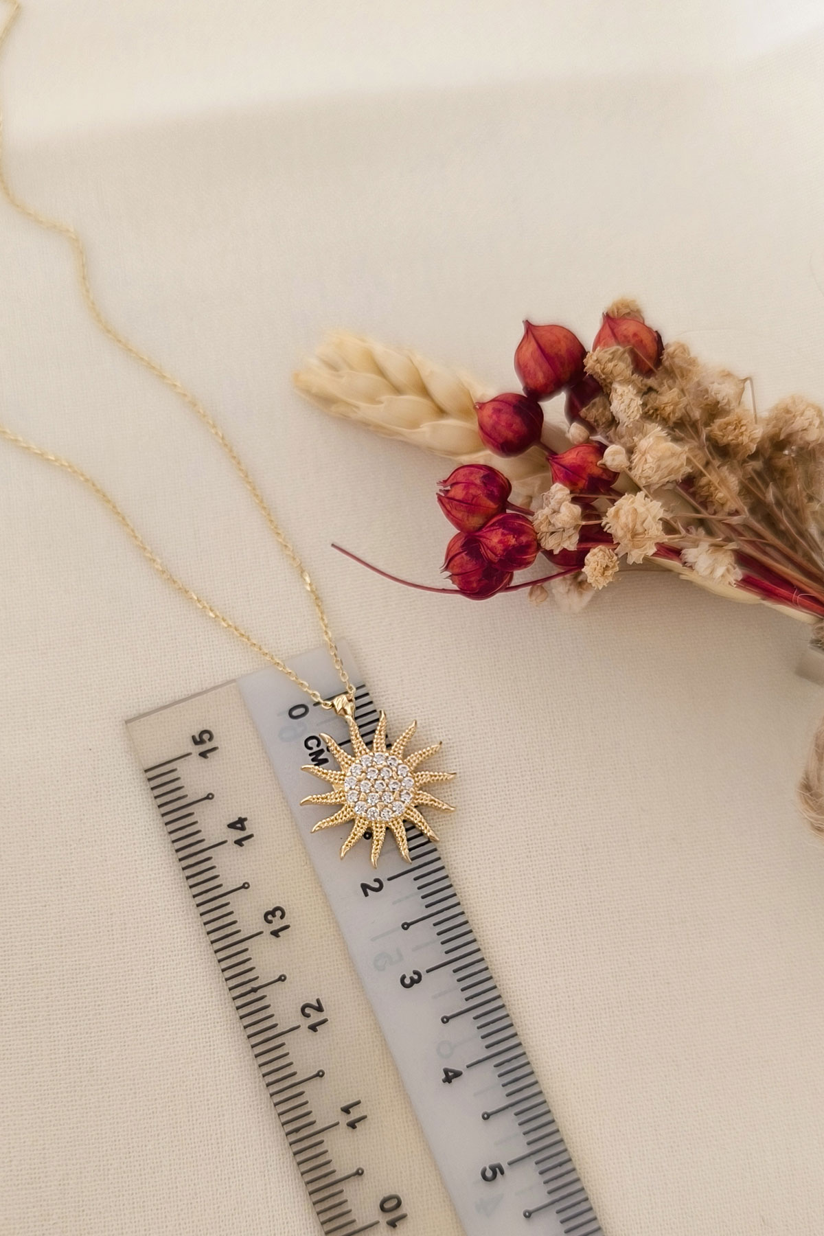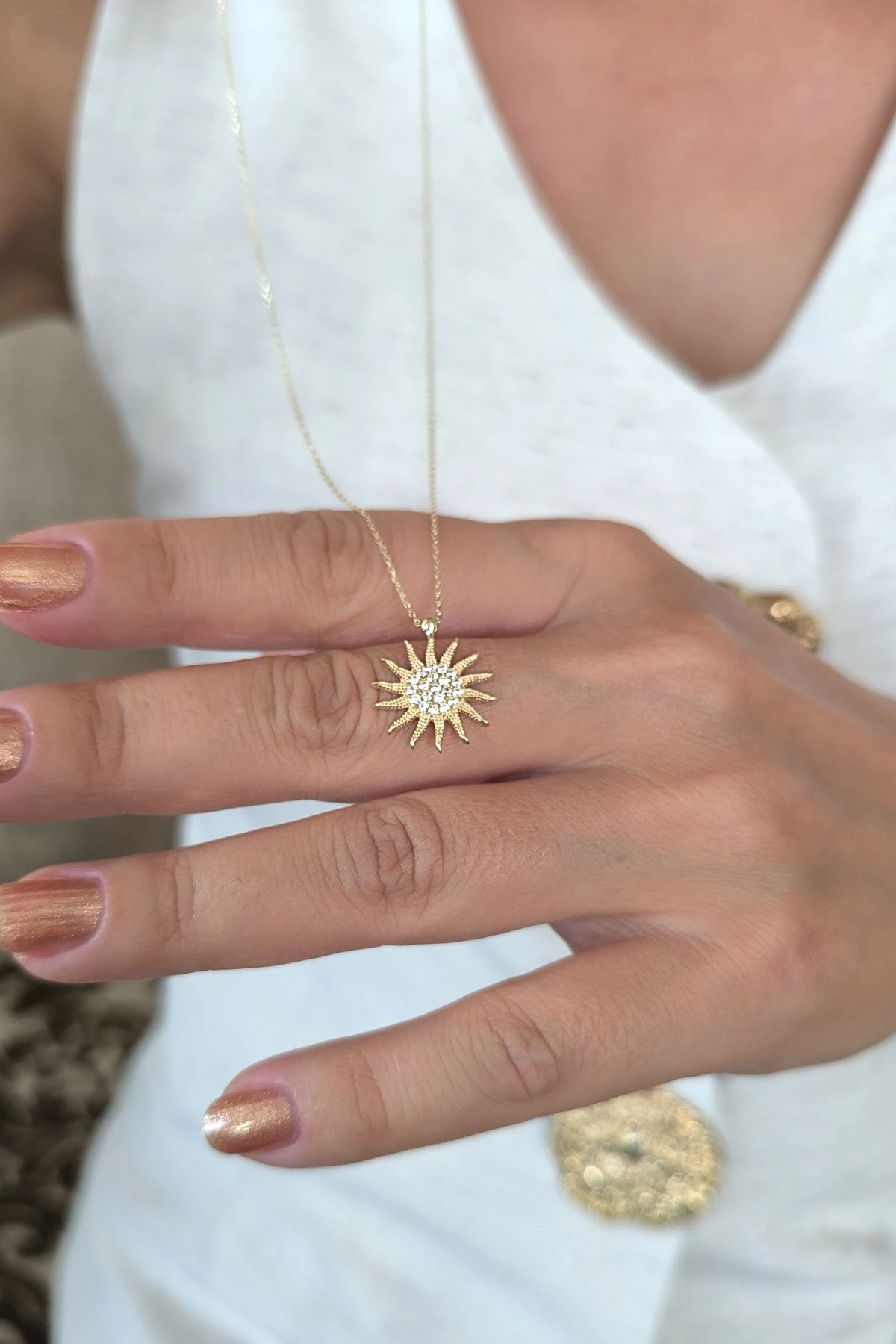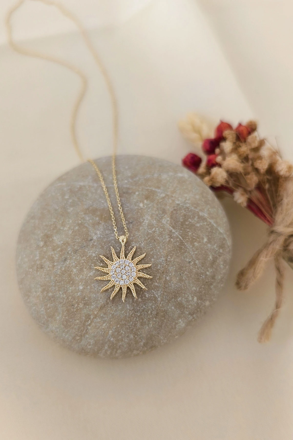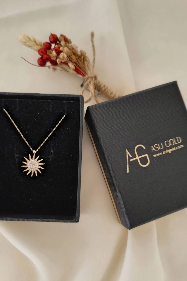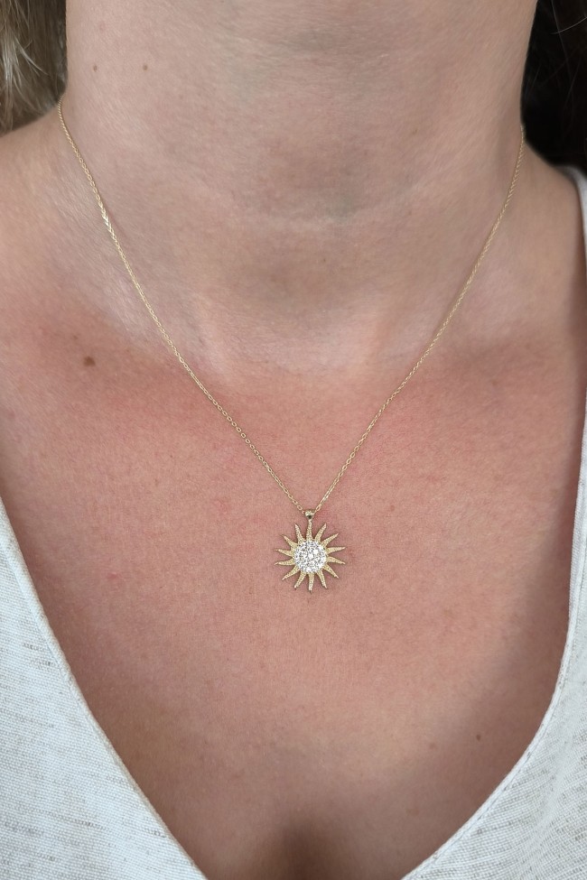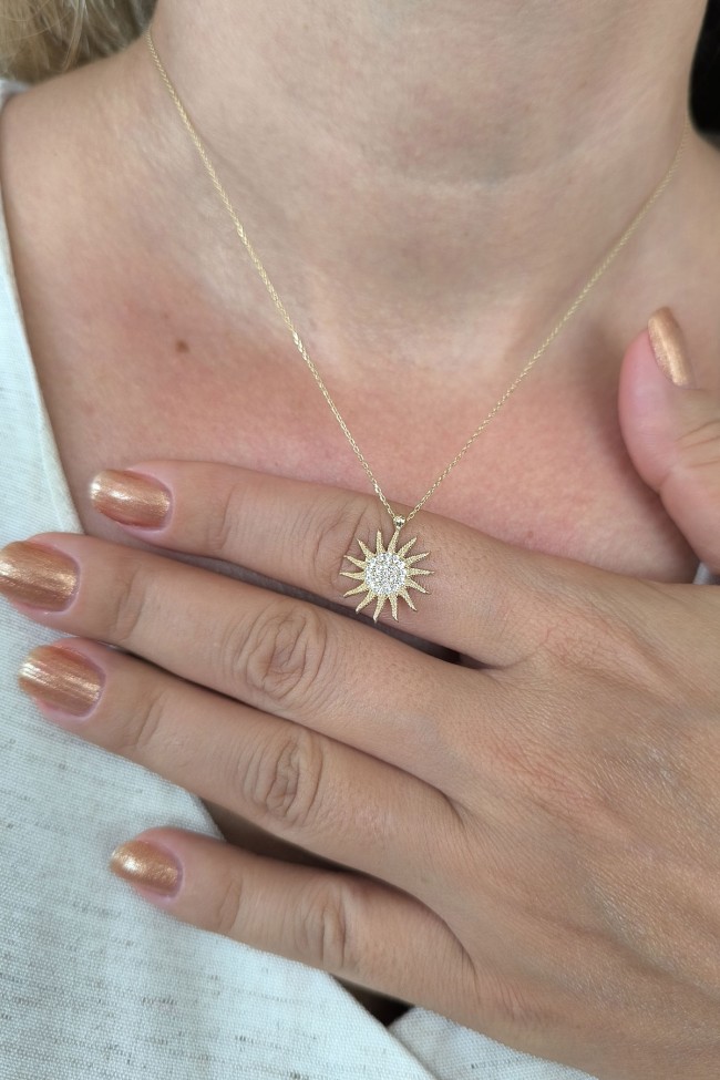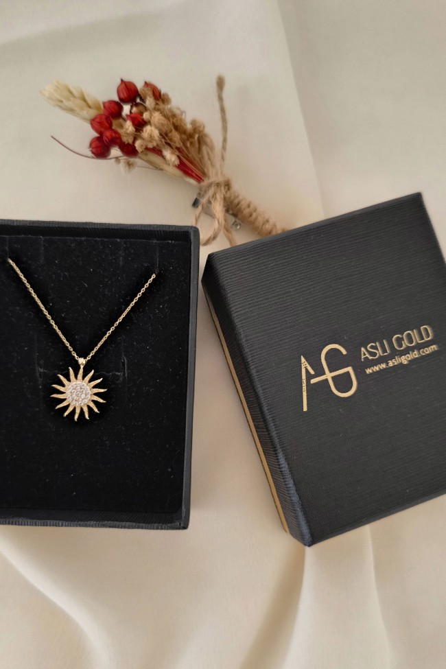 45 Cm zincirli 2.70 gr. 1.8 cm boyutunda taşlı model 14 ayar altın spor güneş kolye. Farklı zincirleriniz ve kolyelerinizle bir arada kombine olarak kullanabileceğiniz minimal harika bir model.