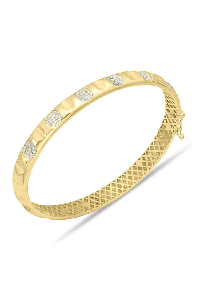 14 Ayar şık iç bükey tasarımlı modeliyle oldukça gösterişli ve elit duruşa sahip 10.40 gram ağırlığında altın zirkon taş detaylı füzyon bilezik.