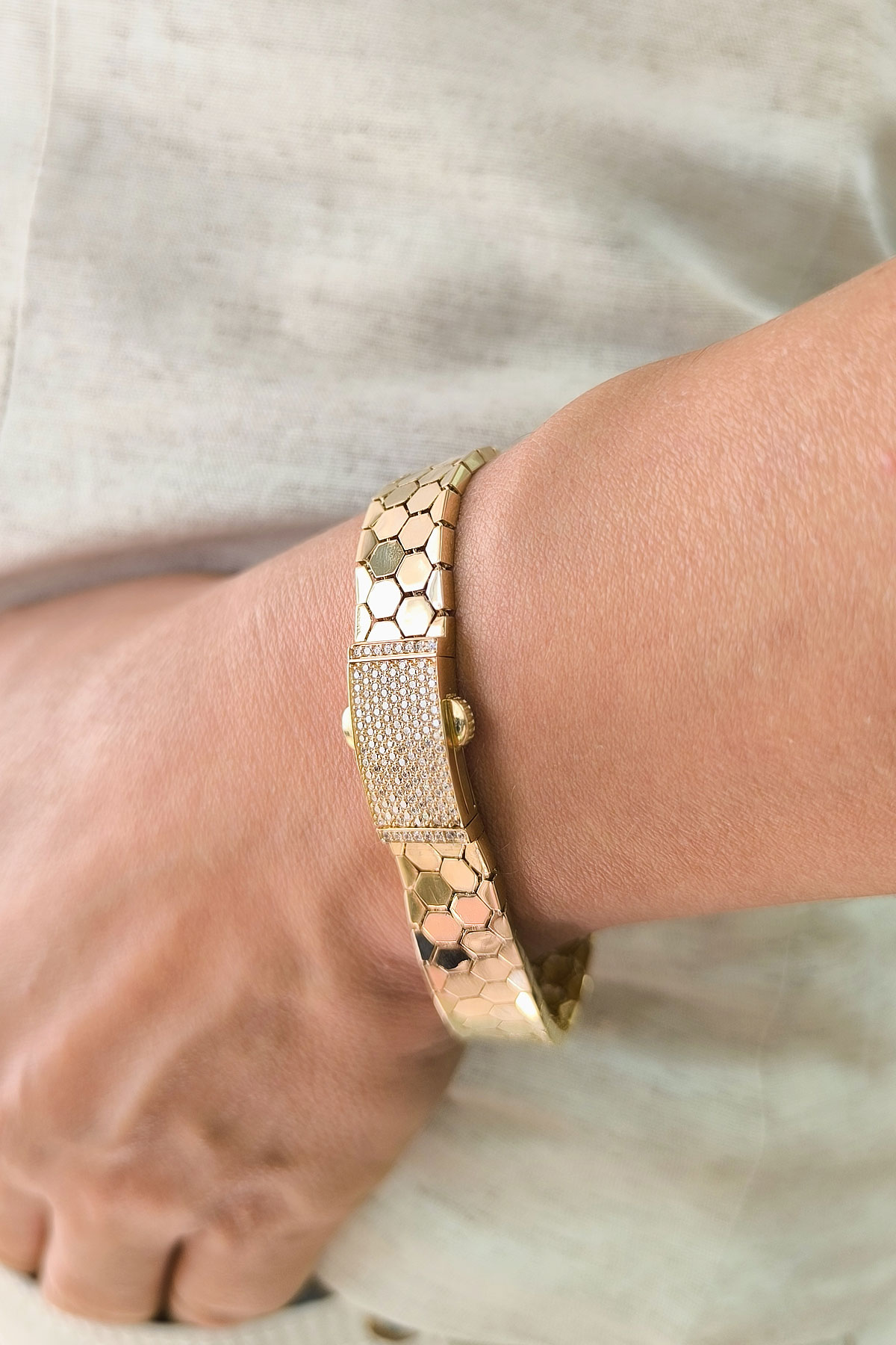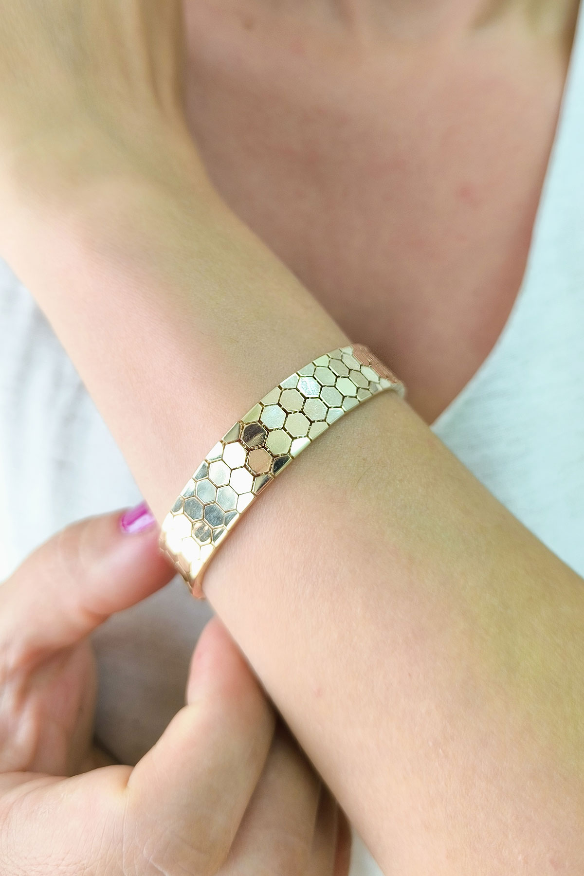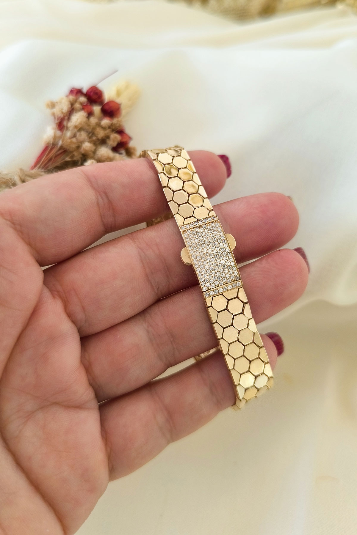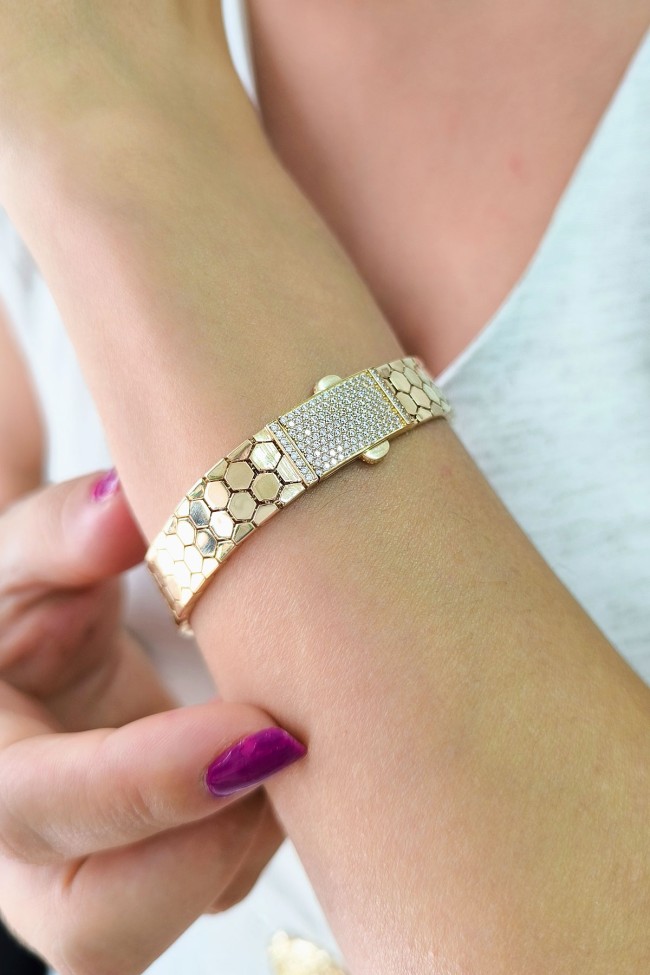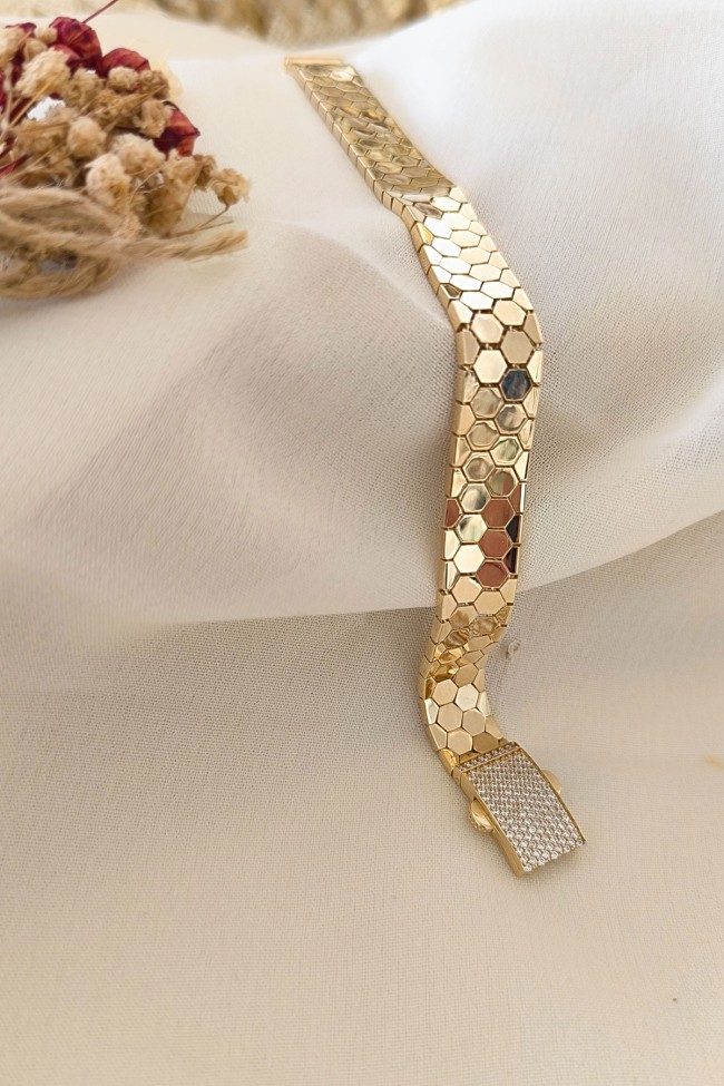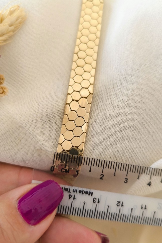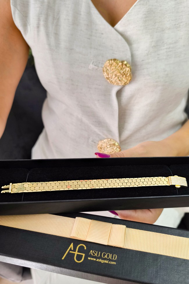 14 Ayar şık ve modern tasarım günlük kullanıma uygun taşsız ışıl ışıl balık pulu model tasarım 15.20 gram ağırlığında 10 mm eninde altın taşlı kilit bileklik.