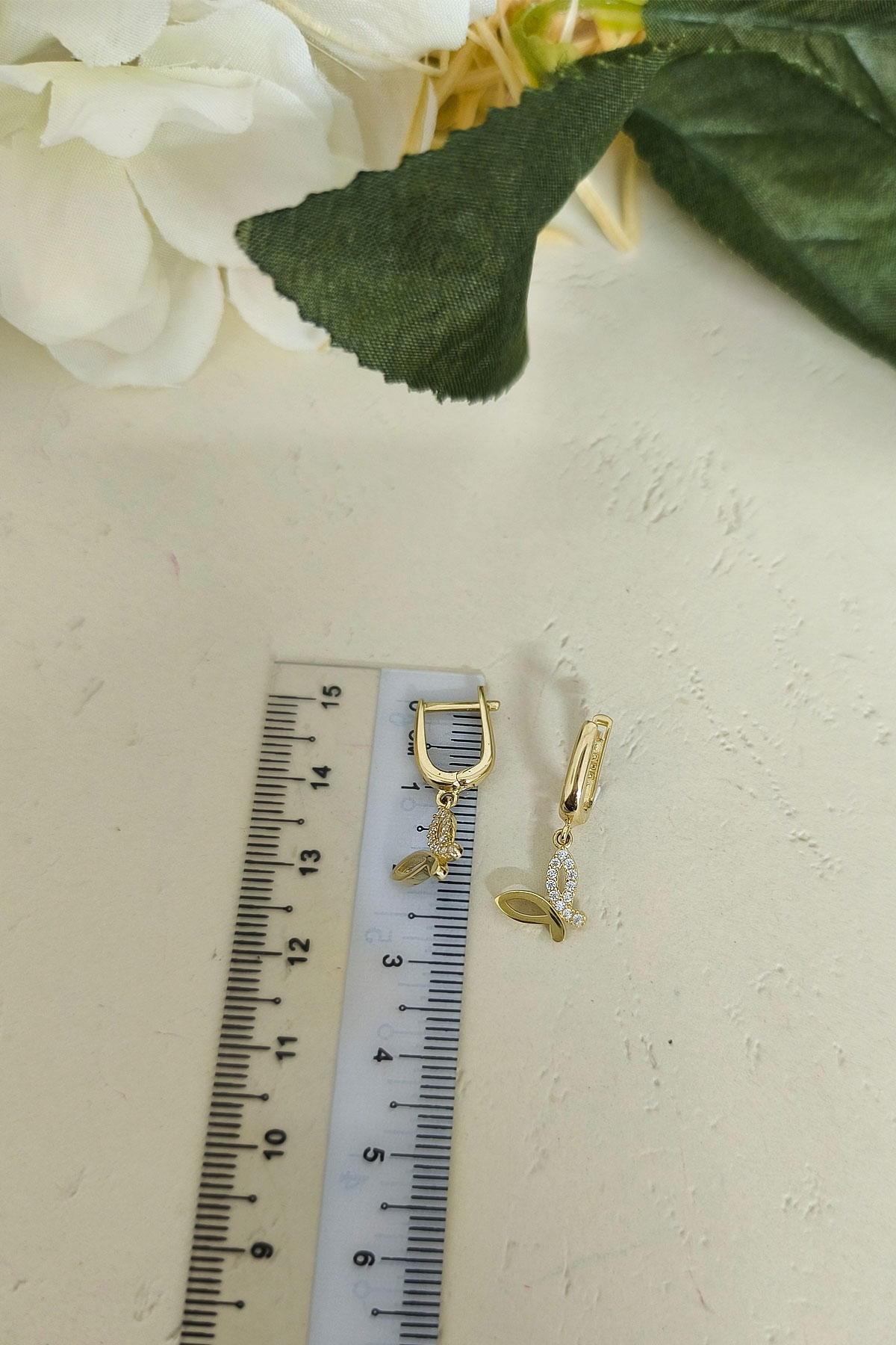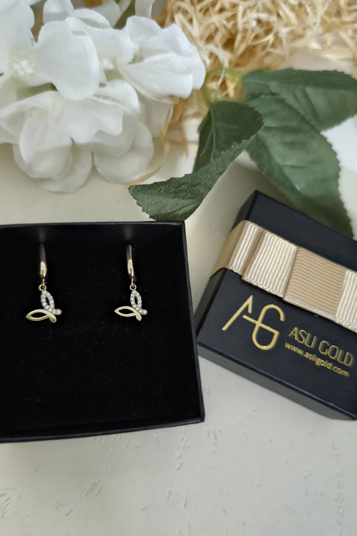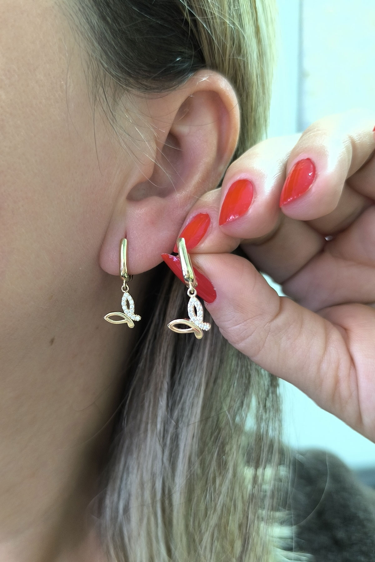 2.70 Gram Ağırlığında 2.3 Cm Minimal Sallantılı Kelebek Model Zirkon Taşlı Günlük, Modern Ve Şık Bir Duruşa Sahip 14 Ayar Altın Kadın Küpe.
