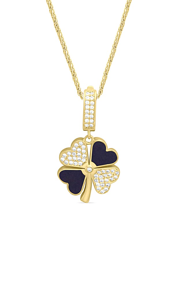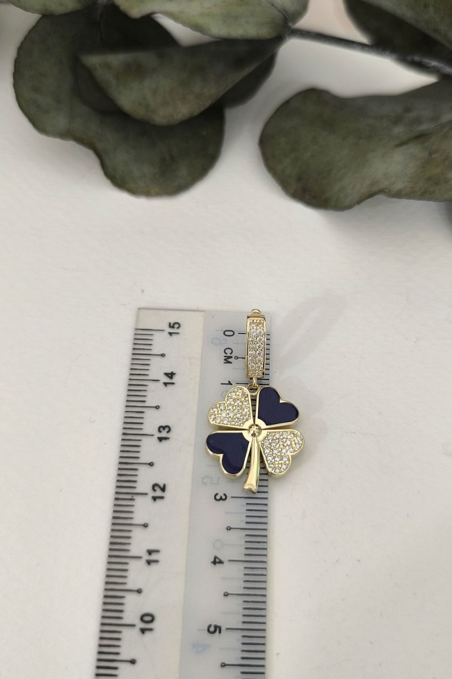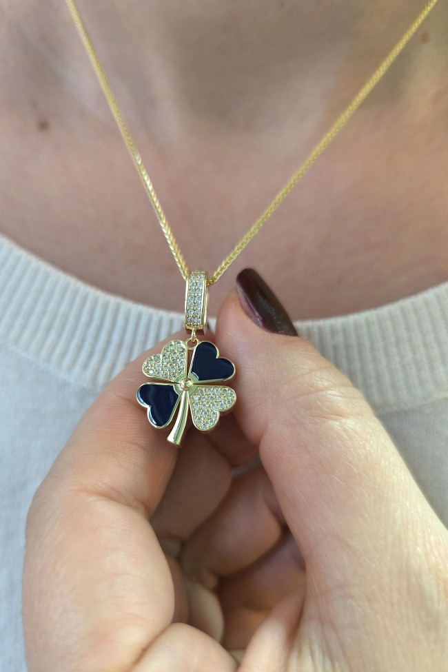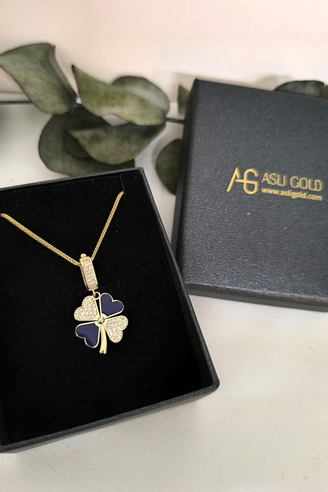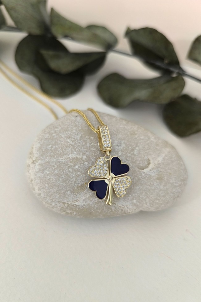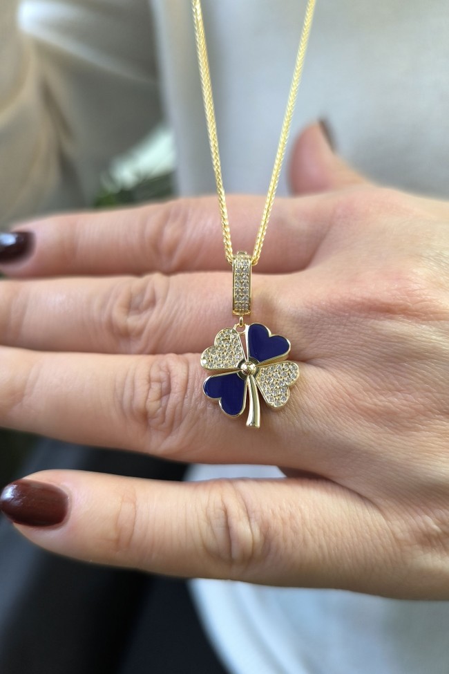 5.20 gr. 3 cm boyutunda zirkon taşlı model 14 ayar altın lacivert mineli yonca model charm kilit kolye. Farklı kolyelerinizle bir arada kombine olarak kullanabileceğiniz harika ve gösterişli bir model.