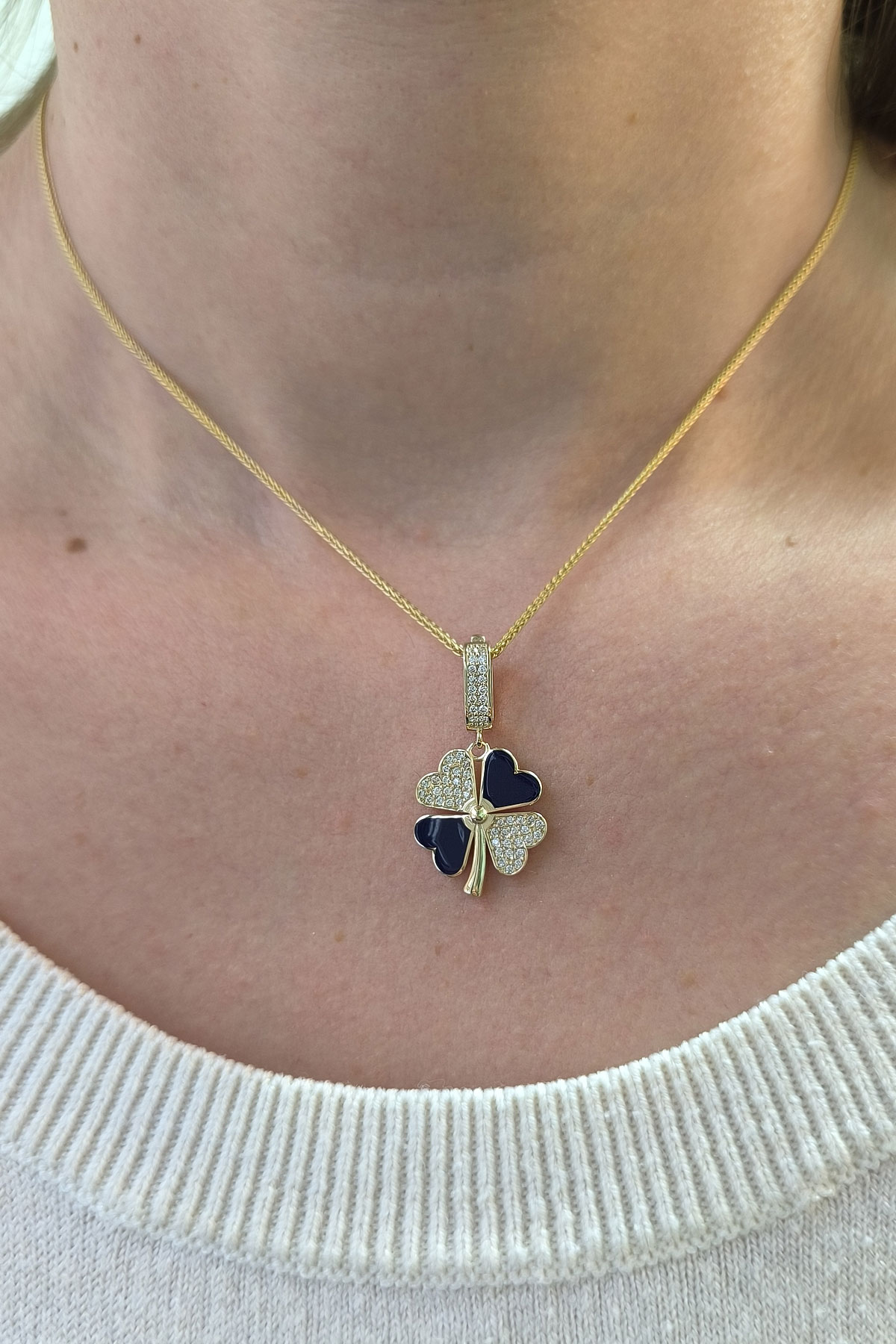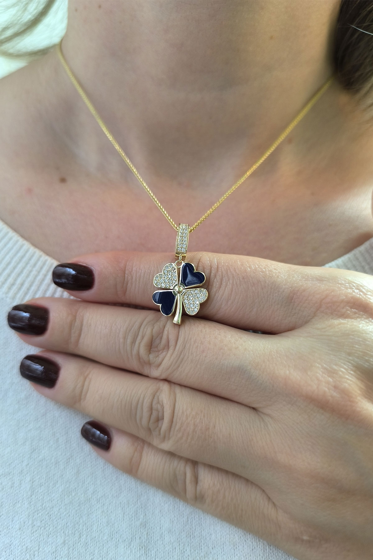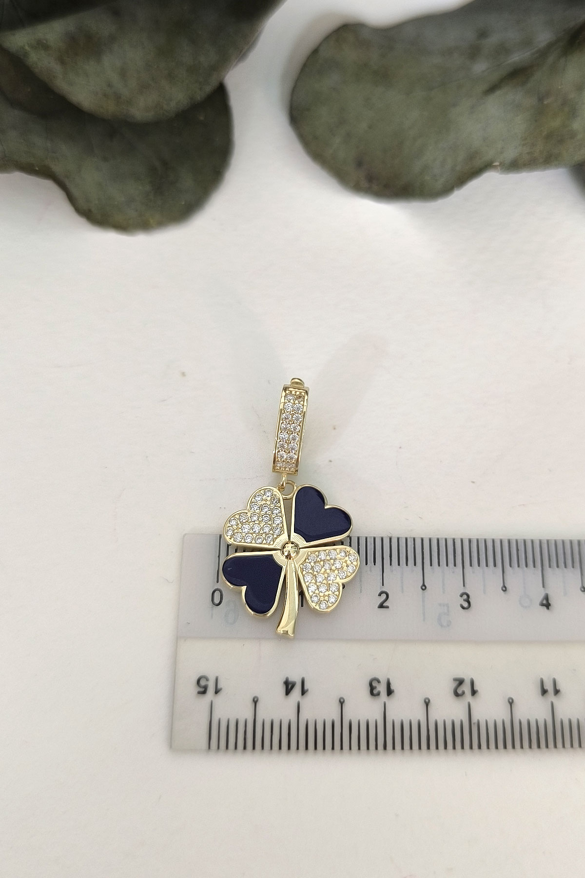 5.20 gr. 3 cm boyutunda zirkon taşlı model 14 ayar altın lacivert mineli yonca model charm kilit kolye. Farklı kolyelerinizle bir arada kombine olarak kullanabileceğiniz harika ve gösterişli bir model.