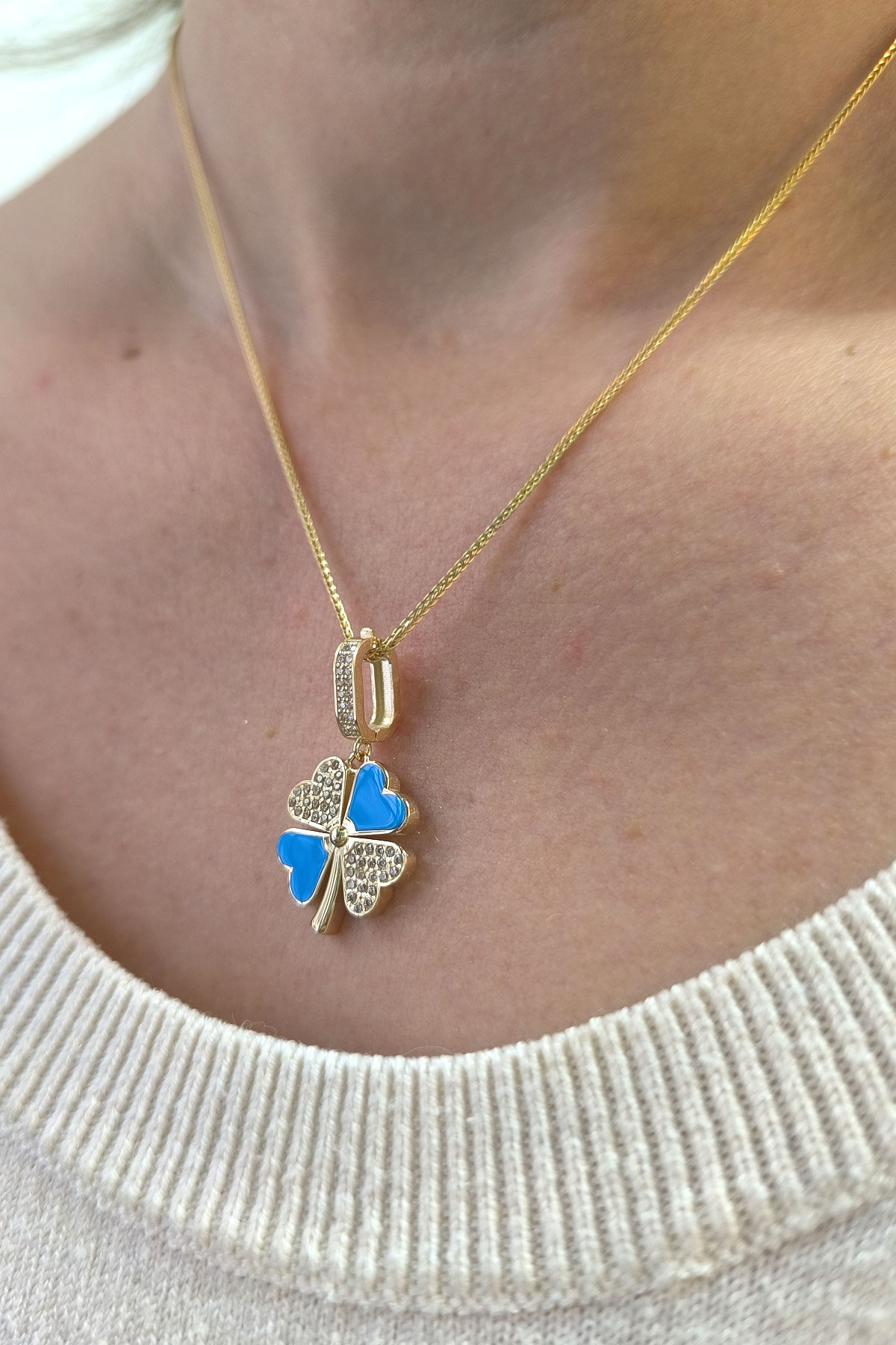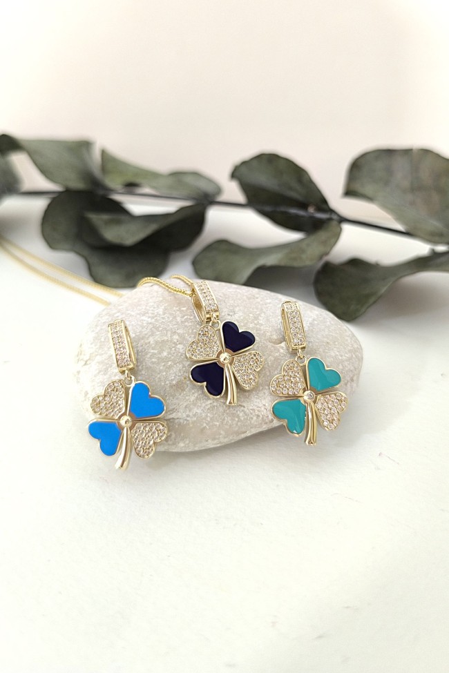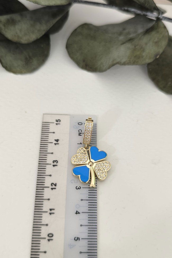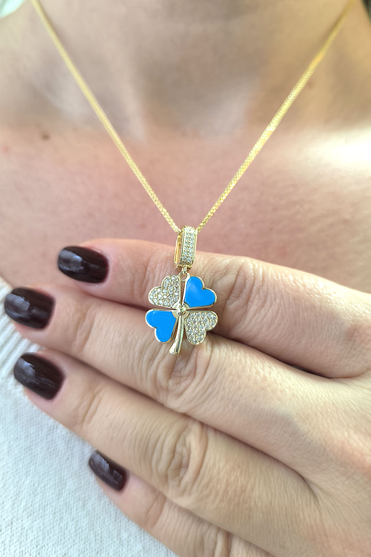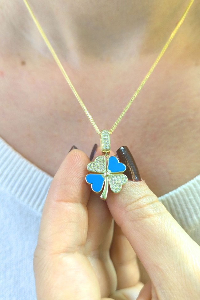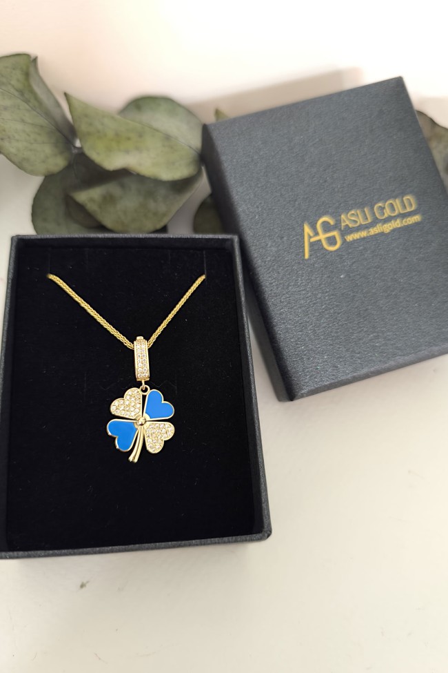 5.20 gr. 3 cm boyutunda zirkon taşlı model 14 ayar altın mavi mineli yonca model charm kilit kolye. Farklı kolyelerinizle bir arada kombine olarak kullanabileceğiniz harika ve gösterişli bir model.