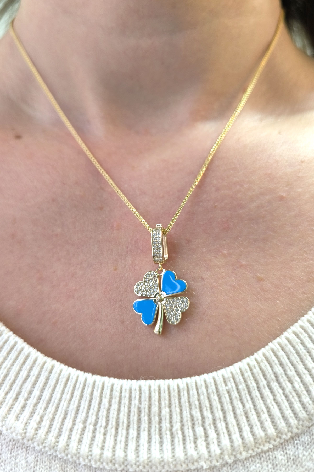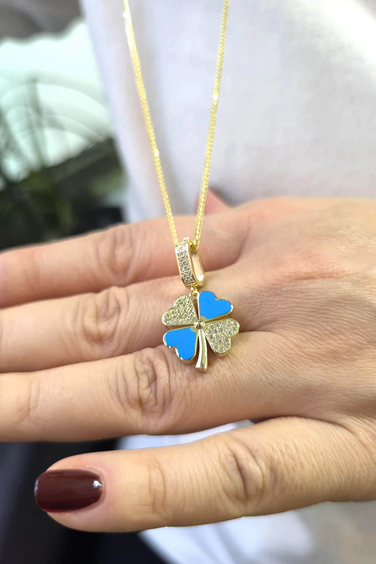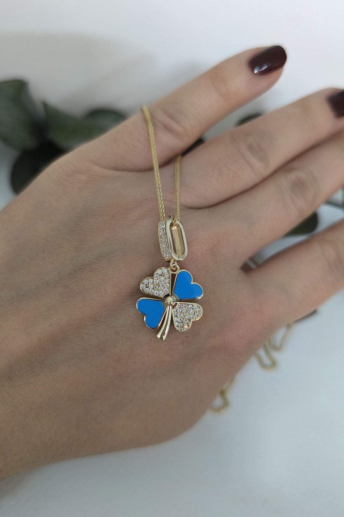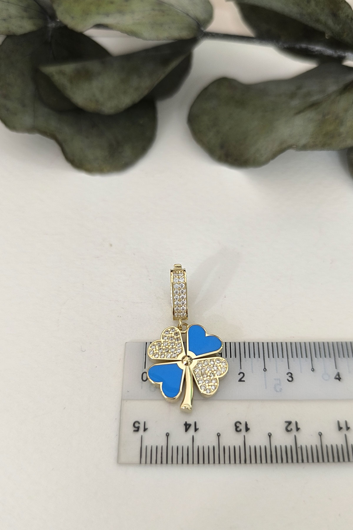 5.20 gr. 3 cm boyutunda zirkon taşlı model 14 ayar altın mavi mineli yonca model charm kilit kolye. Farklı kolyelerinizle bir arada kombine olarak kullanabileceğiniz harika ve gösterişli bir model.