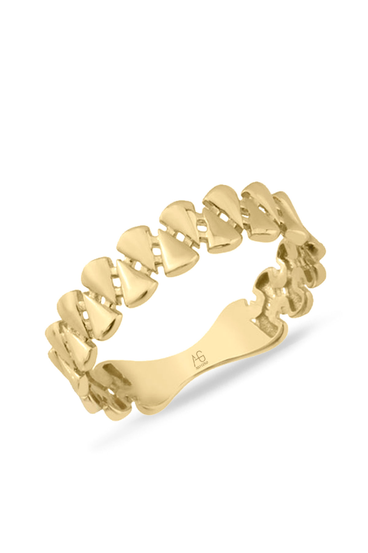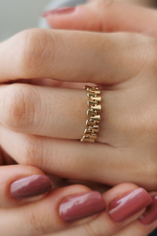 14 ayar sarı altın modern tasarımıyla günlük kullanıma uygun 1.70 gram ağırlığında bloklu taşsız detaylı yarım tur kadın yüzük.