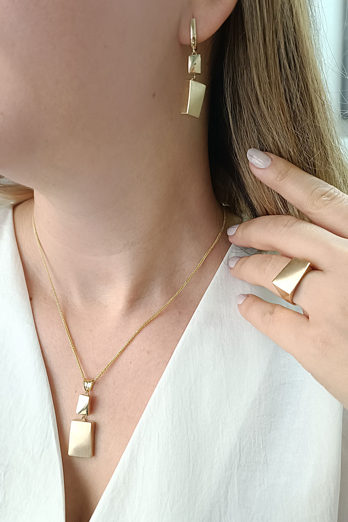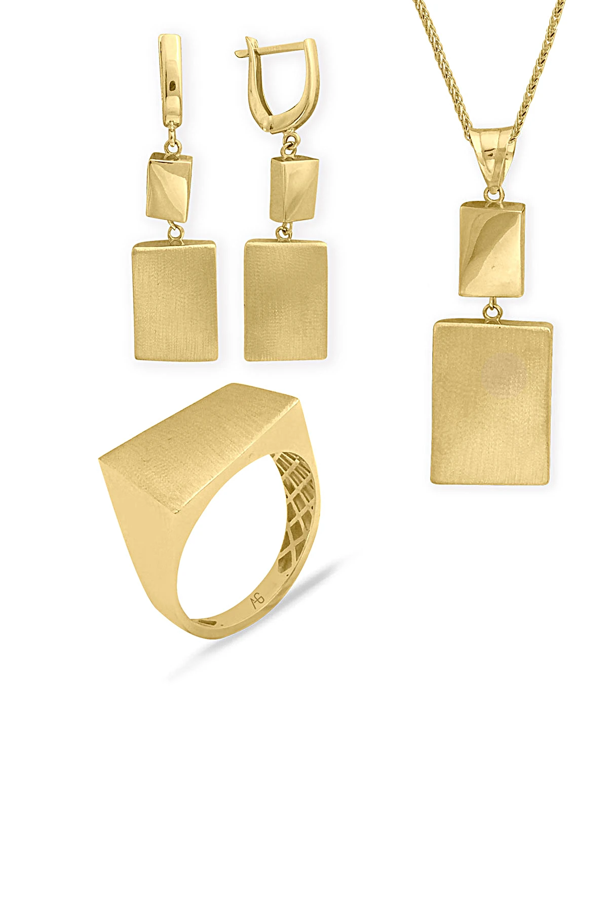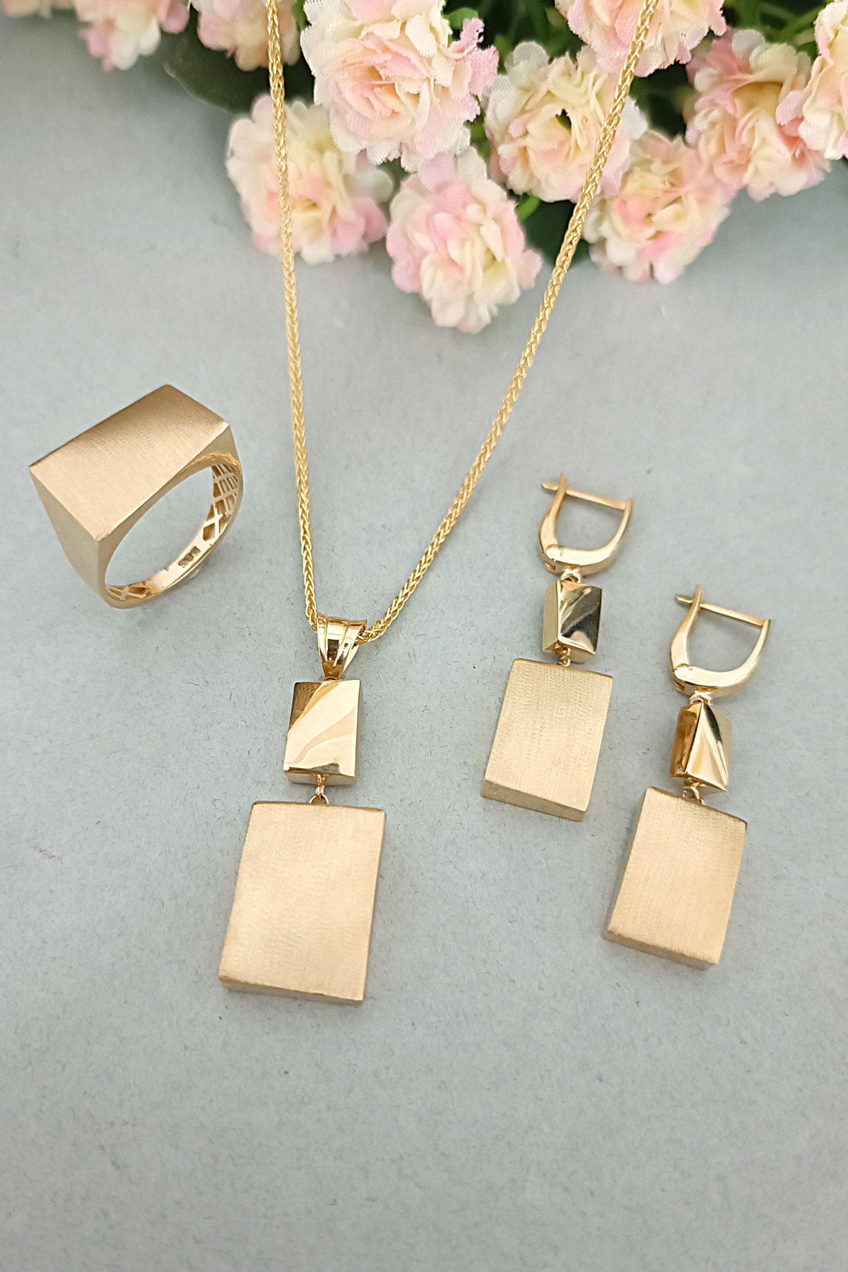 14 Ayar gösterişli ve şık tasarımı ile modern ışıl ışıl duruşa da sahip günlük kullanıma uygun 12.50 gram ağırlığında taşsız dikdörtgen tasarım altın füzyon üçlü takım.