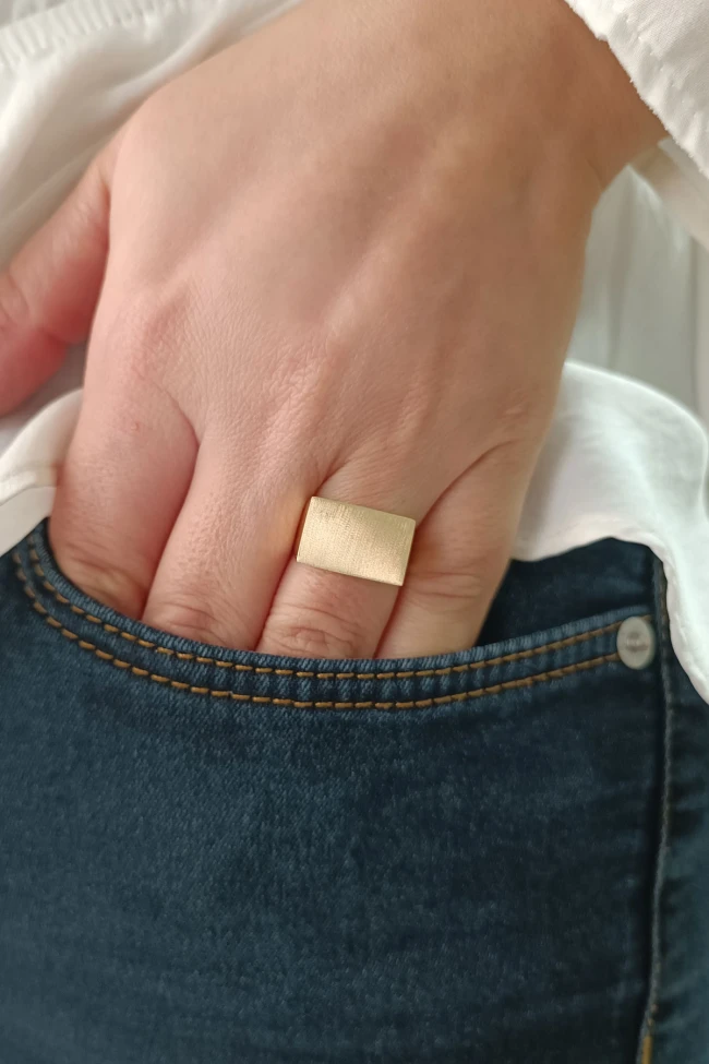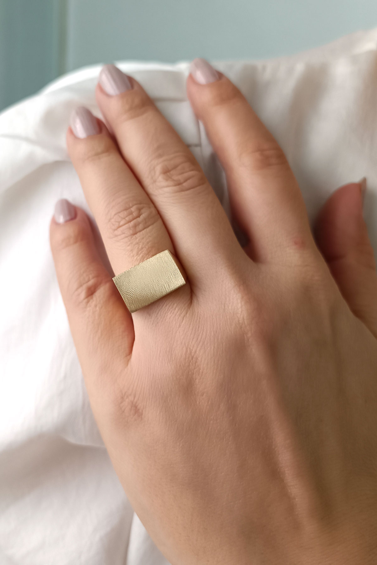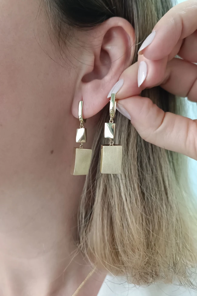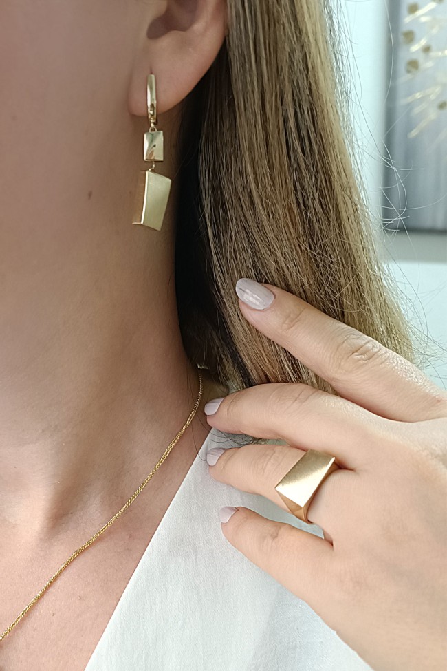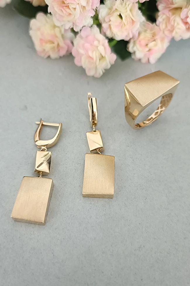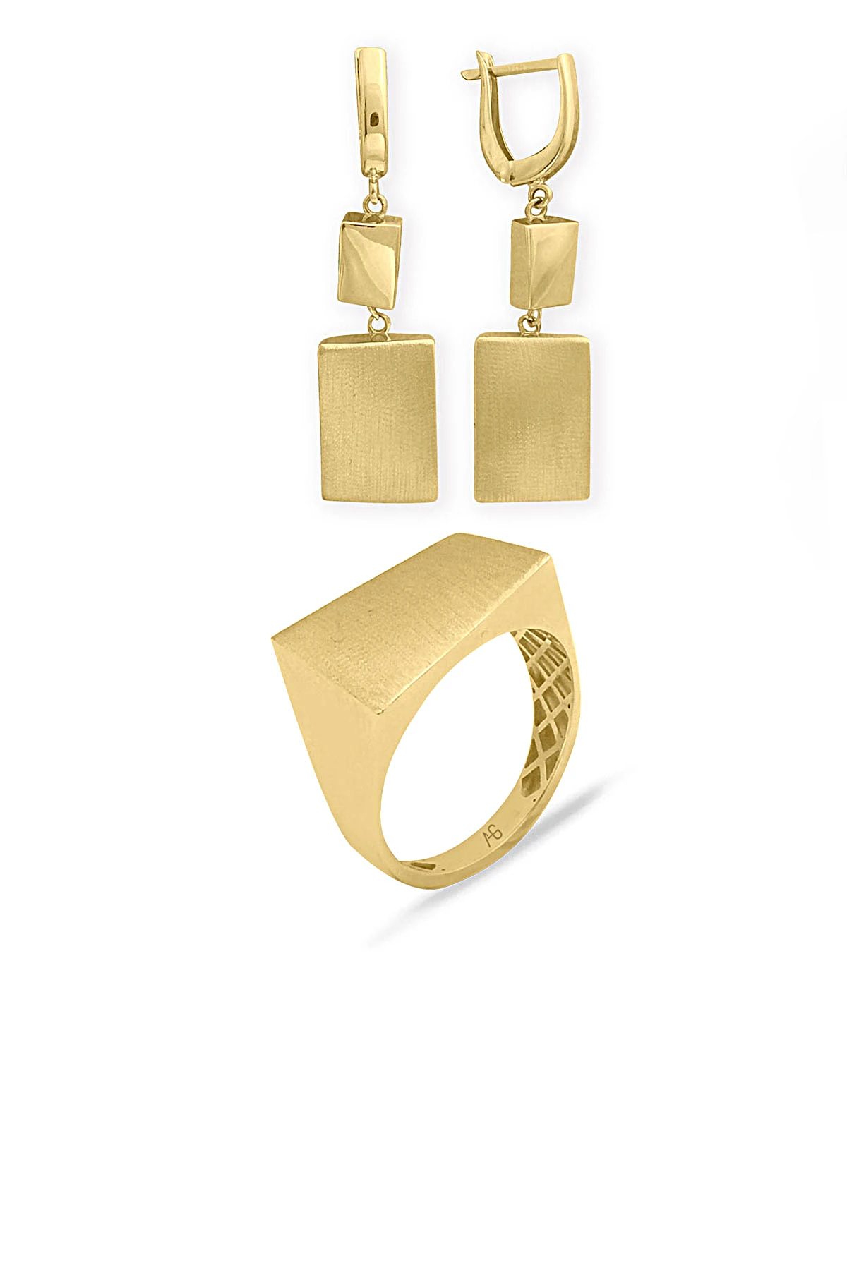 14 Ayar gösterişli ve şık tasarımı ile modern ışıl ışıl duruşa da sahip günlük kullanıma uygun 7.90 gram ağırlığında taşsız dikdörtgen tasarım altın füzyon yüzük küpe takım.