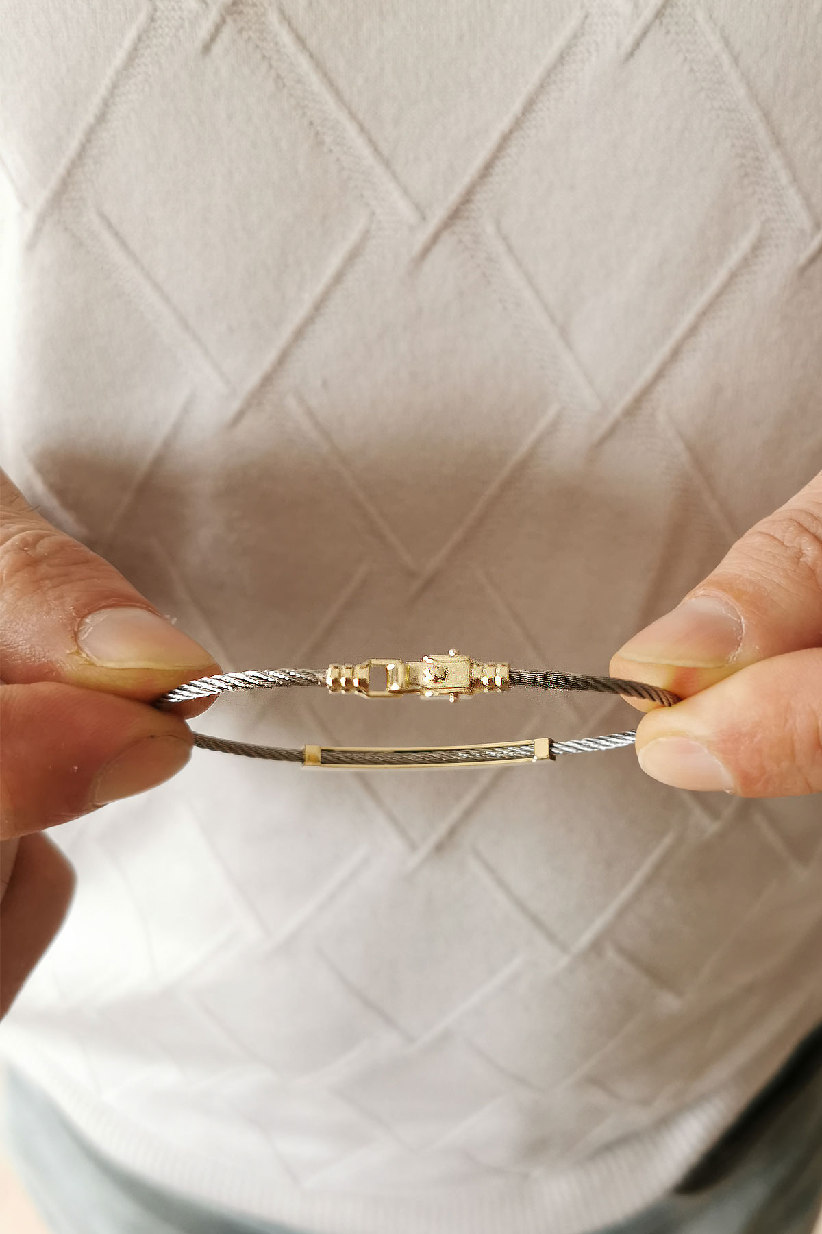 Modeldeki üst ve kilit parçalar 14 ayar altındır 4.60 gramdır, ortalama 7.50 gram çelik ağırlığı mevcuttur, kararma yapmaz uzun ömürlü kullanım için deniz ve havuz suyuna sokmamanızı öneririz.