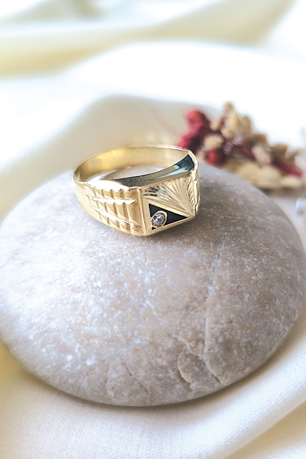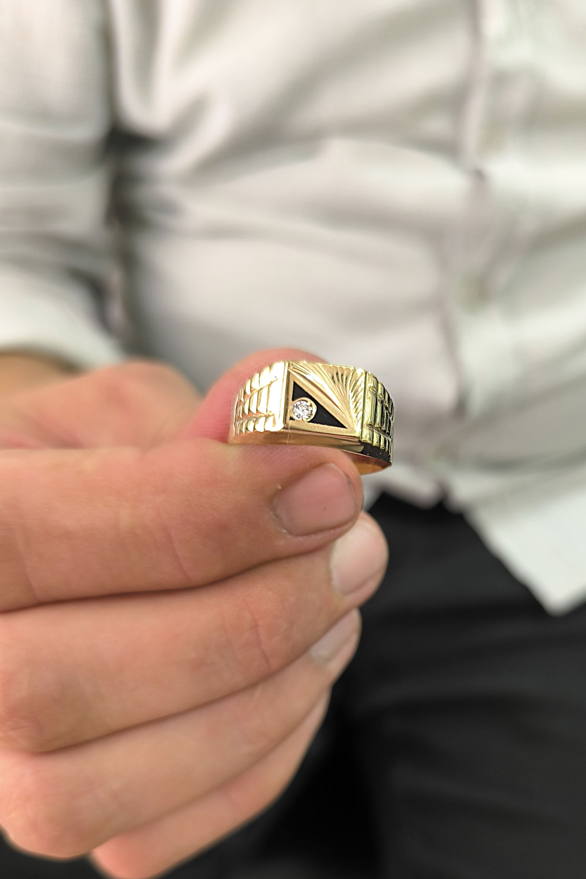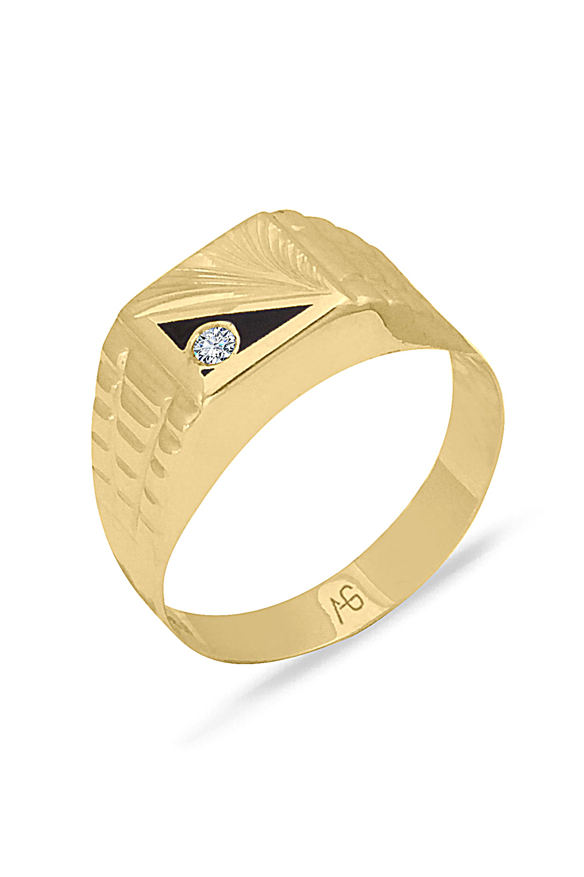 3.80 Gr. ağırlığında sarı altın özel kalem işlemeli köşegen formlu mine ve tektaş detaylı şık bir modele sahip taşsız 14 ayar altın erkek yüzük.