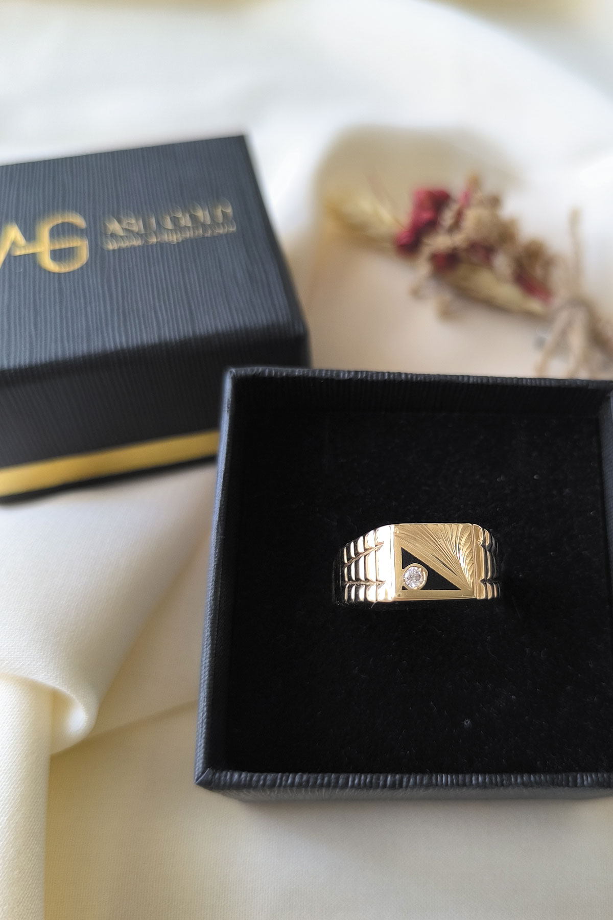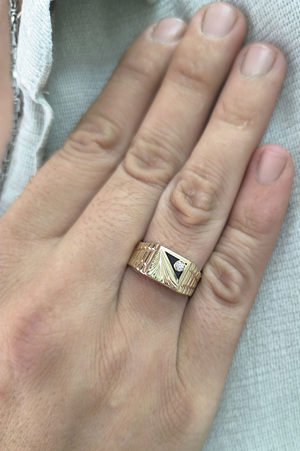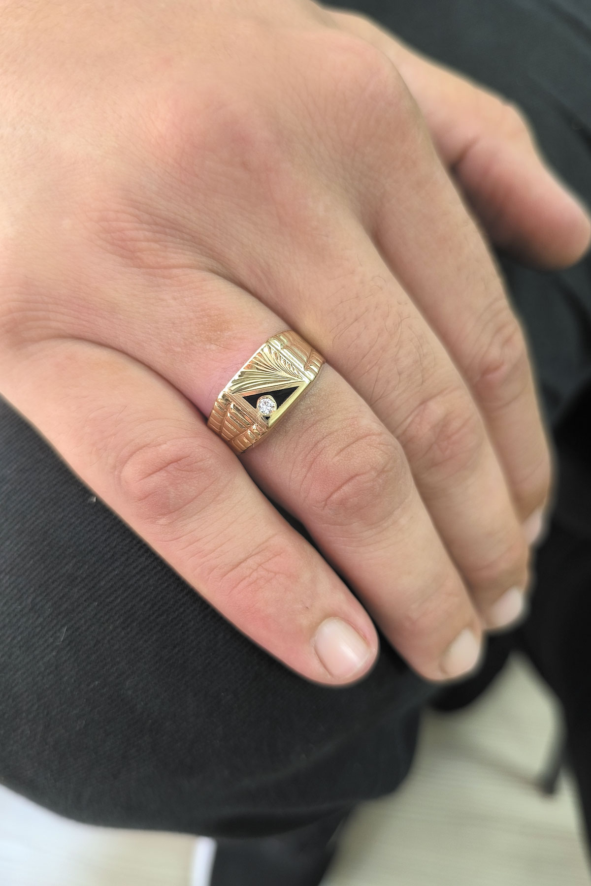 3.80 Gr. ağırlığında sarı altın özel kalem işlemeli köşegen formlu mine ve tektaş detaylı şık bir modele sahip taşsız 14 ayar altın erkek yüzük.