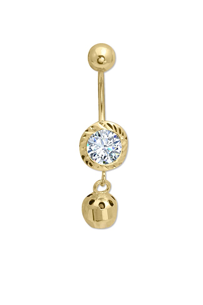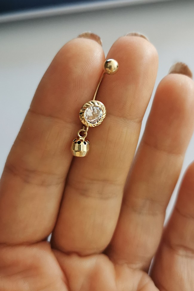 Tek Taşlı Sallantılı Top Parçalı Gösterişli Modeliyle Şık Bir Duruşa Sahip 14 Ayar Altın Göbek Piercingi.