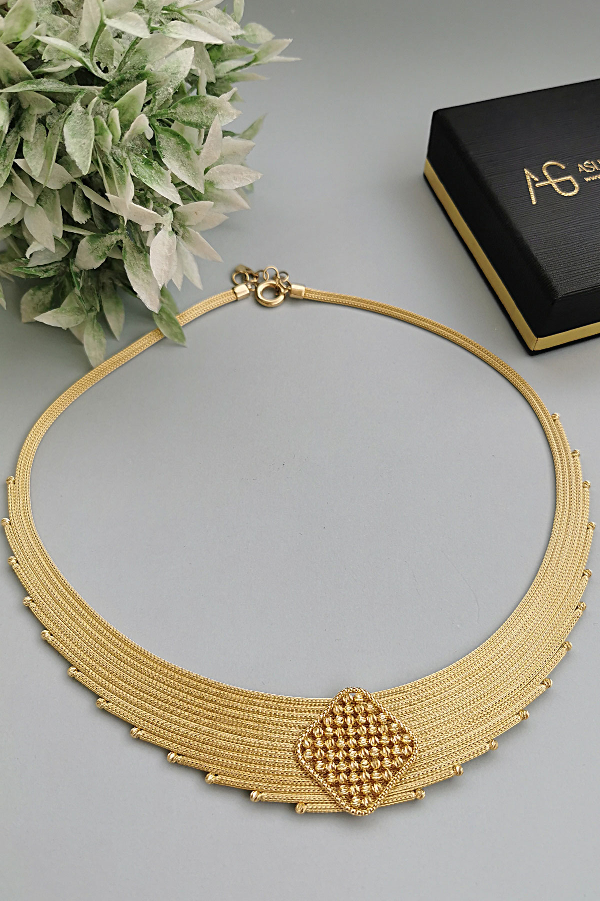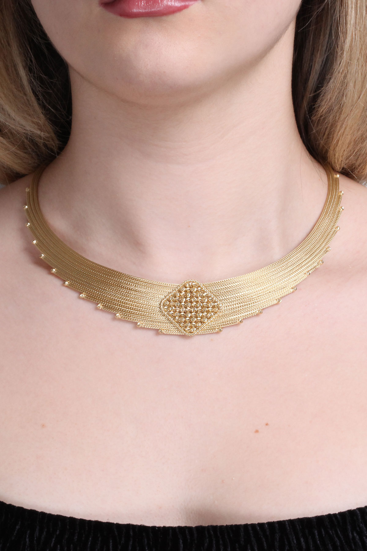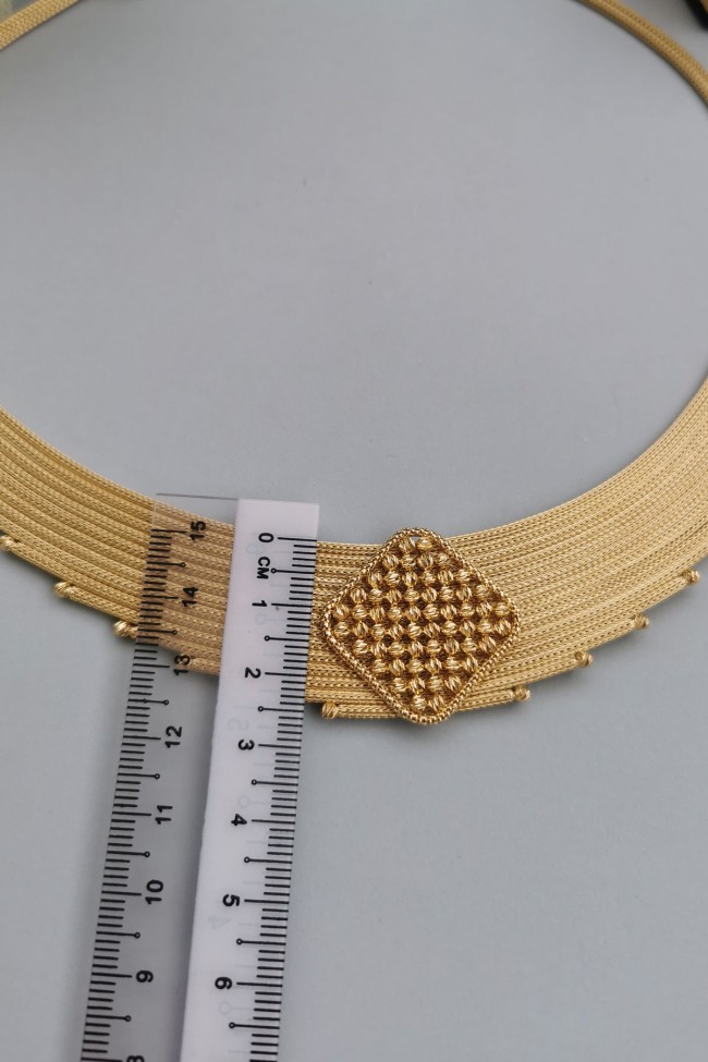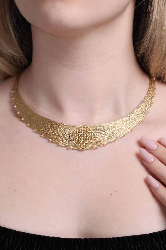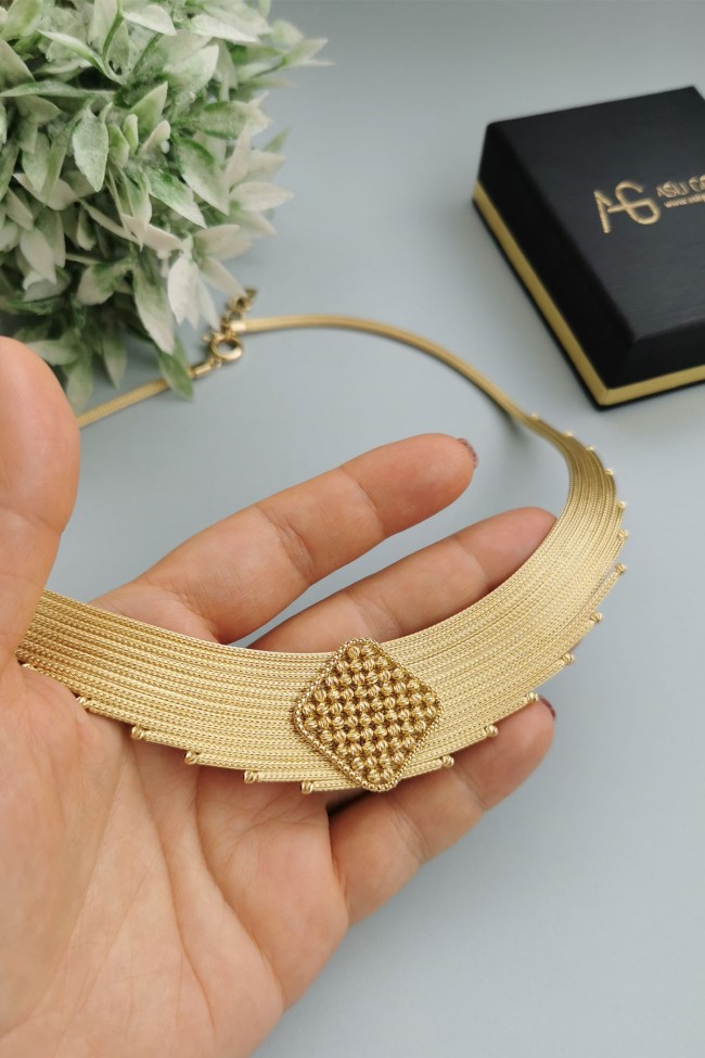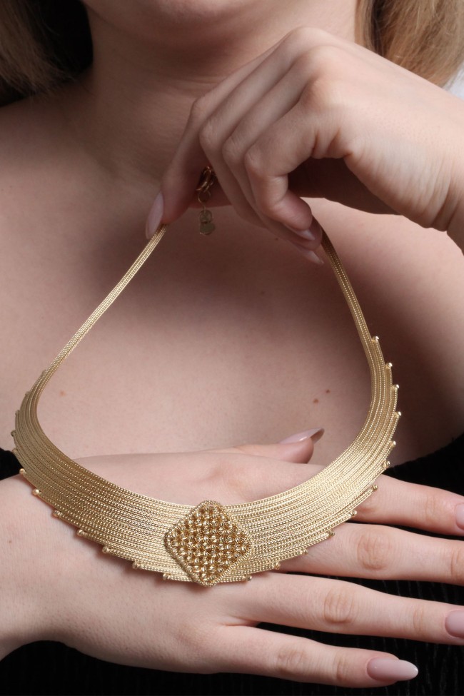 14 Ayar hafif, şık ve havalı tasarım taşsız ışıl ışıl orta dorika top tokalı ara parçası ile oldukça iddialı bir model 33.50 gram ağırlığında altın trabzon işi kadın gerdanlık.