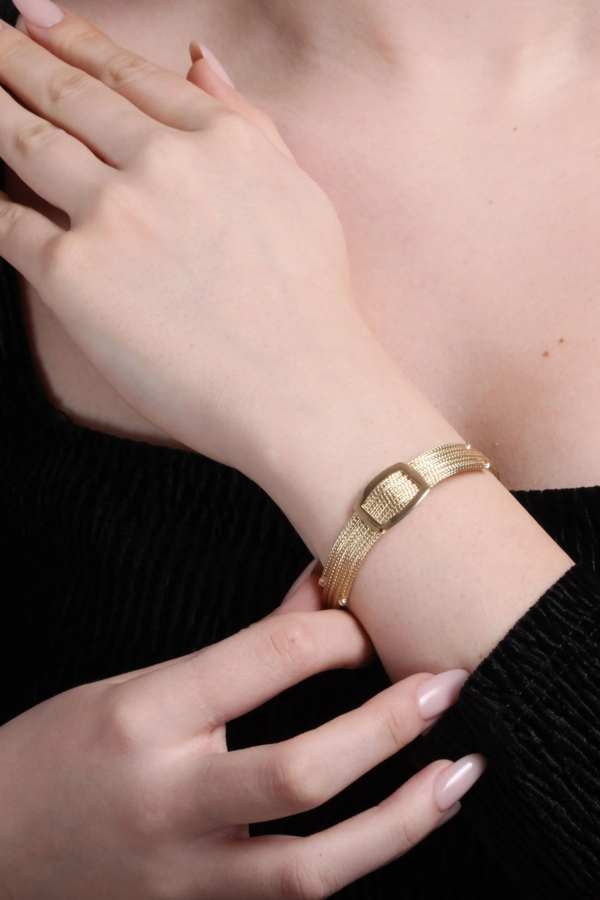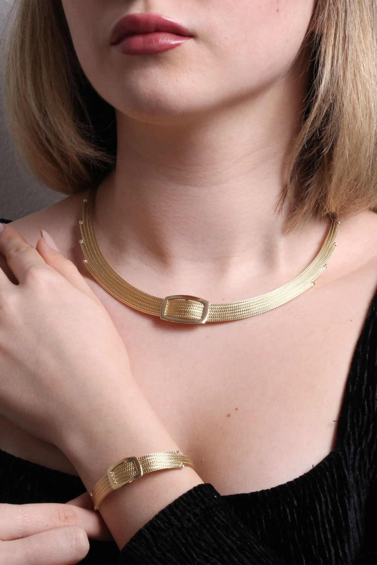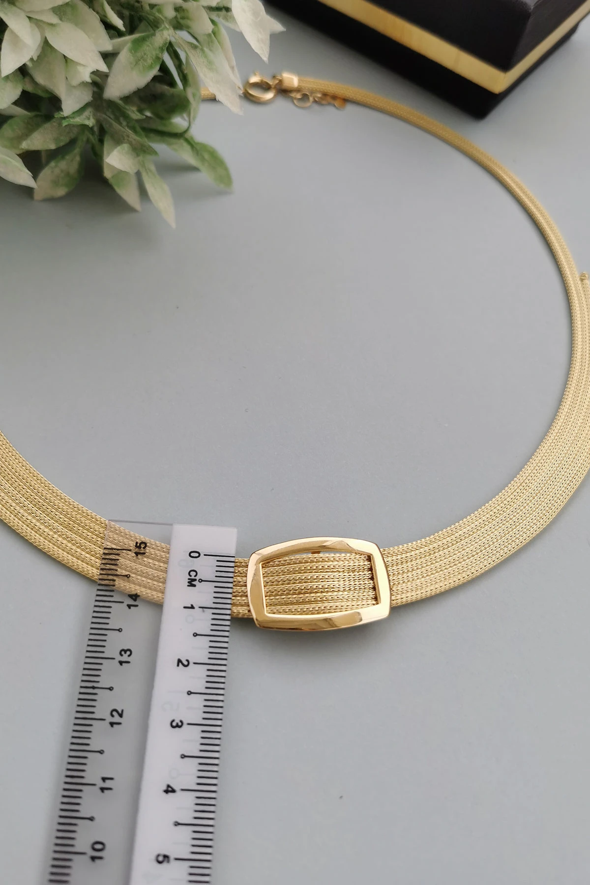 14 Ayar hafif, modern ve havalı tasarım günlük kullanıma uygun taşsız ışıl ışıl tokalı ara parçası ile oldukça iddialı bir model 33.30 gram ağırlığında altın trabzon işi kadın gerdanlık takı seti.