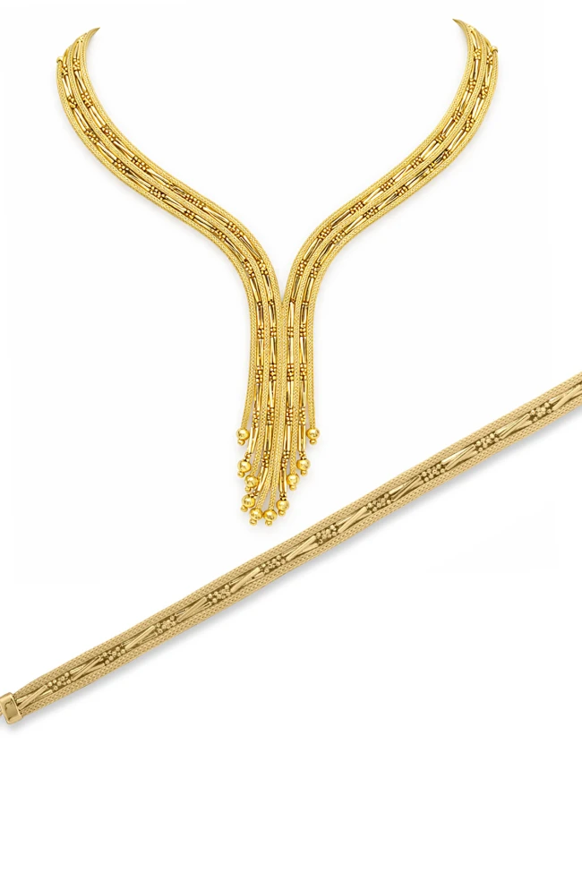 14 Ayar Trabzon İşi Kalze Zincirden Oluşan Işıl Işıl Püsküllü Model Taşsız Altın Gerdanlık Bileklik Takı Seti.