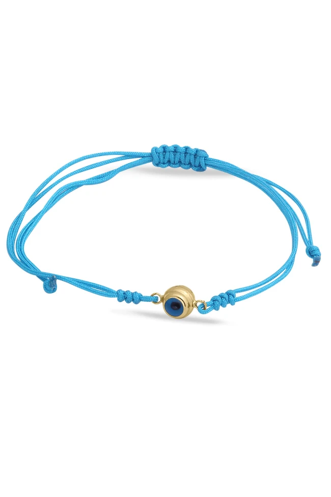 Turkuaz rengi ip tasarımı ile günlük olarak saatlerinizle yada tek olarak kullanabileceğiniz sevdiklerinize doğum günü hediyesi olarak da armağan edebileceğiniz 14 ayar 0.50 gr ağırlığında 14 ayar altın nazar bileklik.