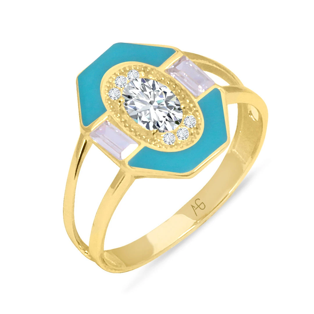 14 Ayar 2.15 gram ağırlığında kenar detayları turkuaz mineli tasarımıyla dikkat çekici şık ışıl ışıl zirkon baget taşlı altın yüzük.